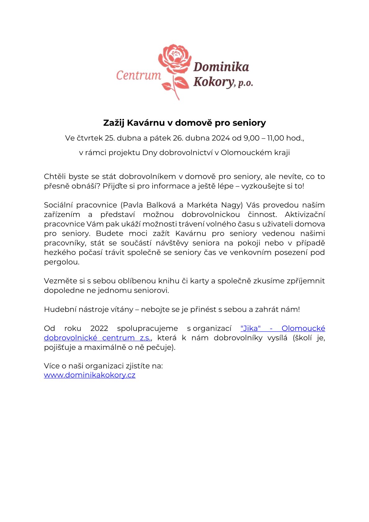 "Jika" - Olomoucké dobrovolnické centrum z.s., která k nám dobrovolníky vysílá (školí je, pojišťuje a maximálně o ně pečuje).