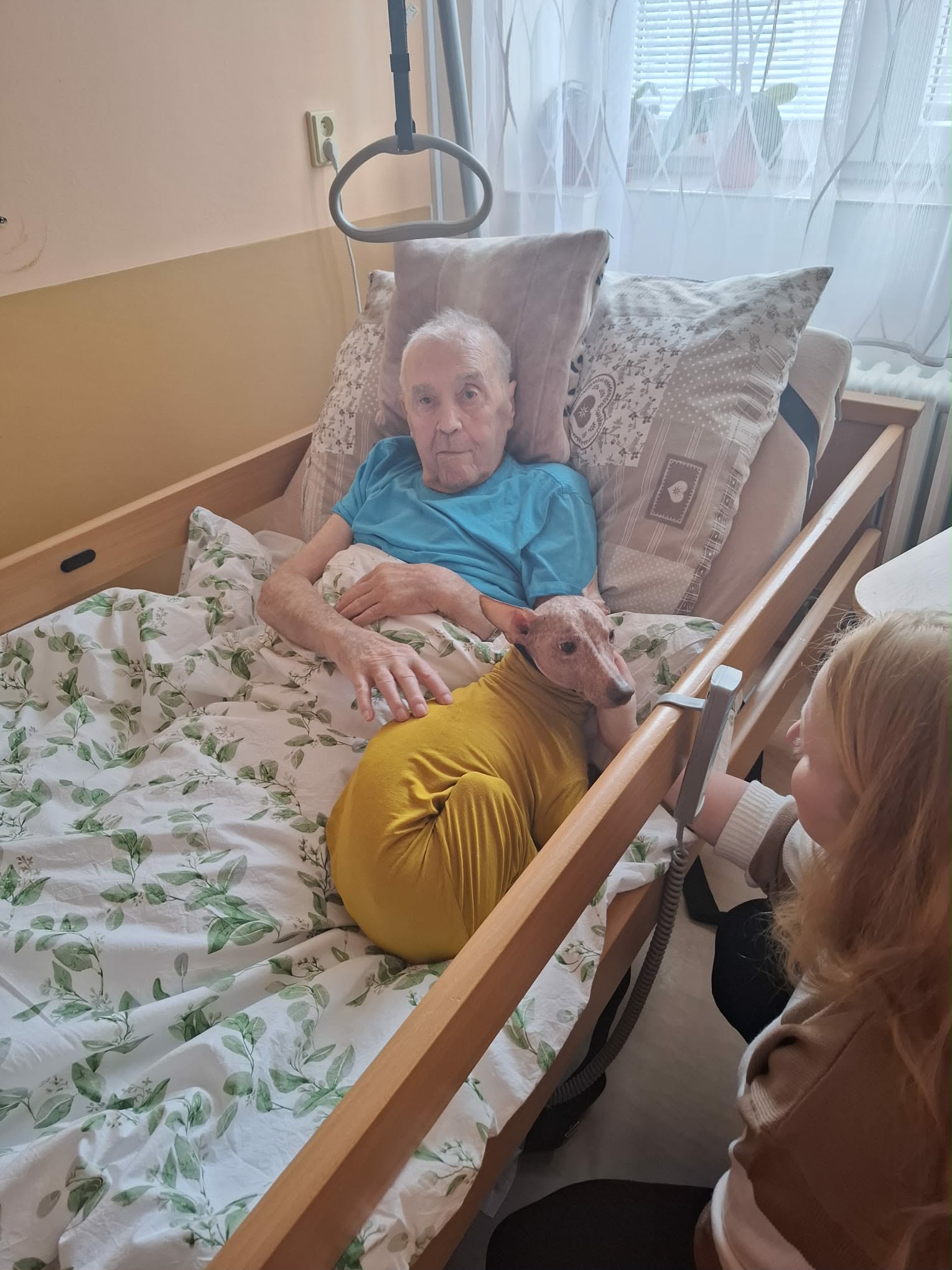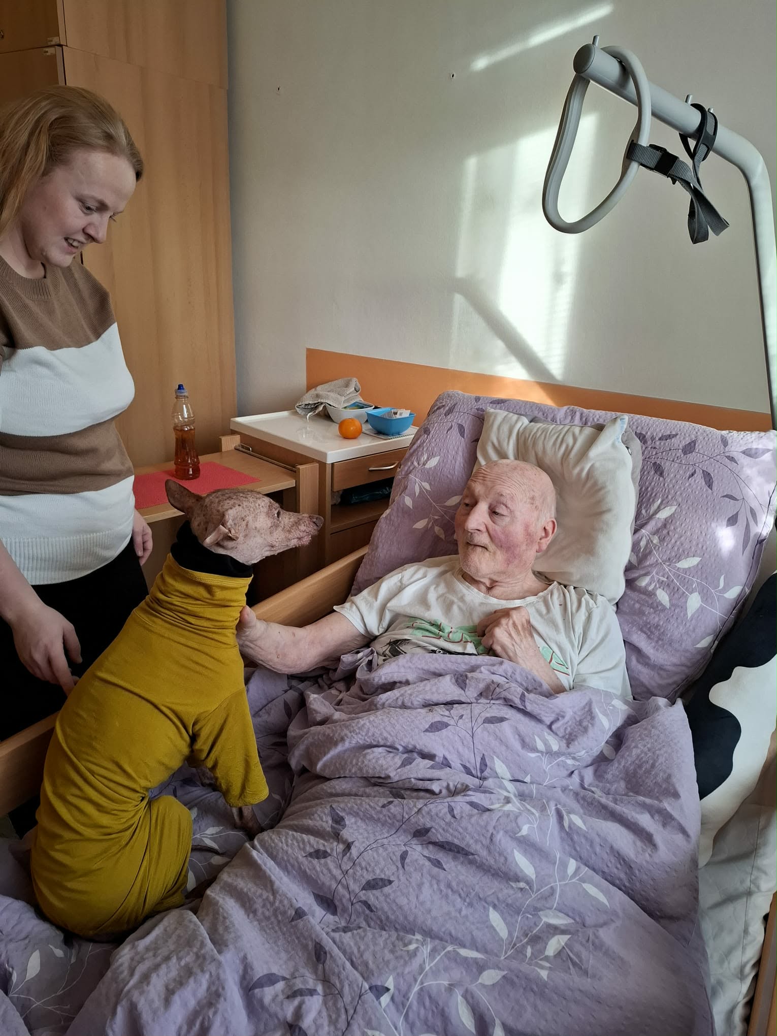 Hned na začátku nového roku nás navštívil pejsek Lamínek a přinesl s sebou přesně to, co jsme po svátcích nejvíc potřebovali: klid, radost a blízkost. Lamínek postupně navštívil pokoje našich seniorů. Ti, kteří už většinu času tráví na lůžku, měli možnost být s ním v bezprostředním kontaktu – hladit ho, vnímat jeho teplo, jemné pohyby i tichou přítomnost. Pro mnoho klientů to byl silný emoční zážitek, který přinesl úsměvy, uvolnění i vzpomínky. Kontakt se psem přirozeně podporuje zklidnění, navozuje pocit bezpečí a stimuluje smysly. U některých klientů jsme pozorovali zvýšený zájem o okolí, snazší navázání očního kontaktu a spontánní reakce, které se v běžném dni objevují jen zřídka. Lamínek byl po celou dobu klidný, trpělivý a vnímavý ke každému, koho navštívil. I krátké setkání dokázalo přinést výraznou změnu atmosféry – pokoje se zaplnily úsměvy, tichými rozhovory i pohlazením.