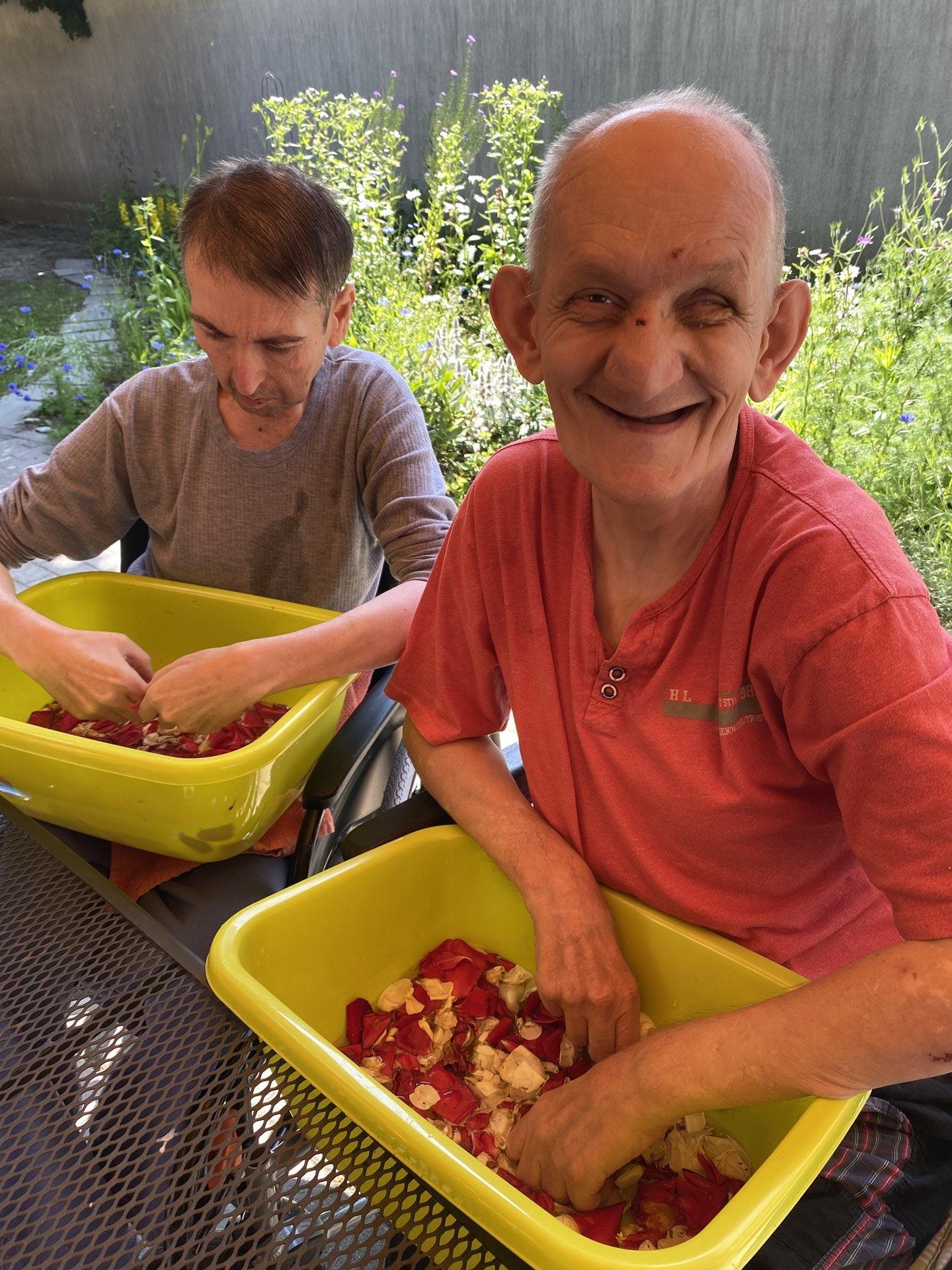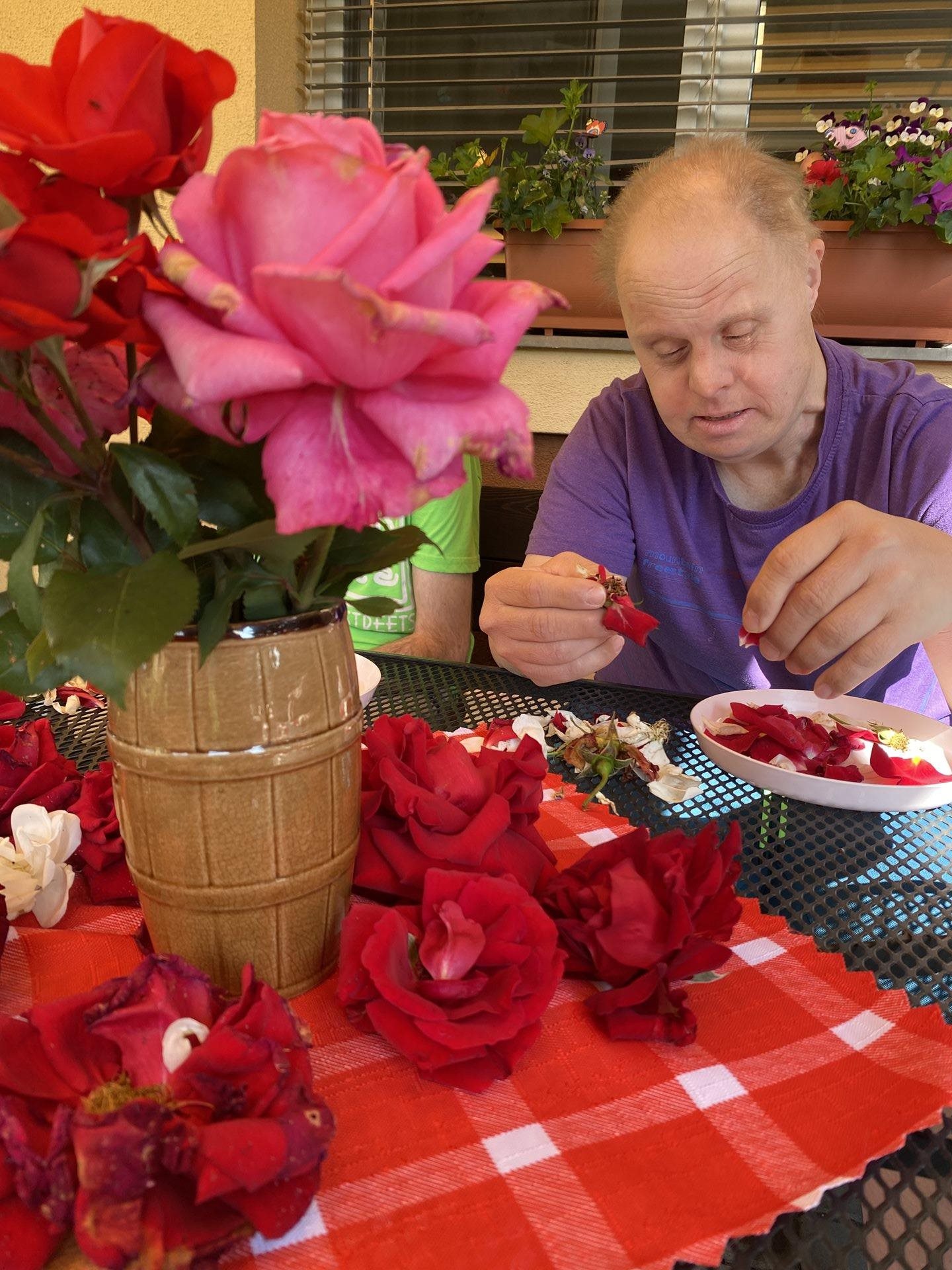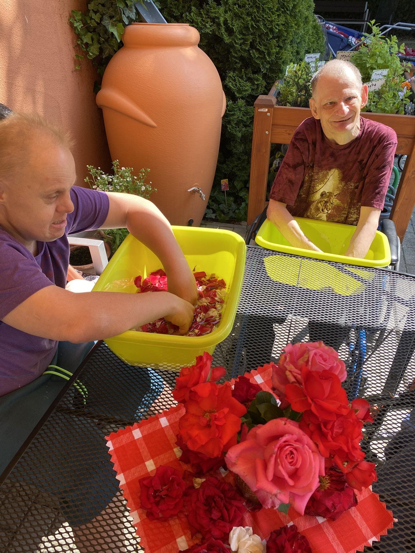 My jsme si natrhali okvětní lístky růží, vložili jsme je do teplé lázně a nechali relaxovat naše ruce. Po voňavé koupeli jsme si ruce promasírovali a promazali a zbylé okvětní lístky jsme nechali usušit. Těšíme se na voňavý čaj a studenou limonádu.