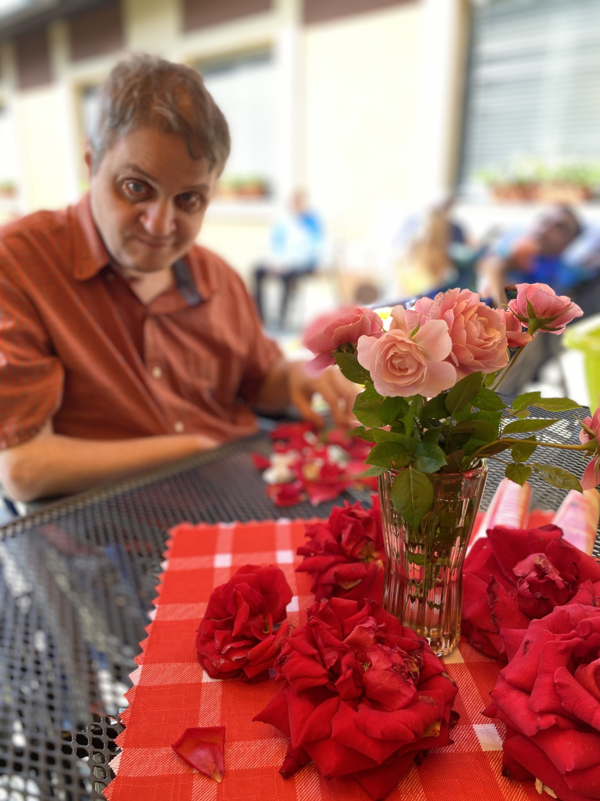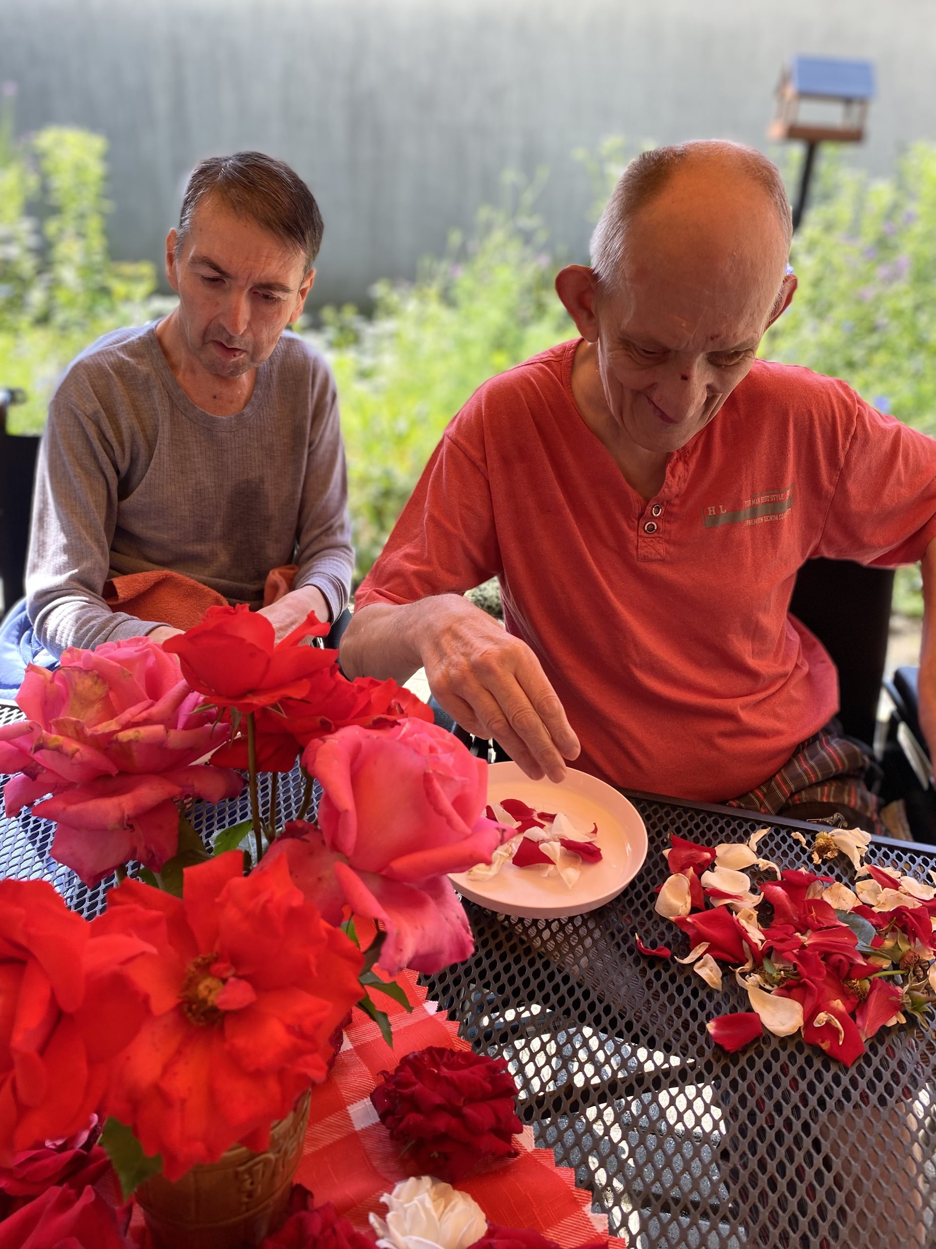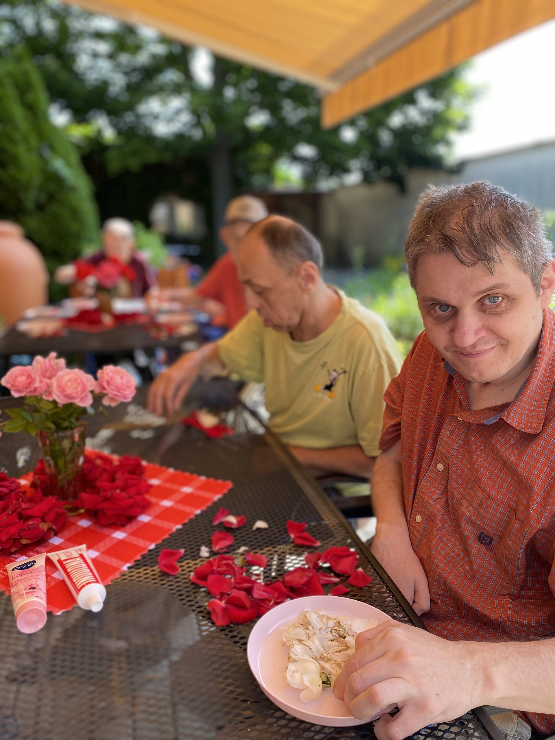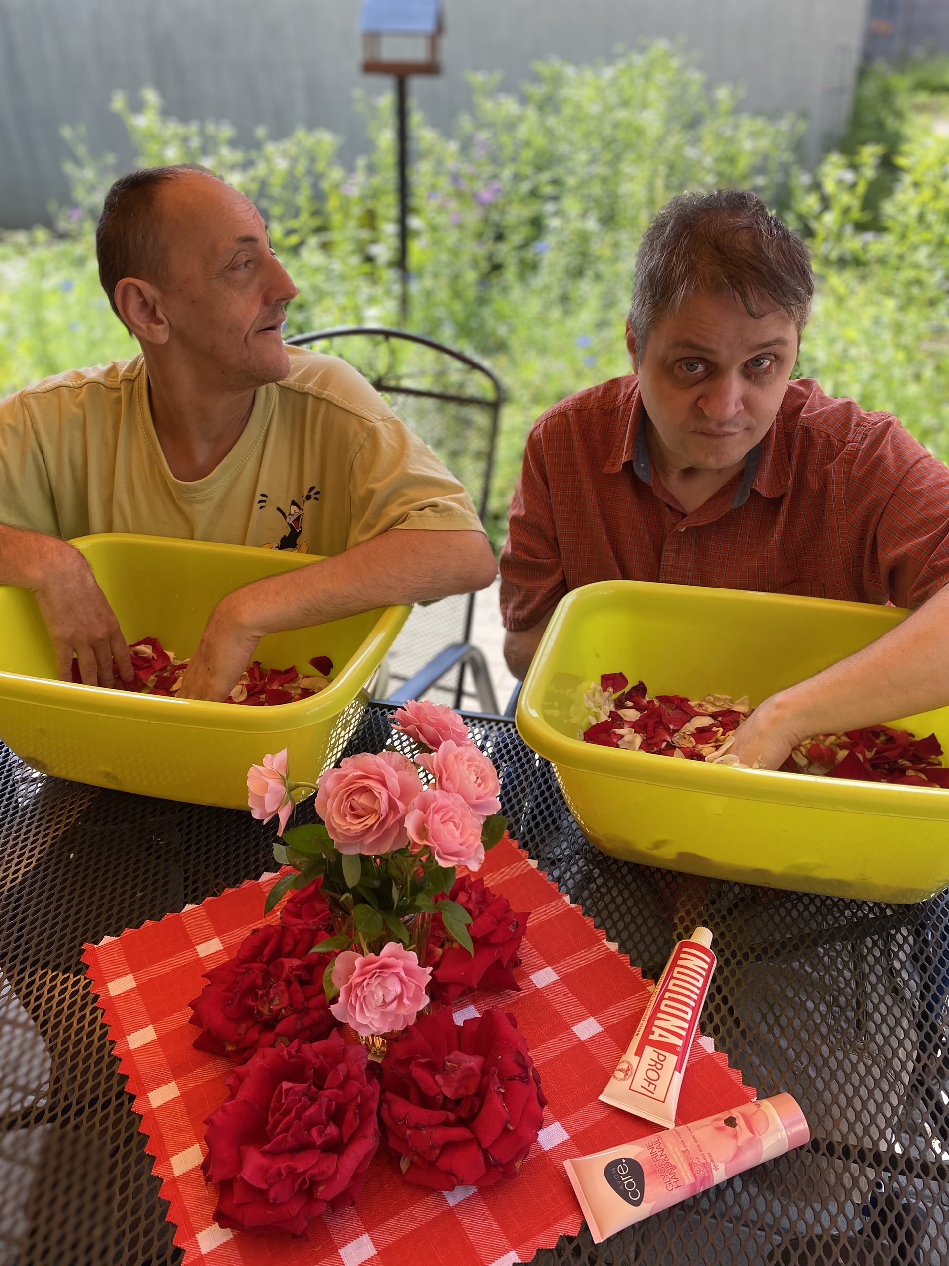 My jsme si natrhali okvětní lístky růží, vložili jsme je do teplé lázně a nechali relaxovat naše ruce. Po voňavé koupeli jsme si ruce promasírovali a promazali a zbylé okvětní lístky jsme nechali usušit. Těšíme se na voňavý čaj a studenou limonádu.