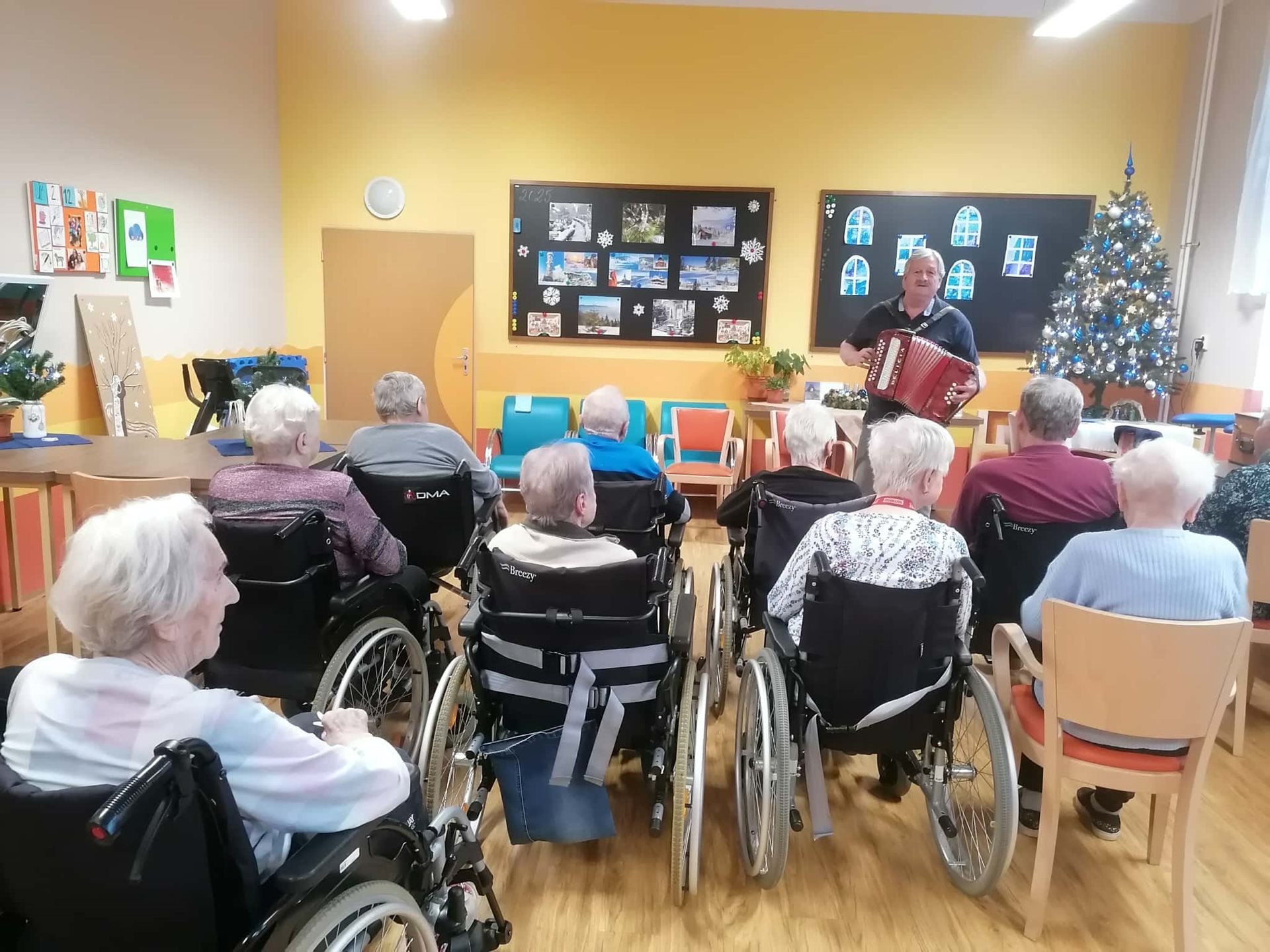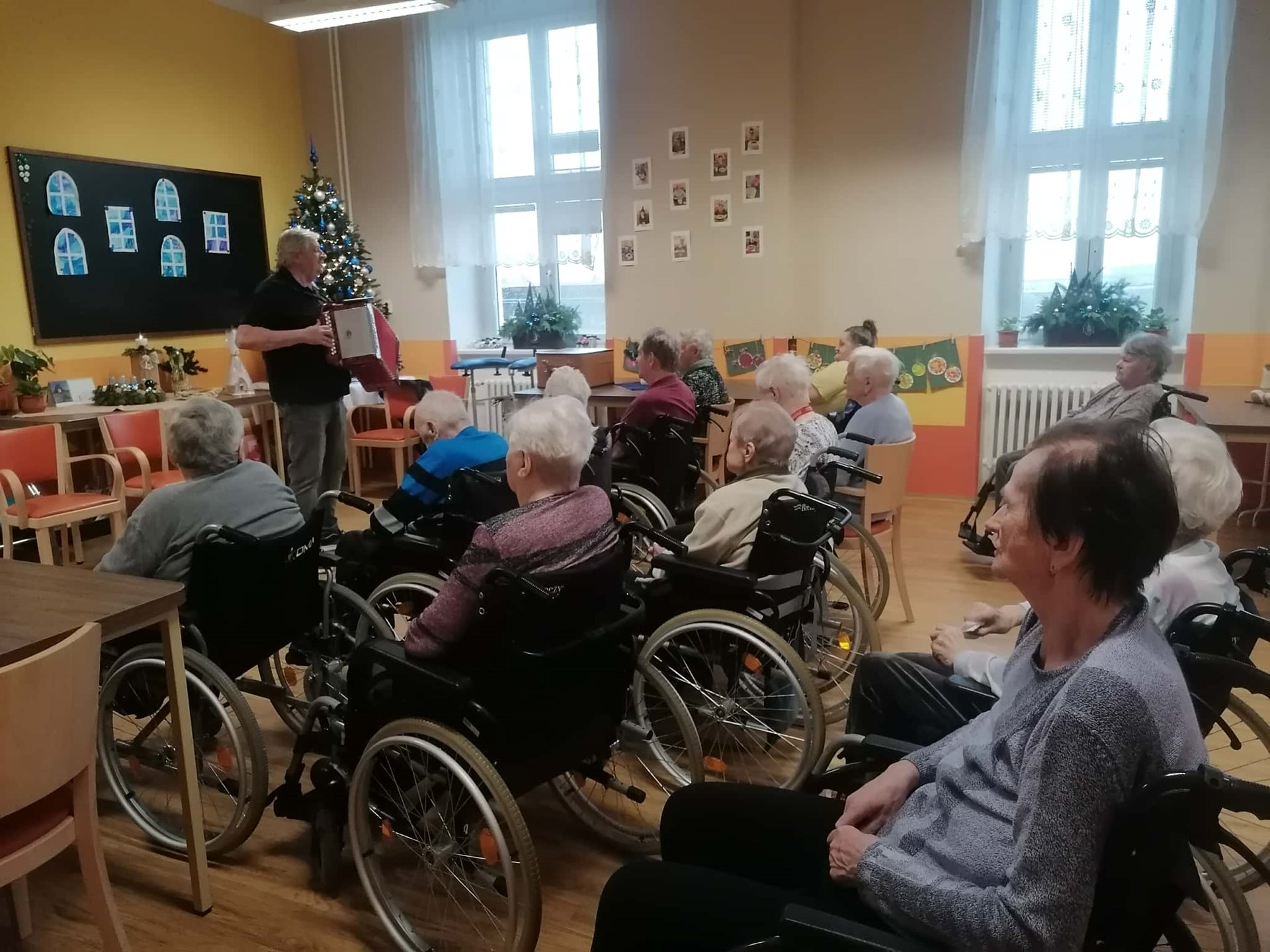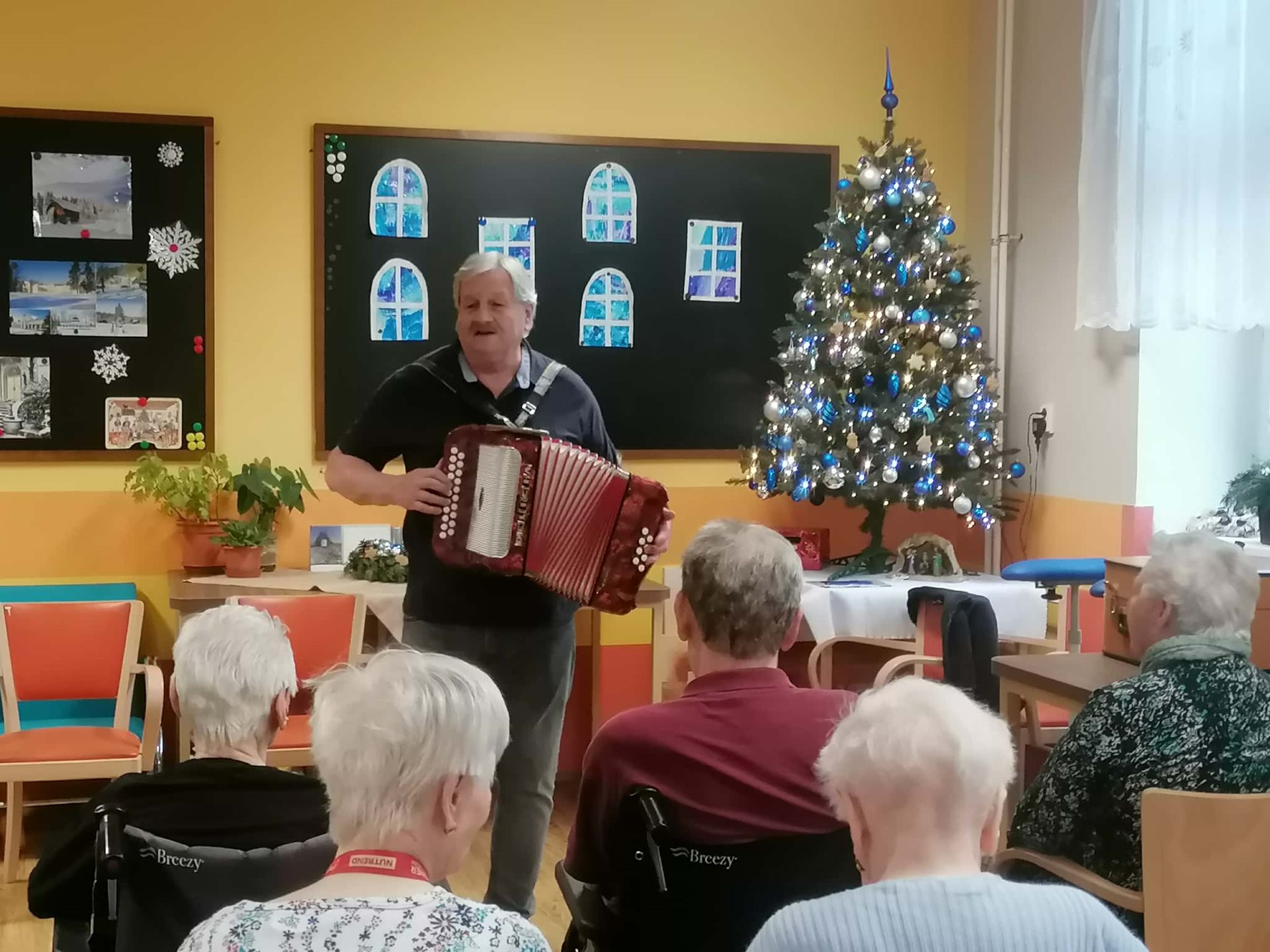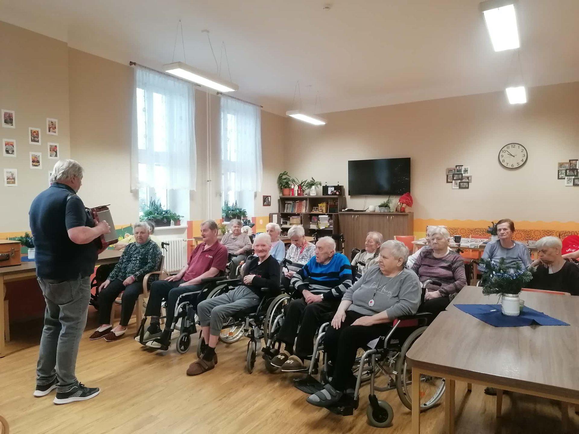 Známé lidové písně v podání harmonikáře pana Rostislava Frantíka dnes dopoledne rozezpívaly naše klienty i pracovníky. Děkujeme za krásné vystoupení.
