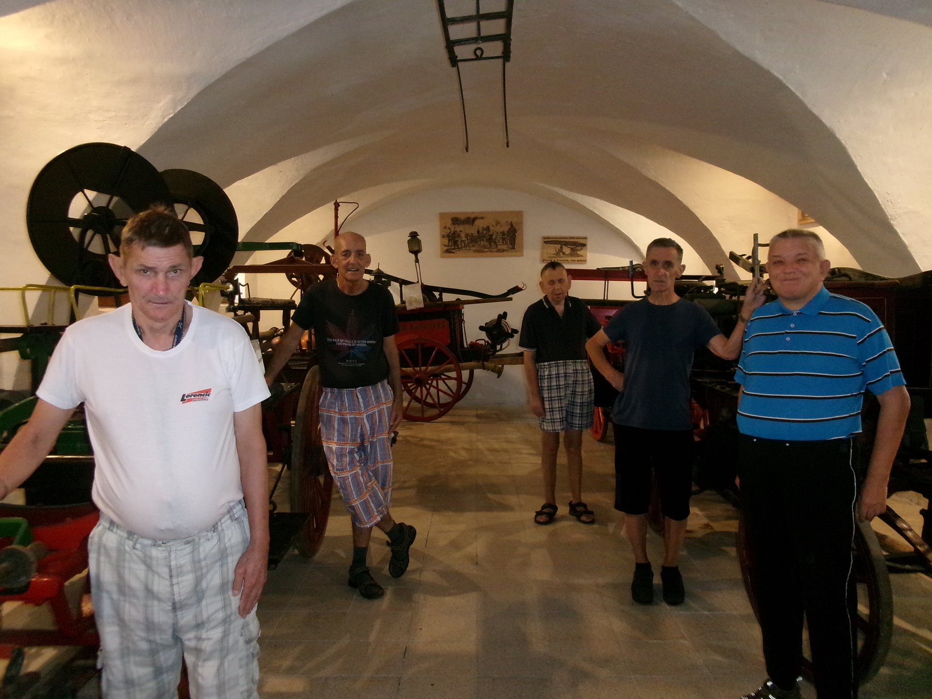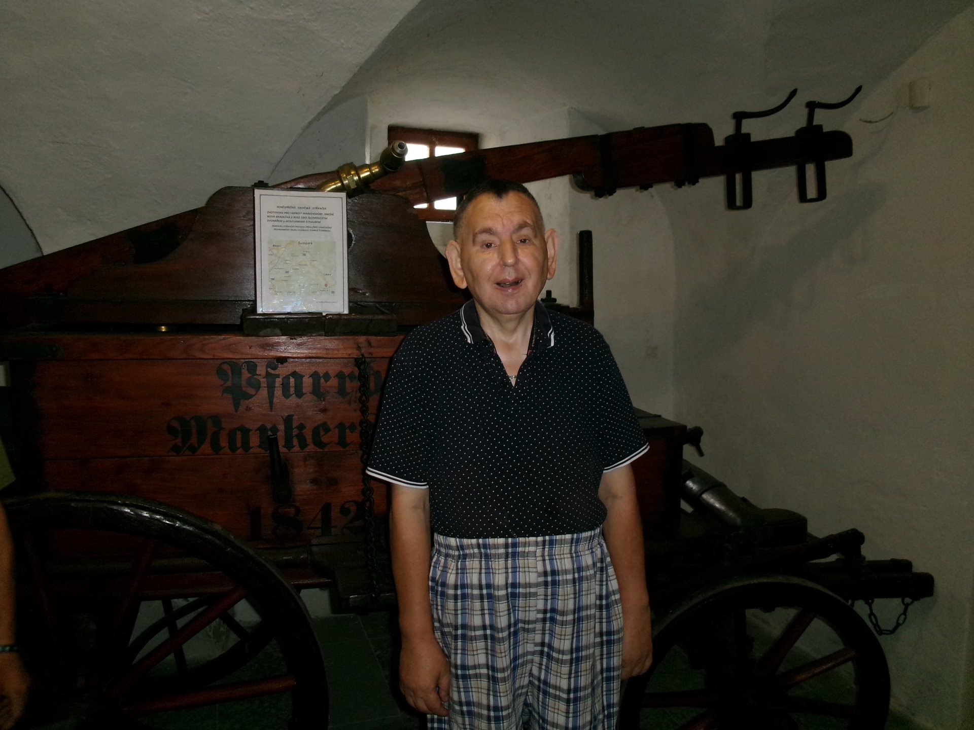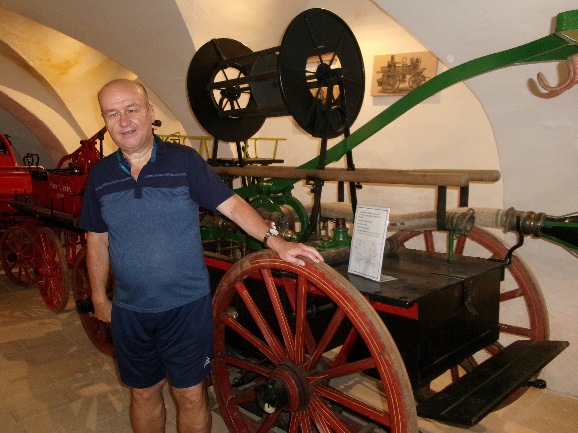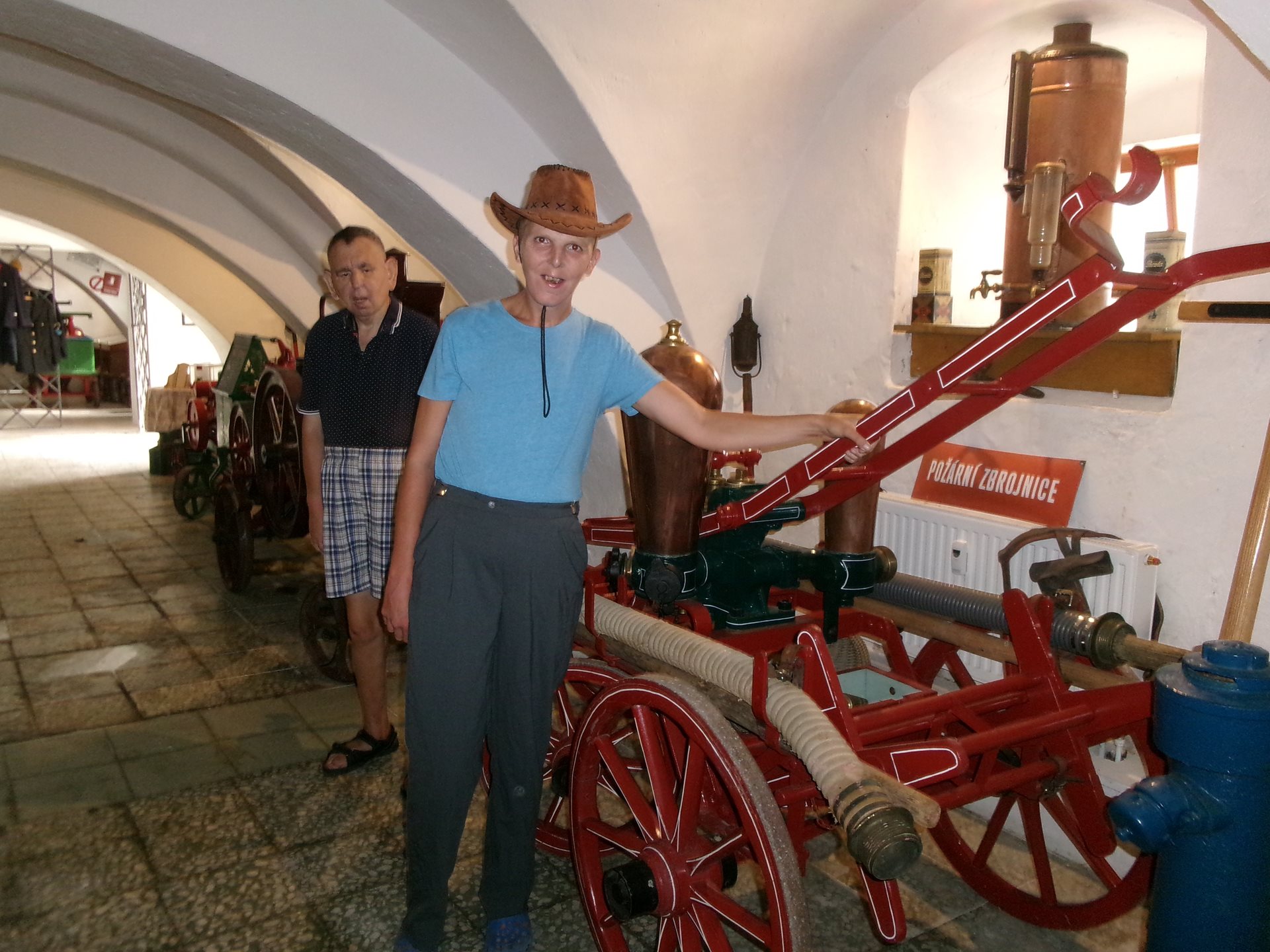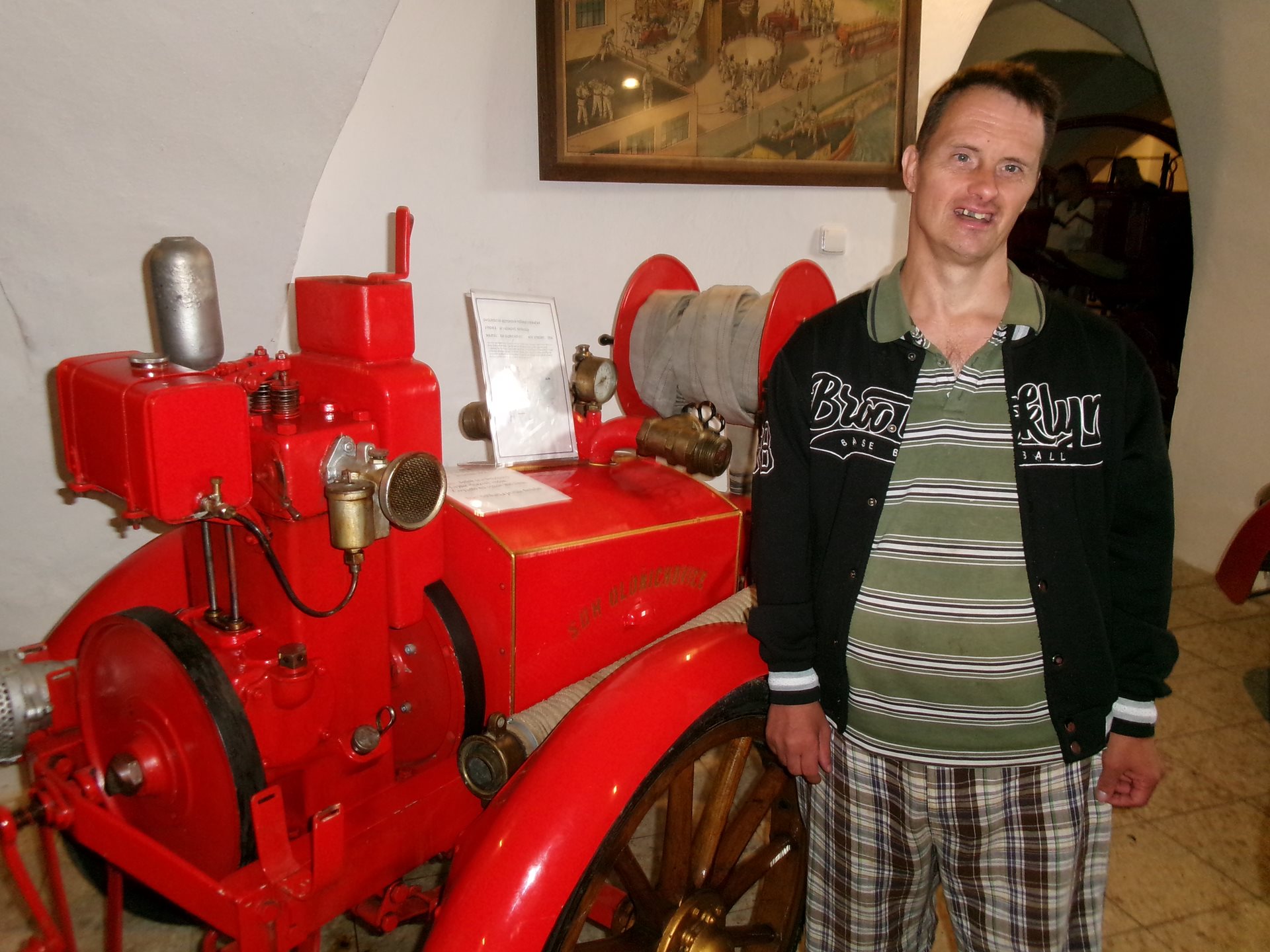 Při poslední návštěvě našeho dřevohostického zámku jsme se nechali zlákat na další expozici, jejíž shlédnutí jsme zrealizovali dnes. Byla to expozice unikátního Hasičského muzea v předzámčí zámku. Prohlédli jsme si zde vystavené historické dokumenty, dvoukolé a přenosné hasičské stříkačky a mnoho dalších historických hasičských předmětů. Slečna průvodkyně nám velmi poutavě povyprávěla, k čemu a jak se různé stroje používaly. Nejvíce nás zaujala historická koněspřežná stříkačka z roku 1842.