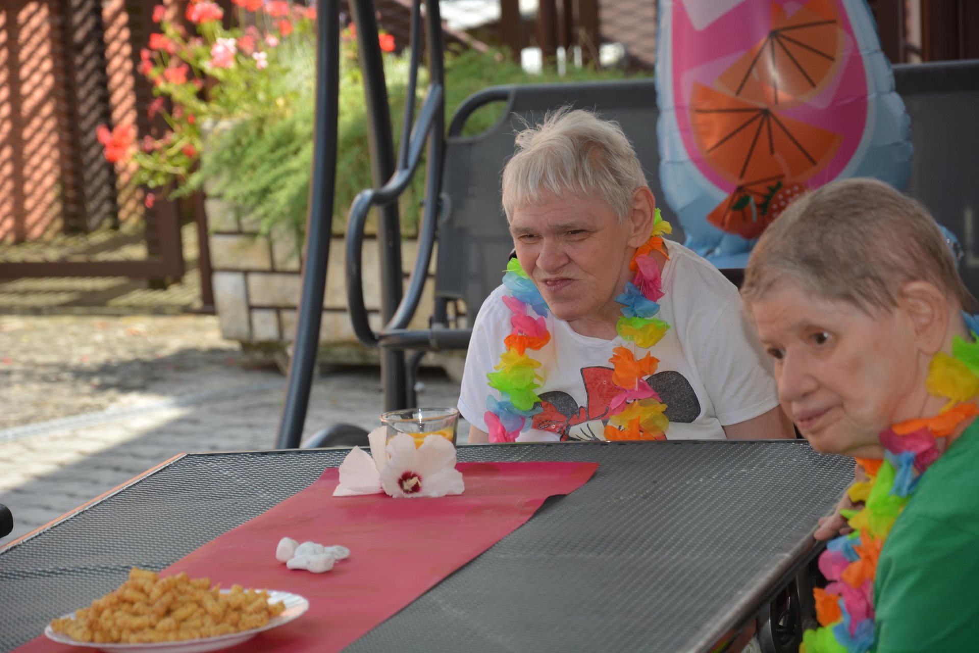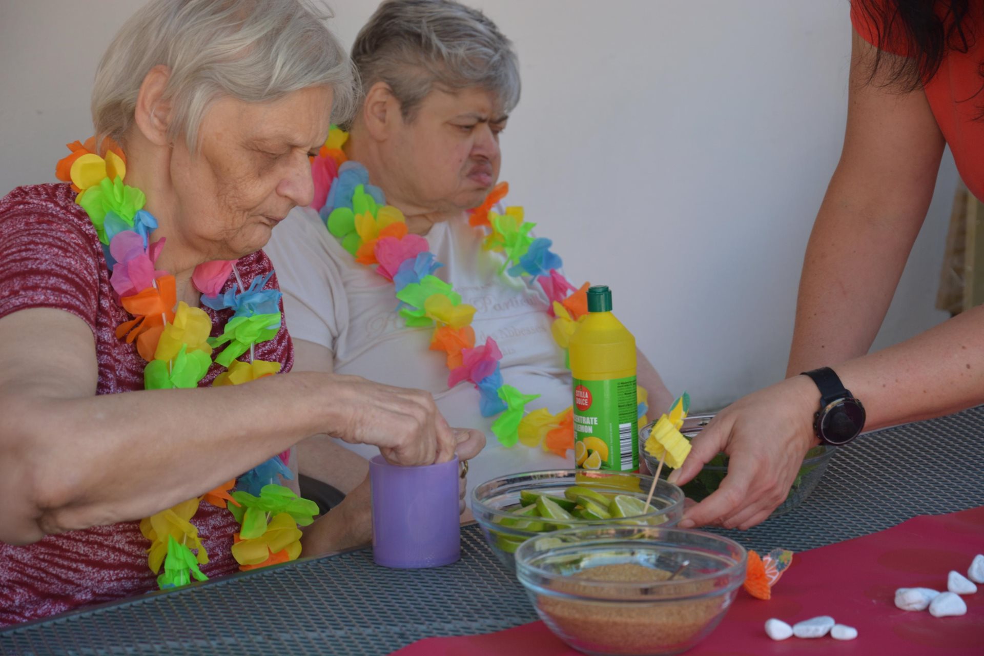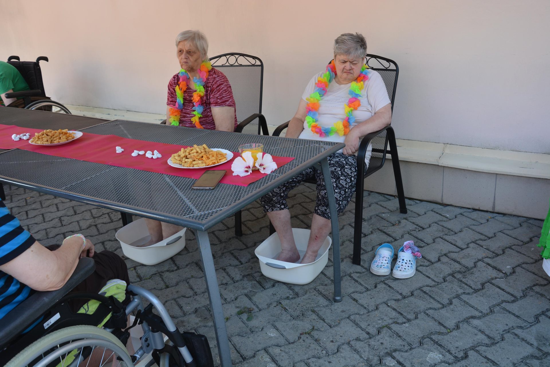 Dne 25. 7. 2024 proběhla v odpoledních hodinách v Centru Dominika Kokory nezapomenutelná Hawaii párty, která přinesla spoustu zábavy a osvěžení v horkých letních dnech. Akce byla určena pro klientky Domova pro osoby se zdravotním postižením a nabídla tak širokou škálu aktivit, které si všichni přítomní užili. Jednou z hlavních atrakcí byl fotokoutek, kde si klientky mohly pořídit tematické fotografie a zachytit tak vzpomínky na tuto veselou událost. Pro autentický zážitek byly k dispozici také vaničky s koupelovou solí, které společně z hawaiiskou hudbou evokovaly atmosféru na pláži přímo u moře. Akce by nebyla kompletní bez lahodného nápoje. Připravovalo se tropické Mojito, které si klientky sami s různou mírou pomoci a podpory vytvořily. Tento chutný a nádherně vonící drink z máty, která byla vypěstována na zahrádce domova, symbolizoval jejich úspěch a zapojení se do jeho přípravy. Kromě vychlazeného Mojita se podávaly také sladké melouny a drobné občerstvení, které zajistilo, že nikdo nezůstal hladový.