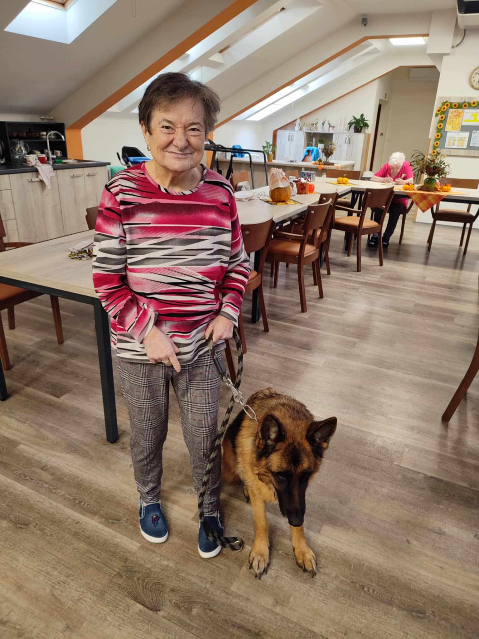 Dne 5. listopadu 2024 proběhla v dopoledních hodinách v Domově pro osoby se zdravotním postižením kontaktní terapie s panem Doškem a jeho třemi fenami německého ovčáka. Tyto fenky mají mimořádně klidnou povahu a díky své vyrovnané energii jsou využívány především k polohování, což je speciální forma terapie zaměřená na uvolnění a psychickou podporu klientů.