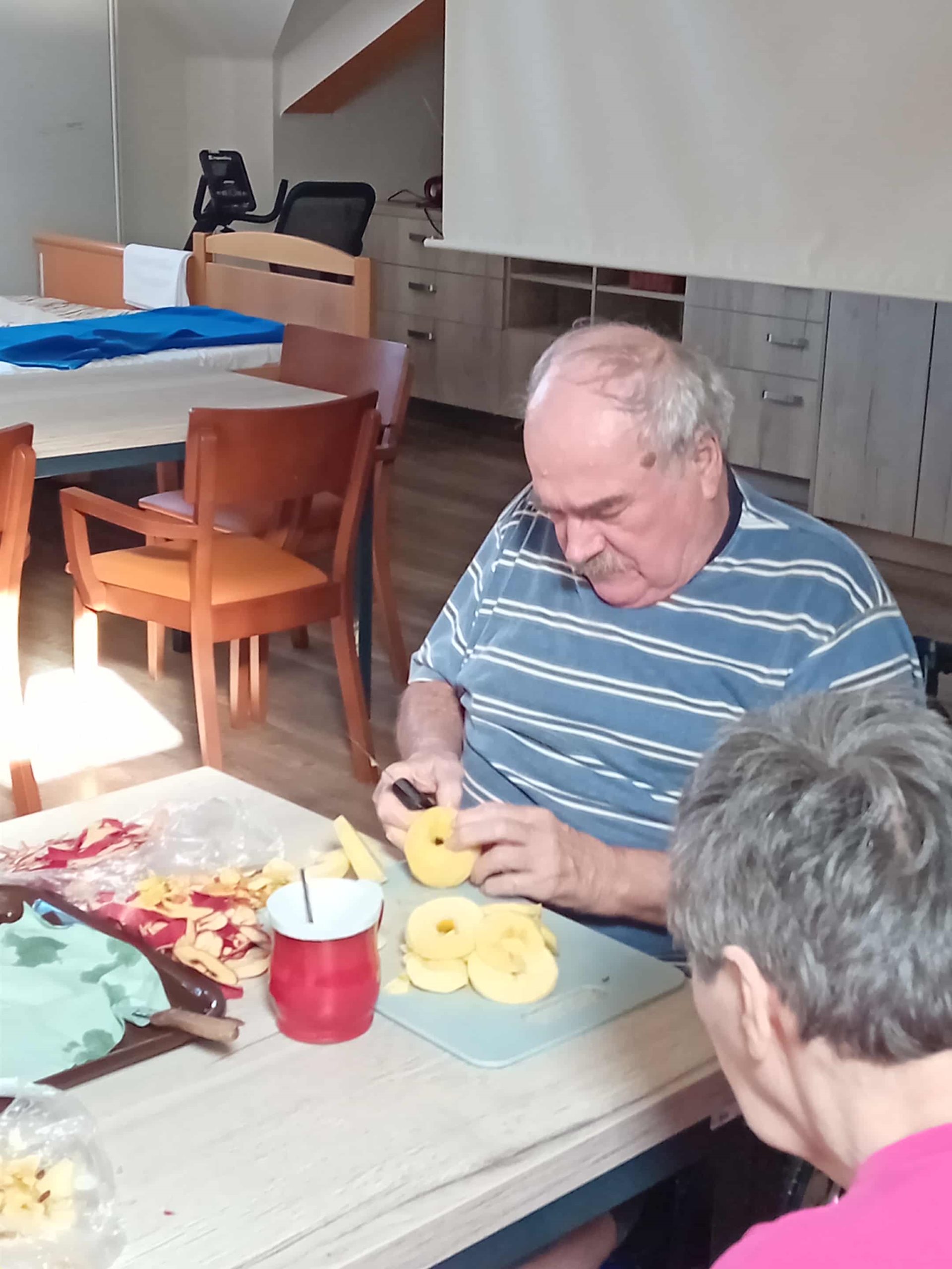 Dnes jsme si s našimi klienty zpestřili odpoledne voňavou podzimní aktivitou – společně jsme připravovali jablka v županu. Tato aktivita nejen krásně provoněla celé patro, ale zároveň byla skvělou příležitostí k rozvoji jemné motoriky, spolupráci a společně strávenému času u práce i posezení u stolu.