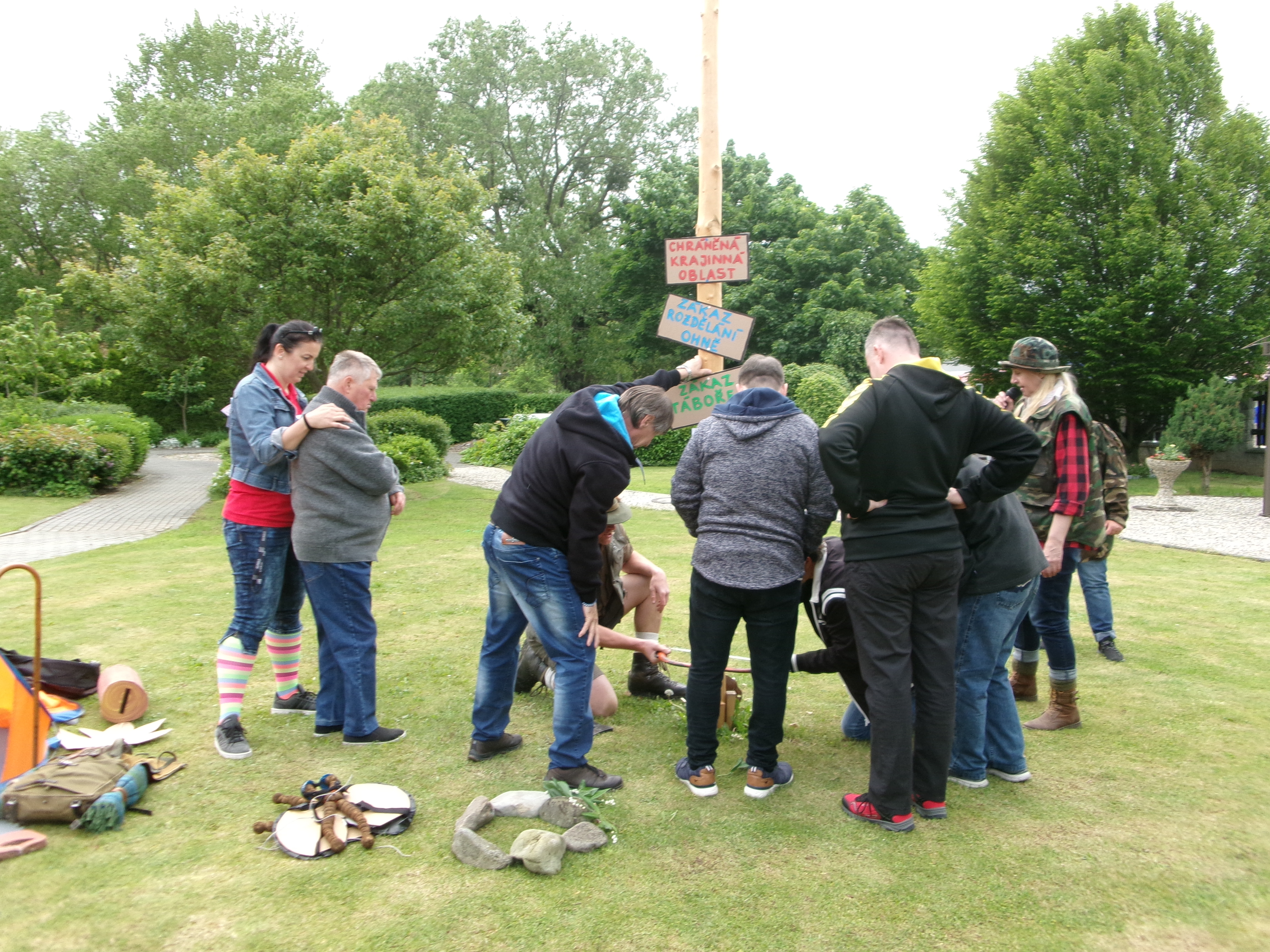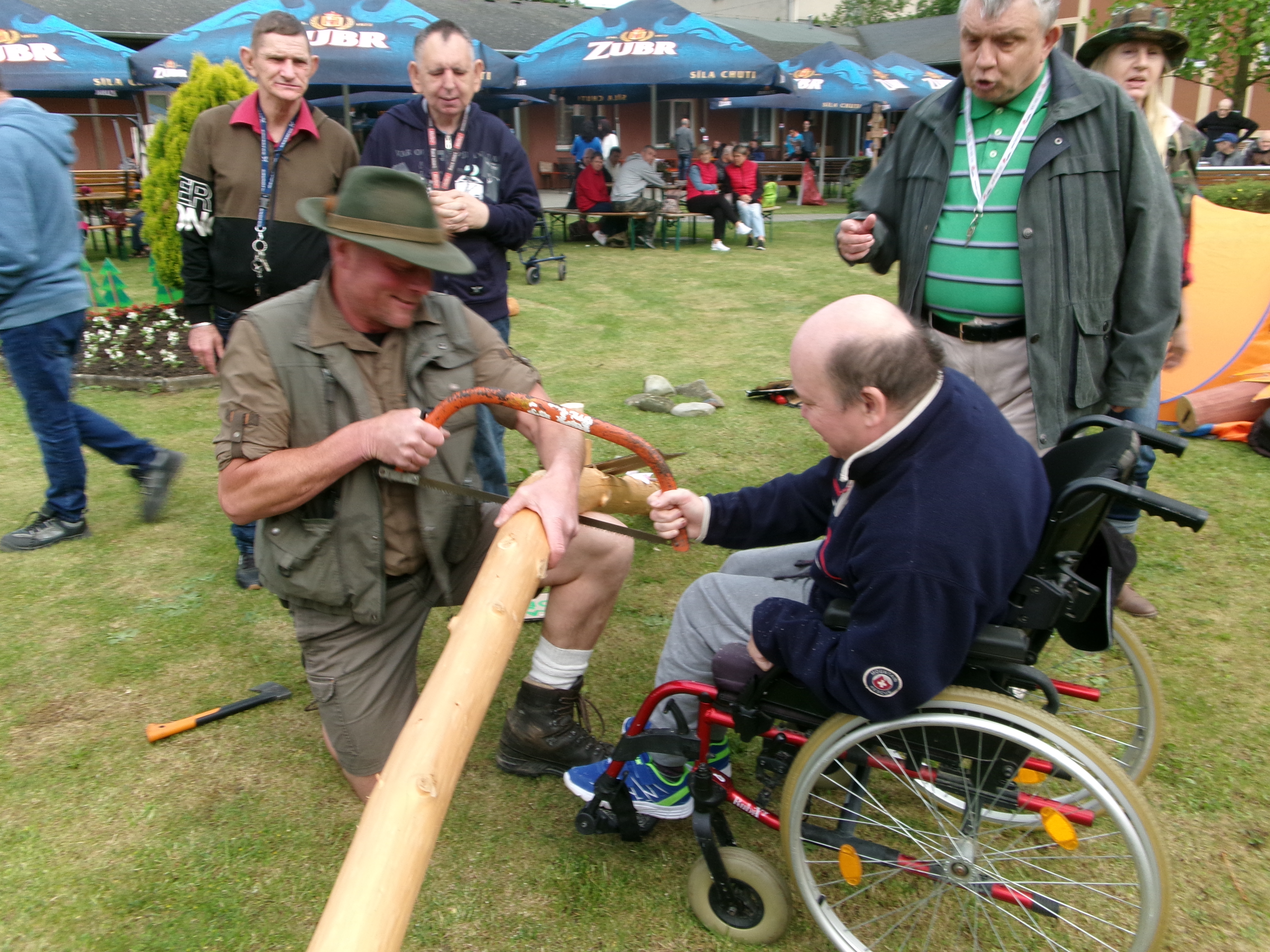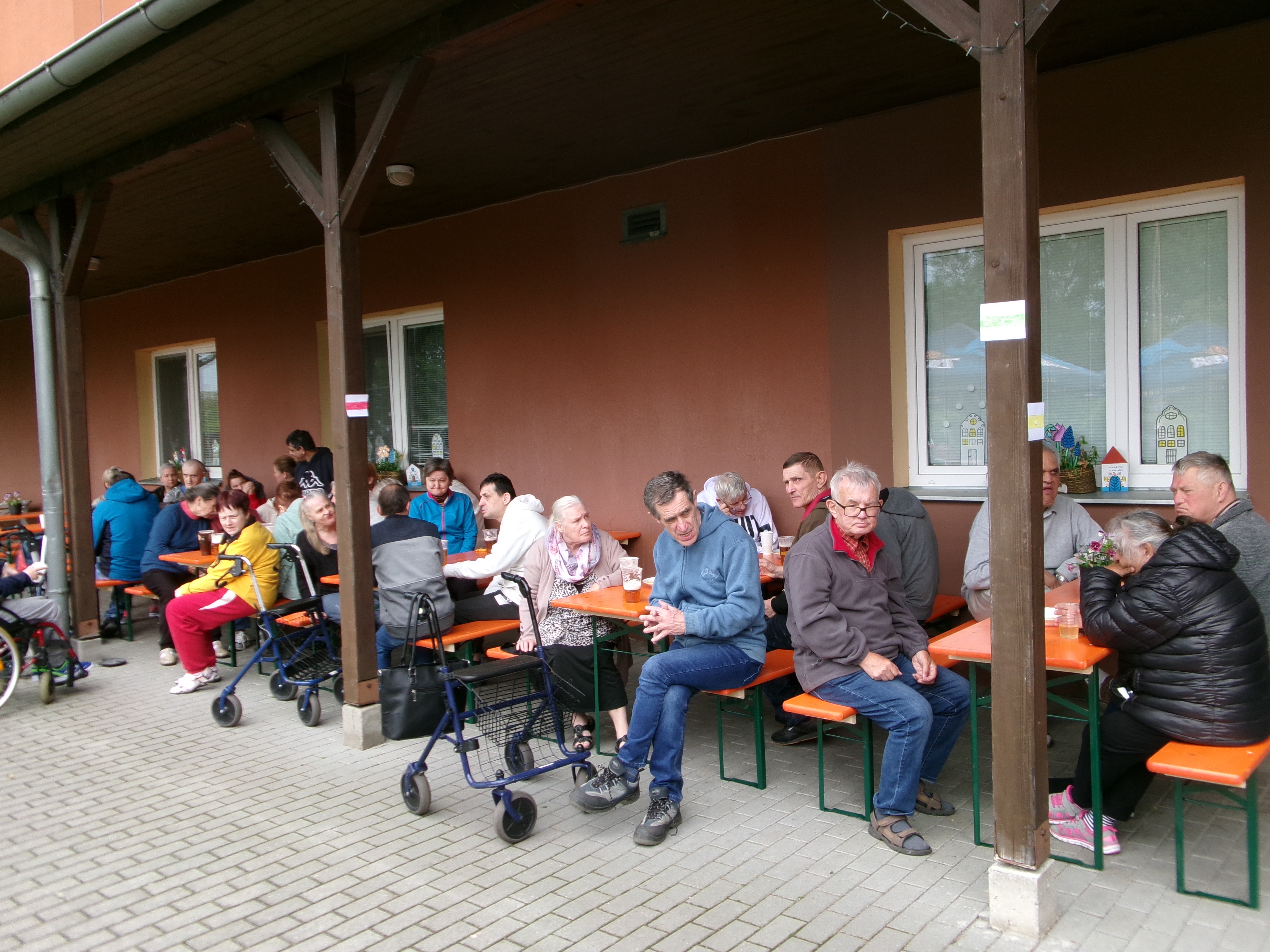Stejně jako každoročně jsme i letos uspořádali slavnostní kácení májky, která se po dobu měsíce května tyčila na naší zahradě. Tentokrát akce probíhala v duchu "Máme rádi Česko", kdy jsme jako turisté putovali naší zemí. Měli jsme připraveny kulisy, jež napovídaly, které místo právě navštěvujeme a zajímavost z této oblasti. Na navštívených místech nás vždy provázela písnička, která o tomto místě pojednávala. Pozvali jsme si naše kamarády a známé z jiných sociálních služeb, kteří se díky známým písničkám o naší zemi mohli do programu aktivně zapojit. Nakonec jsme ve spolupráci s dřevohostickým kastelánem pokáceli májku. Po celou dobu nás provázelo duo Balin Band a bylo k dispozici občerstvení v podobě opékaného kabanosu, cukrovinek připravených v naší kuchyni a nápojů. Užili jsme si to a už se těšíme na příště.