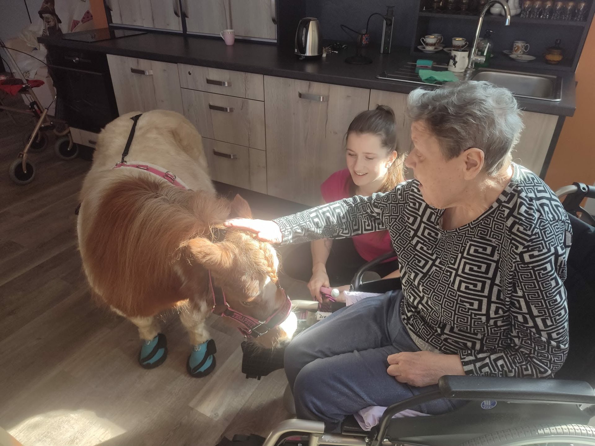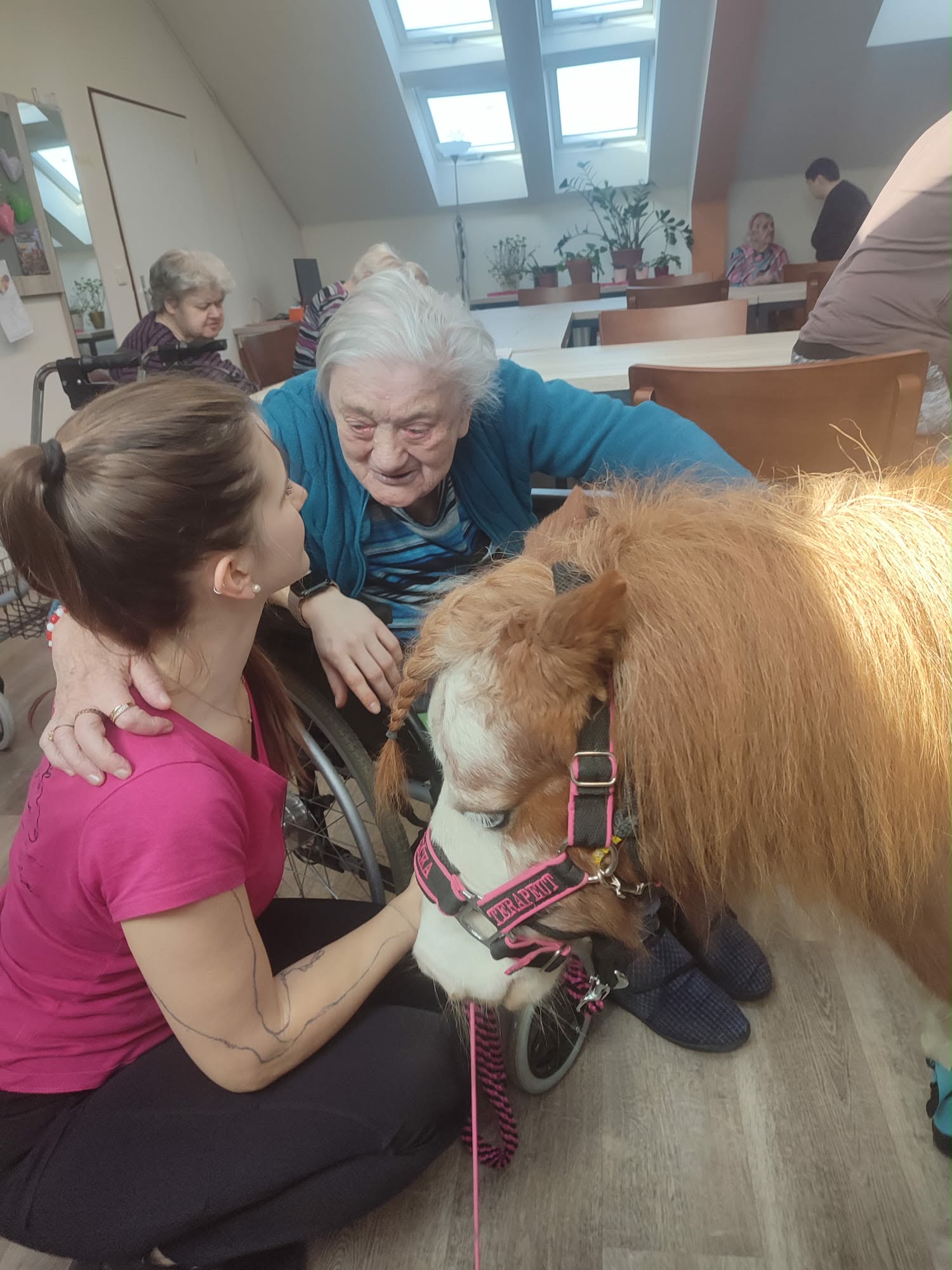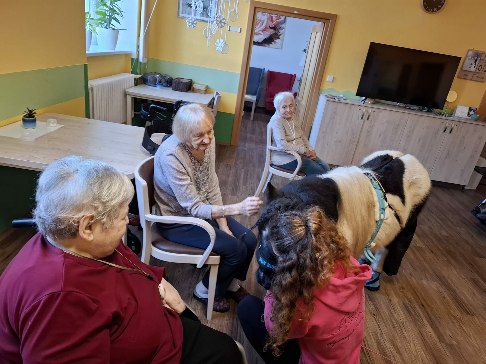 Po dlouhé zimě, kdy se zahrady tvářily ospale a chodby zněly tišeji než obvykle, se dnes dveře otevřely a s nimi přišlo něco víc než jen kroky. Přijela radost na čtyřech kopýtkách. Kulička a Bonbon se po měsících znovu objevili mezi námi. V jídelně se zastavil čas. Opatrné doteky, tiché úsměvy, pohledy plné soustředění i něhy. Jeden malý nos se opřel o dlaň a najednou bylo v místnosti víc světla než ze střešních oken. U lůžek zazněla slova, která by jinak možná zůstala schovaná. Ruce, které někdy váhají, dnes hladily s jistotou. Kulička s jemnou hřívou jako podzimní listí a Bonbon s tmavým kožíškem připomínajícím hebký samet přinesli klid, vzpomínky i nový impulz. Pro někoho návrat do dětství, pro jiného jen prostý, ale hluboký pocit blízkosti.