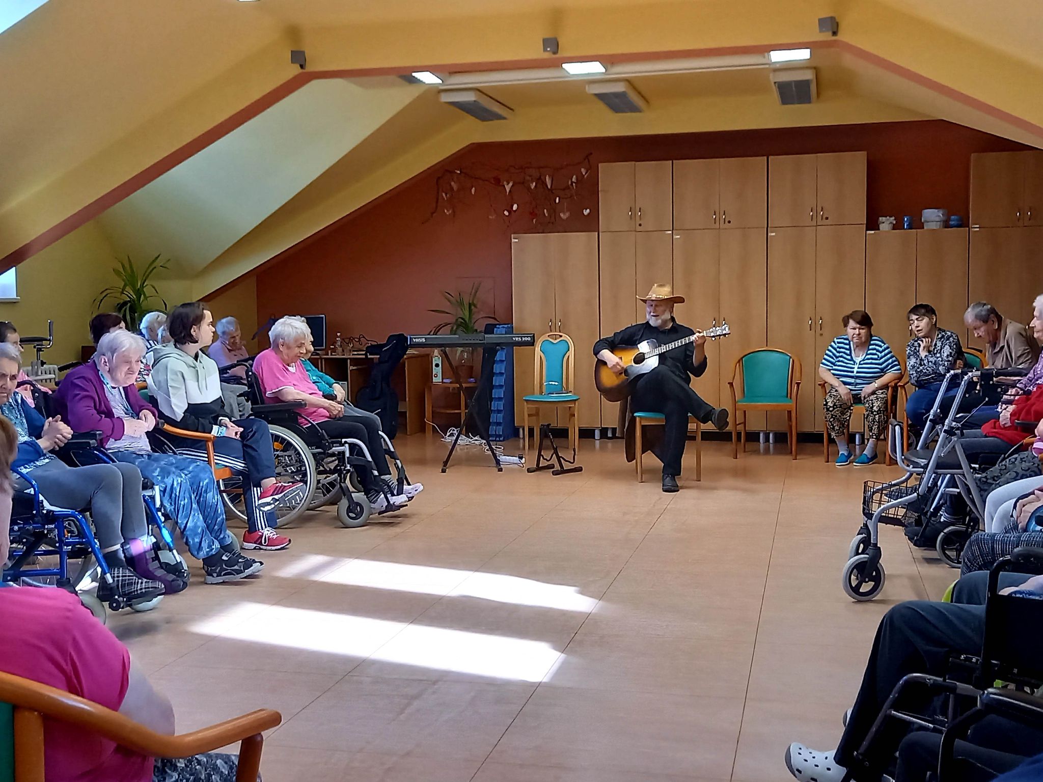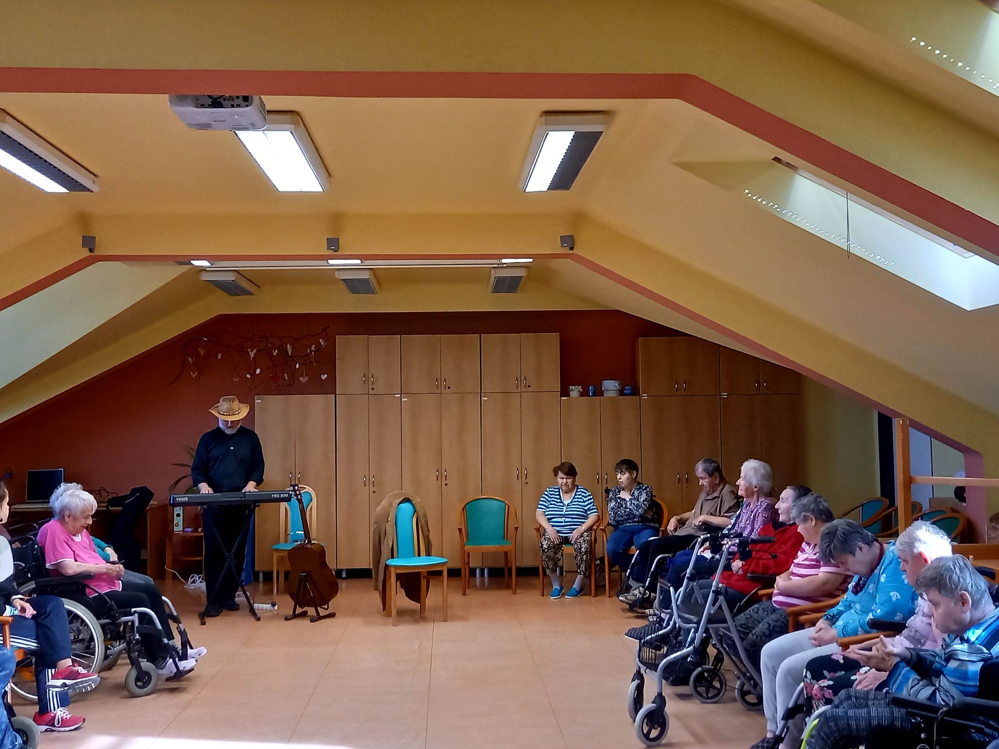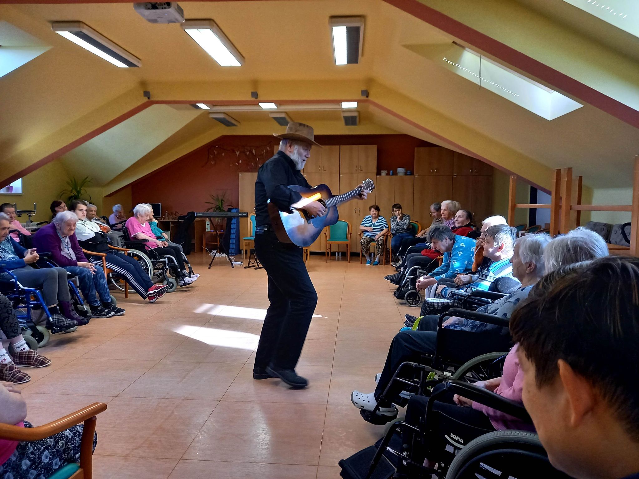 V průběhu úterního dopoledne nás dne 18. 10. 2022 opět navštívil pan doktor Svoboda dramaterapeut, muzikoterapeut a speciální pedagog z Pedagogické fakulty Univerzity Palackého v Olomouci. Celé hudebně dramatické setkání s našimi klienty obou služeb proběhlo na podkrovním sále, kde srdce mnoha přítomných posluchačů potěšil přednesem známých hitů z repertoáru Karla Gotta a Waldemara Matušky. Zazněla zde i celá řada lidových písní provázená slovními hrátkami a tancem. Celé kouzlo tohoto muzicírování v doprovodu tanečně pohybových aktivit spočívá v propojení a vzájemném souznění obou našich cílových skupin uživatelů. Terapeutický podtext se skrývá za slovy profesora Erwina Böhma, který zastával názor: „Nejdříve rozhýbej hlavu a potom tělo“. Nestačí totiž jen pečovat o lidské tělo a léčit jeho patologické symptomy, ale nutné je starat se i o jeho křehkou duši. Díky změně úhlu pohledu na člověka, jako na krásnou lidskou bytost, která má stále co nabídnout, se lze prostřednictvím těchto aktivit odklonit od jeho funkčních deficitů k ještě zachovalým schopnostem, maximálně je tímto podpořit a využít při tanci, zpěvu, hudebních hádankách nebo jen vzpomínkách na mladí a hezké chvíle v životě.