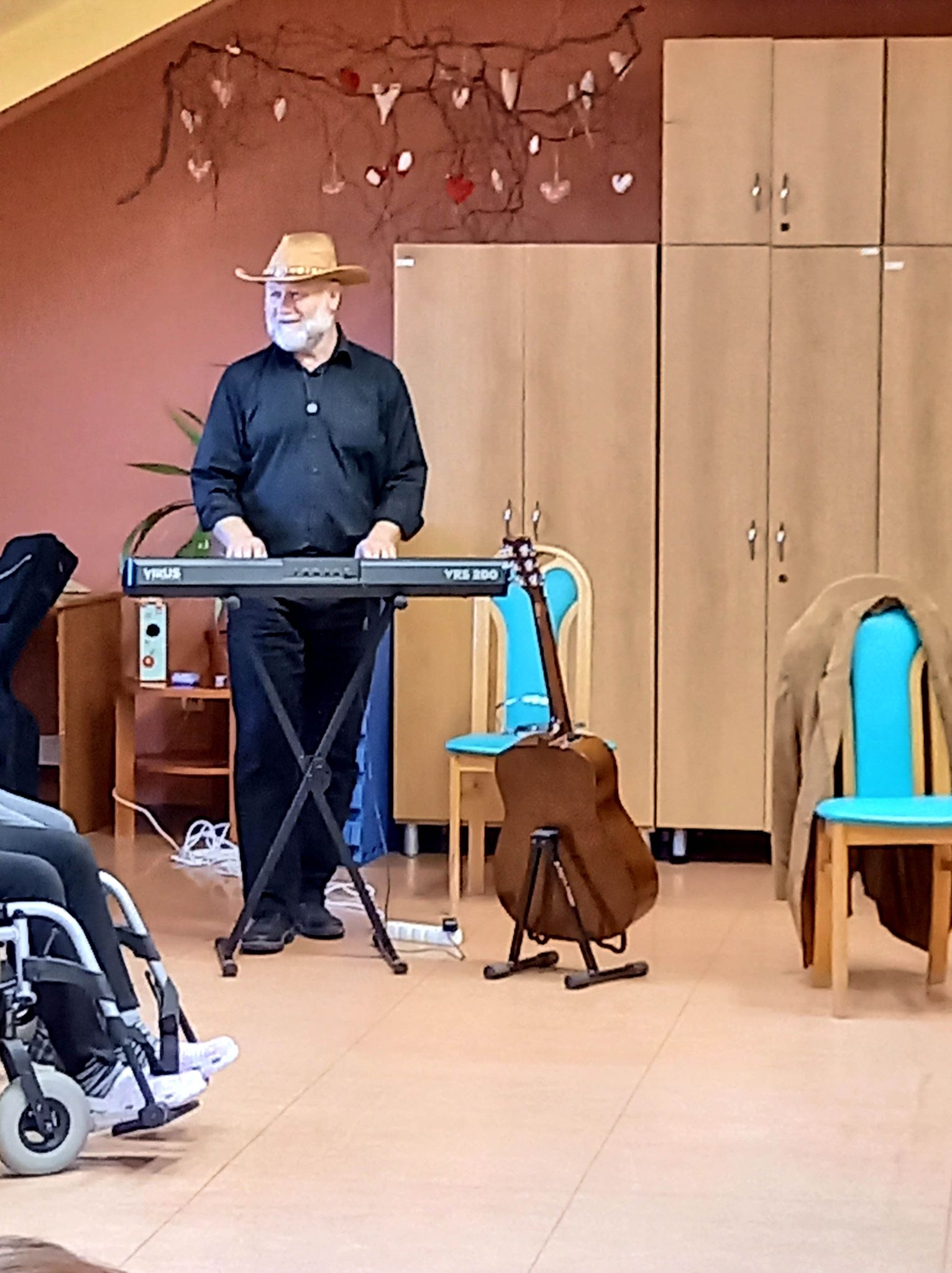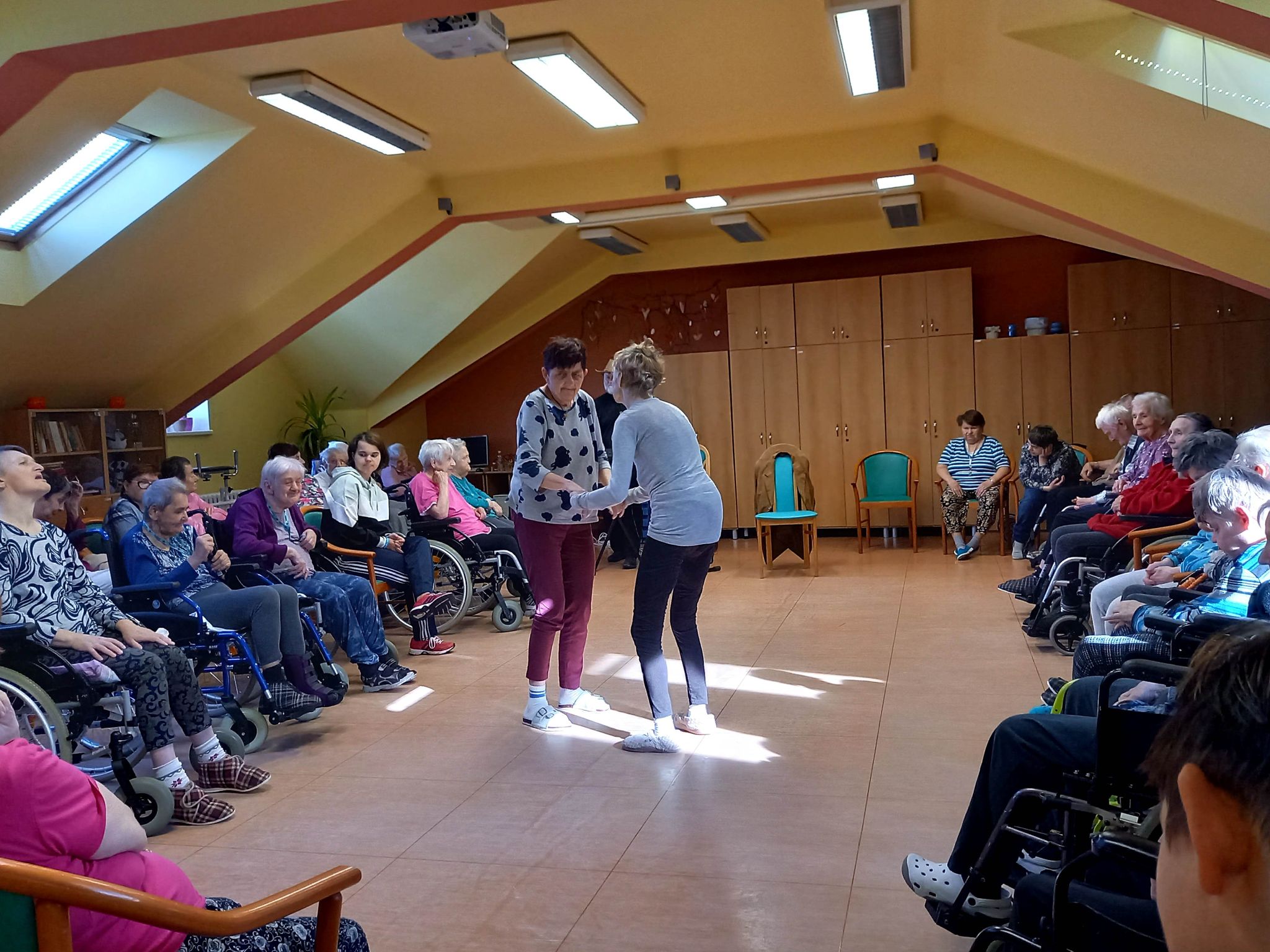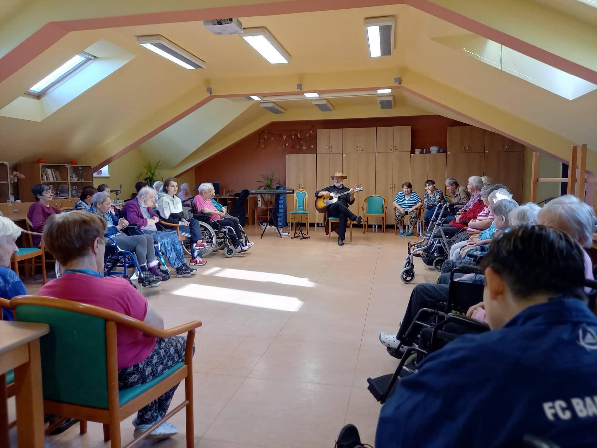 V průběhu úterního dopoledne nás dne 18. 10. 2022 opět navštívil pan doktor Svoboda dramaterapeut, muzikoterapeut a speciální pedagog z Pedagogické fakulty Univerzity Palackého v Olomouci. Celé hudebně dramatické setkání s našimi klienty obou služeb proběhlo na podkrovním sále, kde srdce mnoha přítomných posluchačů potěšil přednesem známých hitů z repertoáru Karla Gotta a Waldemara Matušky. Zazněla zde i celá řada lidových písní provázená slovními hrátkami a tancem. Celé kouzlo tohoto muzicírování v doprovodu tanečně pohybových aktivit spočívá v propojení a vzájemném souznění obou našich cílových skupin uživatelů. Terapeutický podtext se skrývá za slovy profesora Erwina Böhma, který zastával názor: „Nejdříve rozhýbej hlavu a potom tělo“. Nestačí totiž jen pečovat o lidské tělo a léčit jeho patologické symptomy, ale nutné je starat se i o jeho křehkou duši. Díky změně úhlu pohledu na člověka, jako na krásnou lidskou bytost, která má stále co nabídnout, se lze prostřednictvím těchto aktivit odklonit od jeho funkčních deficitů k ještě zachovalým schopnostem, maximálně je tímto podpořit a využít při tanci, zpěvu, hudebních hádankách nebo jen vzpomínkách na mladí a hezké chvíle v životě.