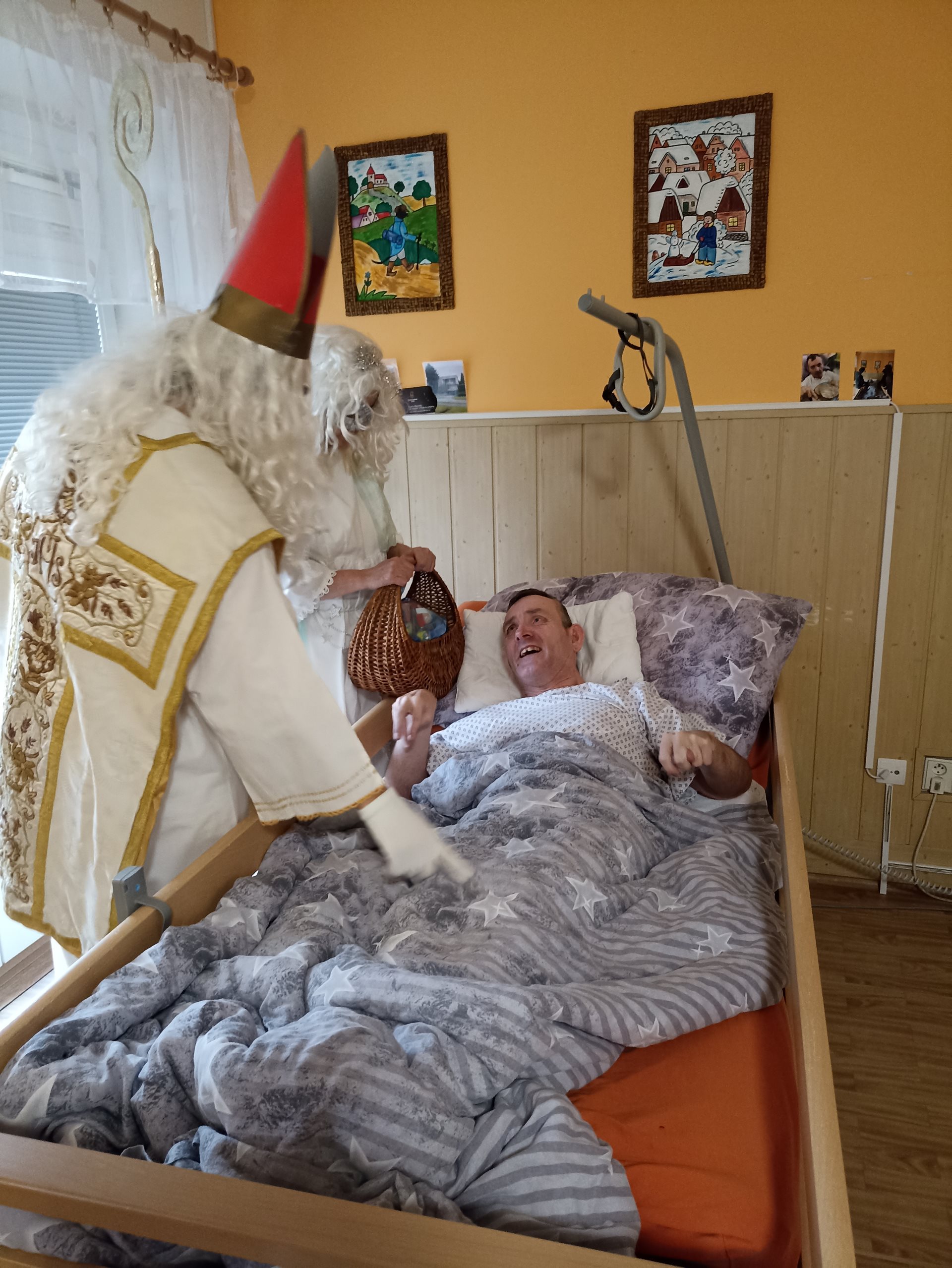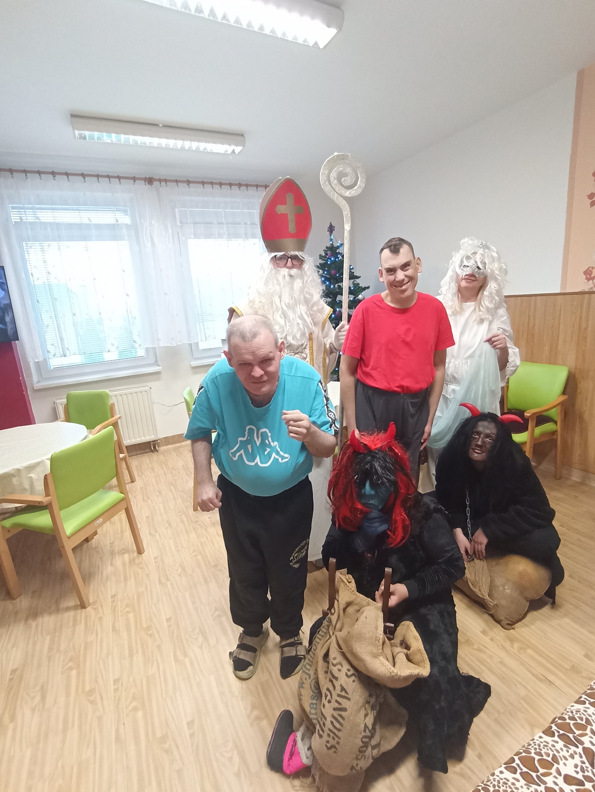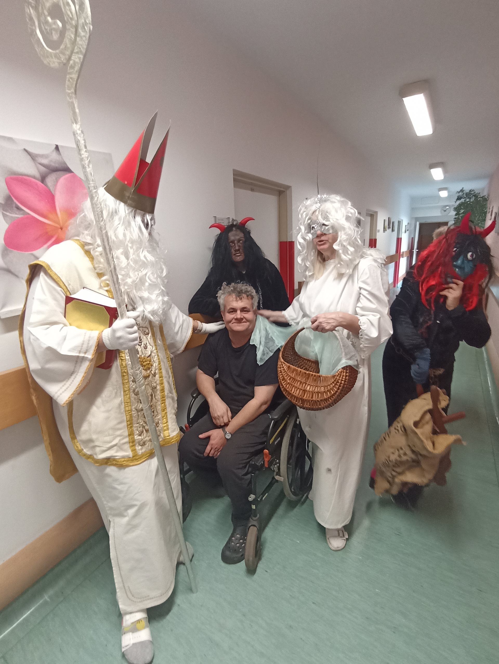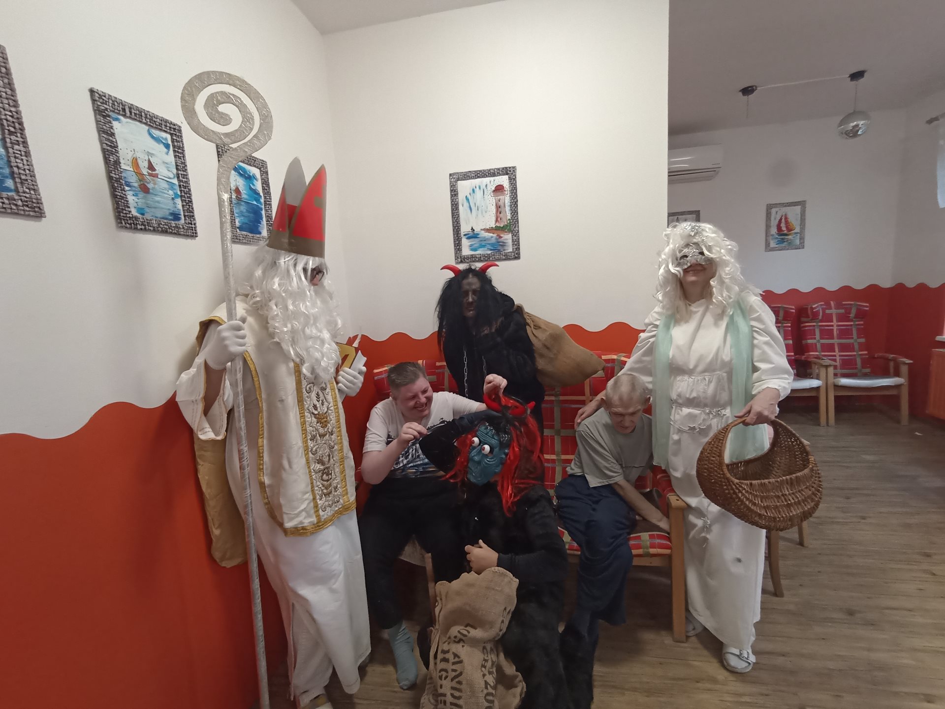 V našem zařízení nás dnes navštívil Mikuláš se svými pomocníky. Na jeho příchod jsme se těšili už od rána a připravili jsme si krátká vystoupení. Mikuláš každého osobně pozdravil a pochválil za jeho úsilí během celého roku. Anděl rozdával drobné dárečky a sladkosti. Čerti byl přítomni jen symbolicky, aby se nikdo nemusel bát. Společně jsme si zazpívali několik vánočních koled. Někteří z nás předali Mikulášovi vlastnoručně vyrobené obrázky. Atmosféra byla příjemná, klidná a plná radosti. Návštěva Mikuláše všem přinesla krásný zažitek.