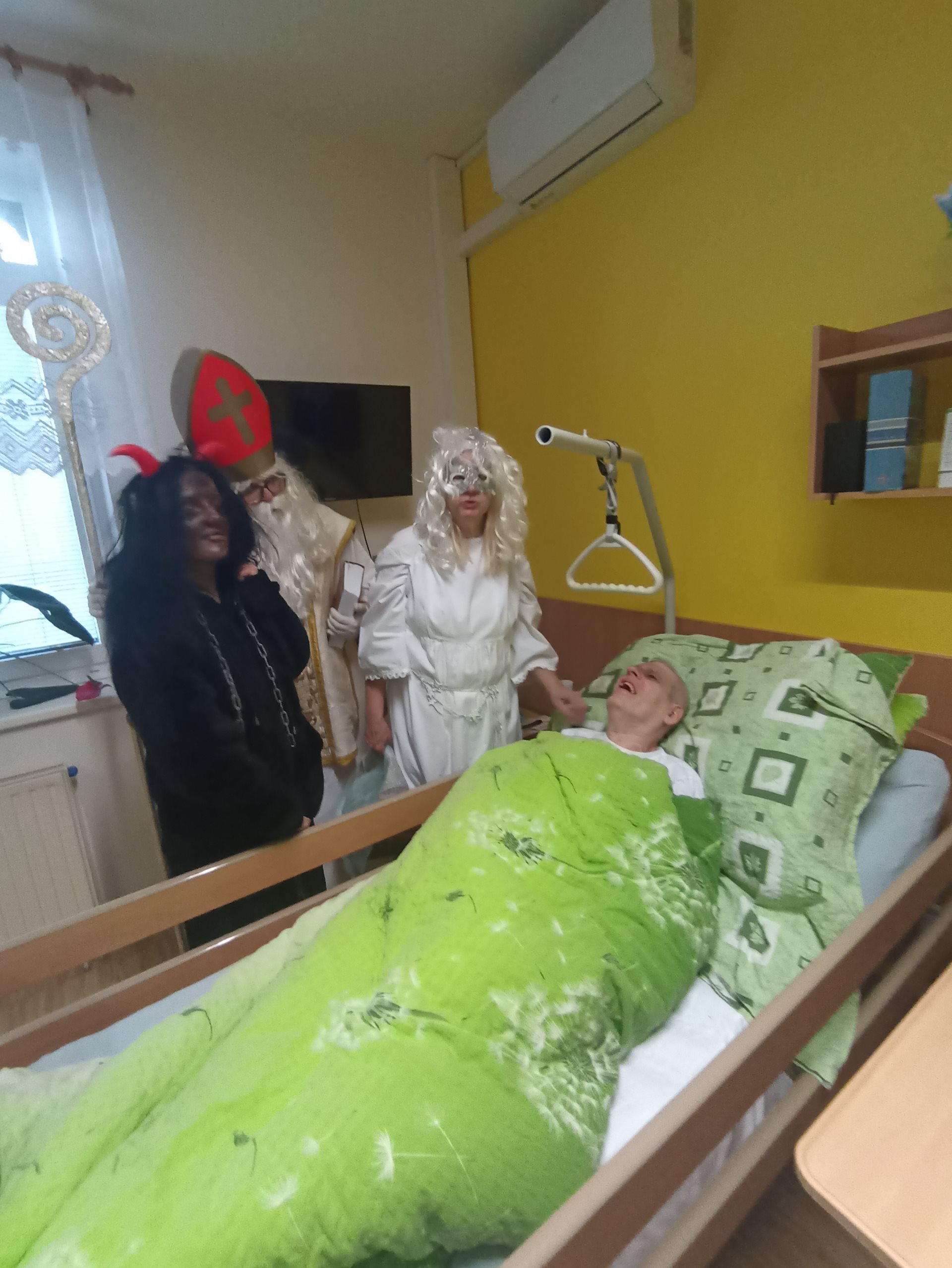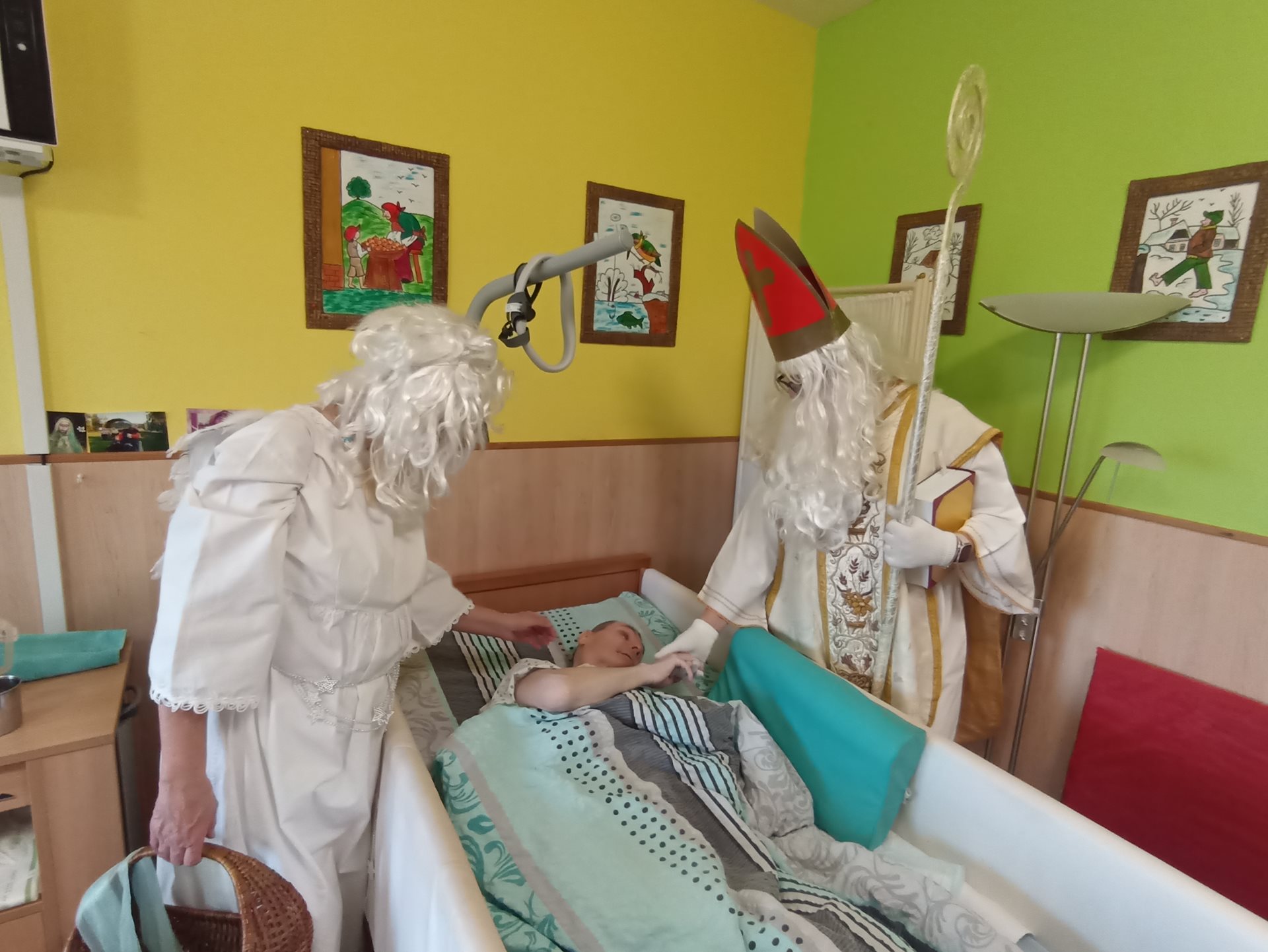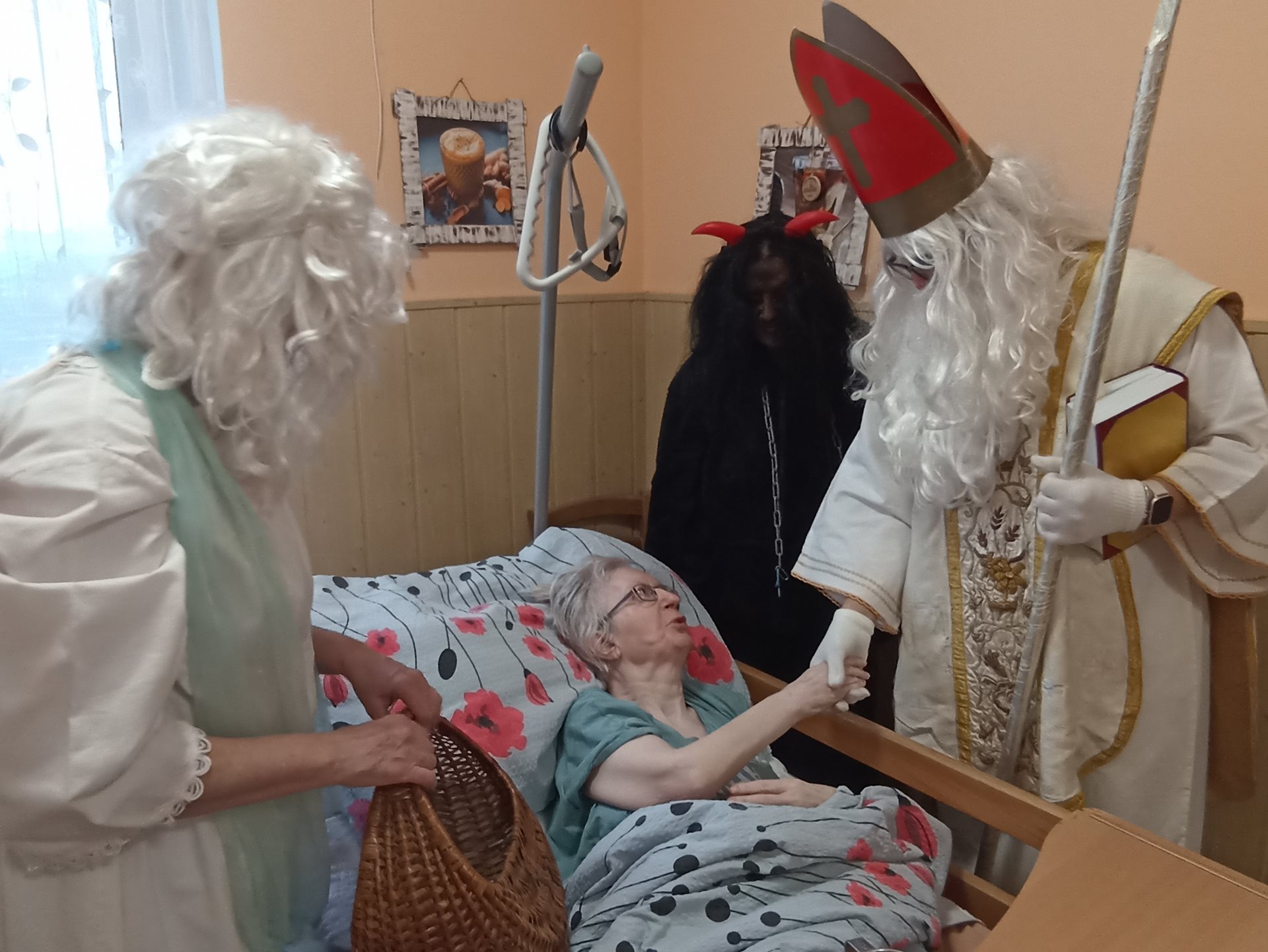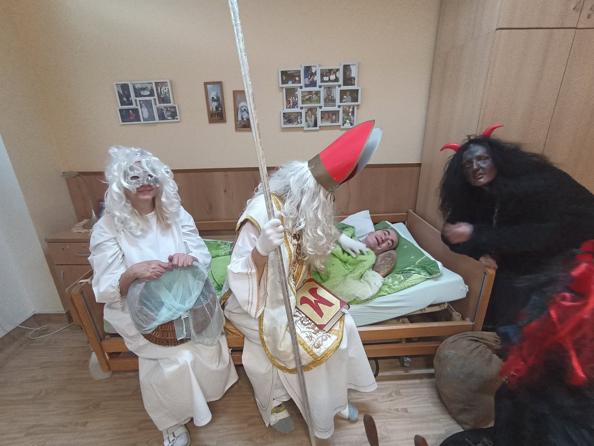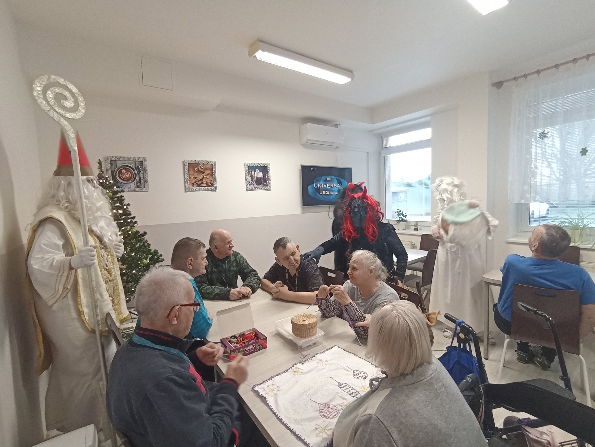 V našem zařízení nás dnes navštívil Mikuláš se svými pomocníky. Na jeho příchod jsme se těšili už od rána a připravili jsme si krátká vystoupení. Mikuláš každého osobně pozdravil a pochválil za jeho úsilí během celého roku. Anděl rozdával drobné dárečky a sladkosti. Čerti byl přítomni jen symbolicky, aby se nikdo nemusel bát. Společně jsme si zazpívali několik vánočních koled. Někteří z nás předali Mikulášovi vlastnoručně vyrobené obrázky. Atmosféra byla příjemná, klidná a plná radosti. Návštěva Mikuláše všem přinesla krásný zažitek.