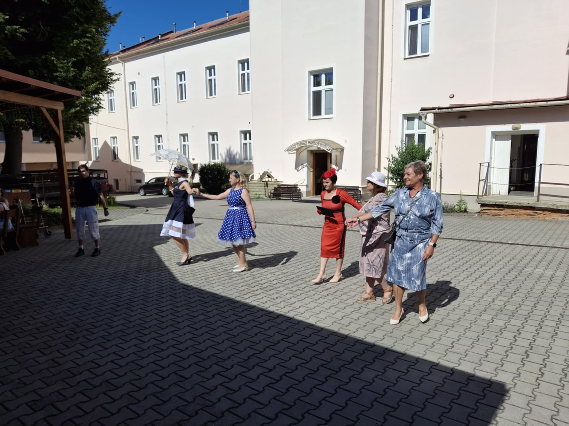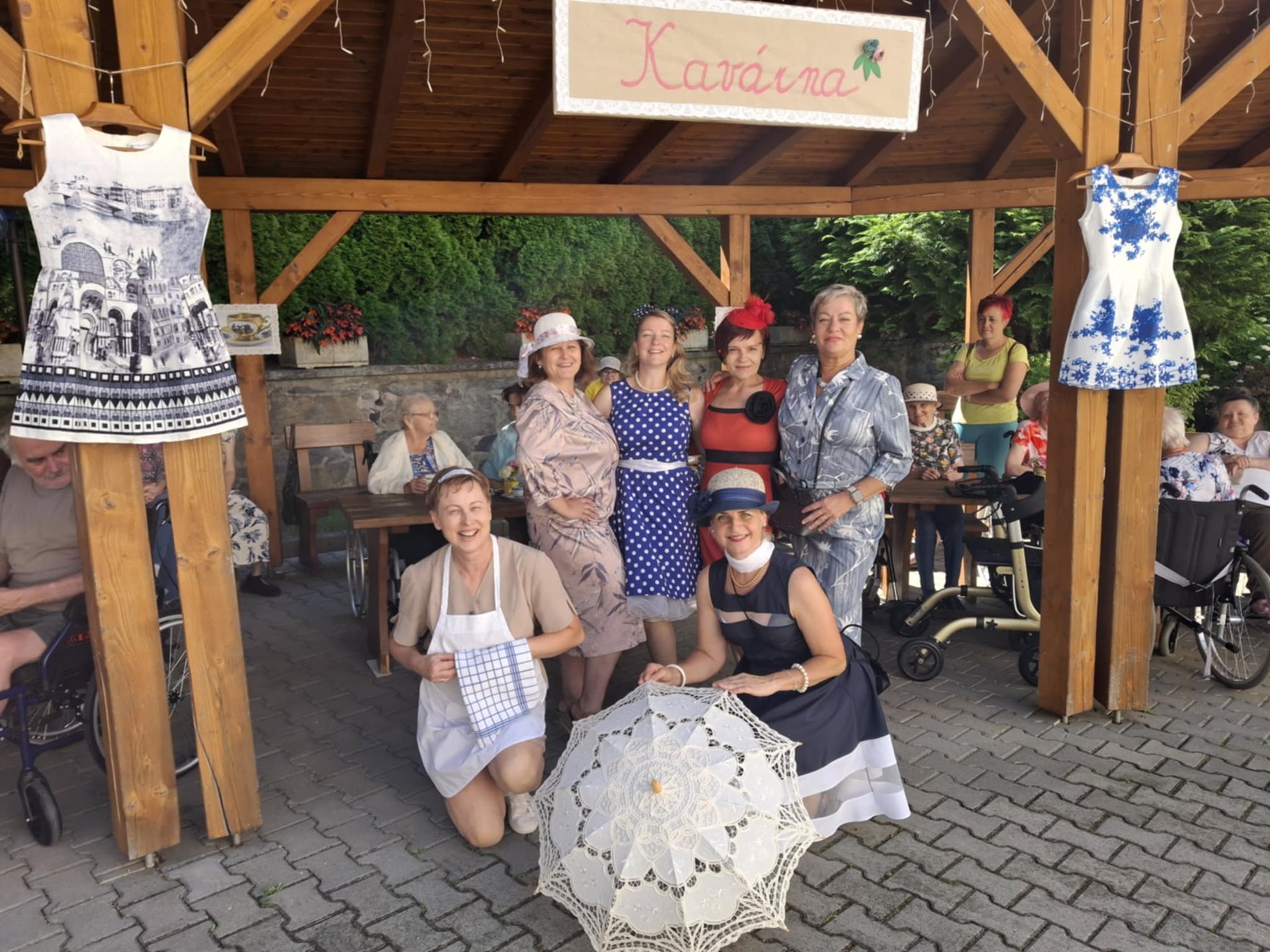 Otevřením lázeňské kavárničky " Pod pergolou" jsme pokračovali v letním cyklu kokorského Kalendária. Bonusem byla živá hudba v podání harmonikáře pana Frantíka. Dále se kavárnou nesla hudba oblíbené kapely Melody Makers Ondřeje Havelky. Program byl tak i díky humorným vsuvkám našich kolegyň téměř kabaretní. Atmosféru kavárničky jsme podpořili také dobovými kostýmy a vzácným kávovým servisem. Velmi nás těší spontánní reakce seniorů, neboť především díky nim dostala kavárna příjemný rodinný nádech. Cestování časem v retro-kavárně se jim líbí, dobře se orientují v dobových kostýmech a hudbě, písničky s živou harmonikou je podnítili k pobrukování si melodií. Prostě nádherná kombinace všech vjemů.