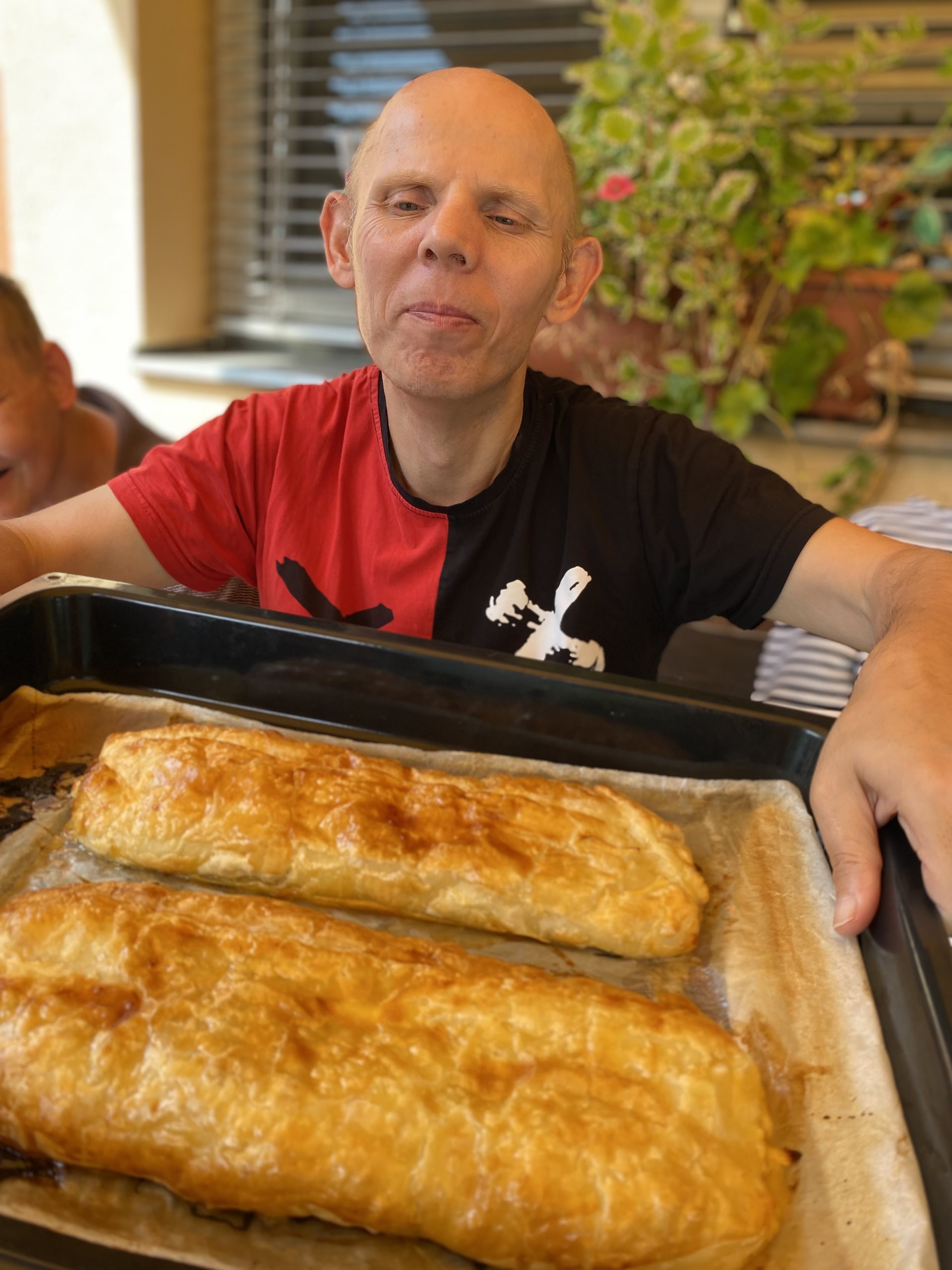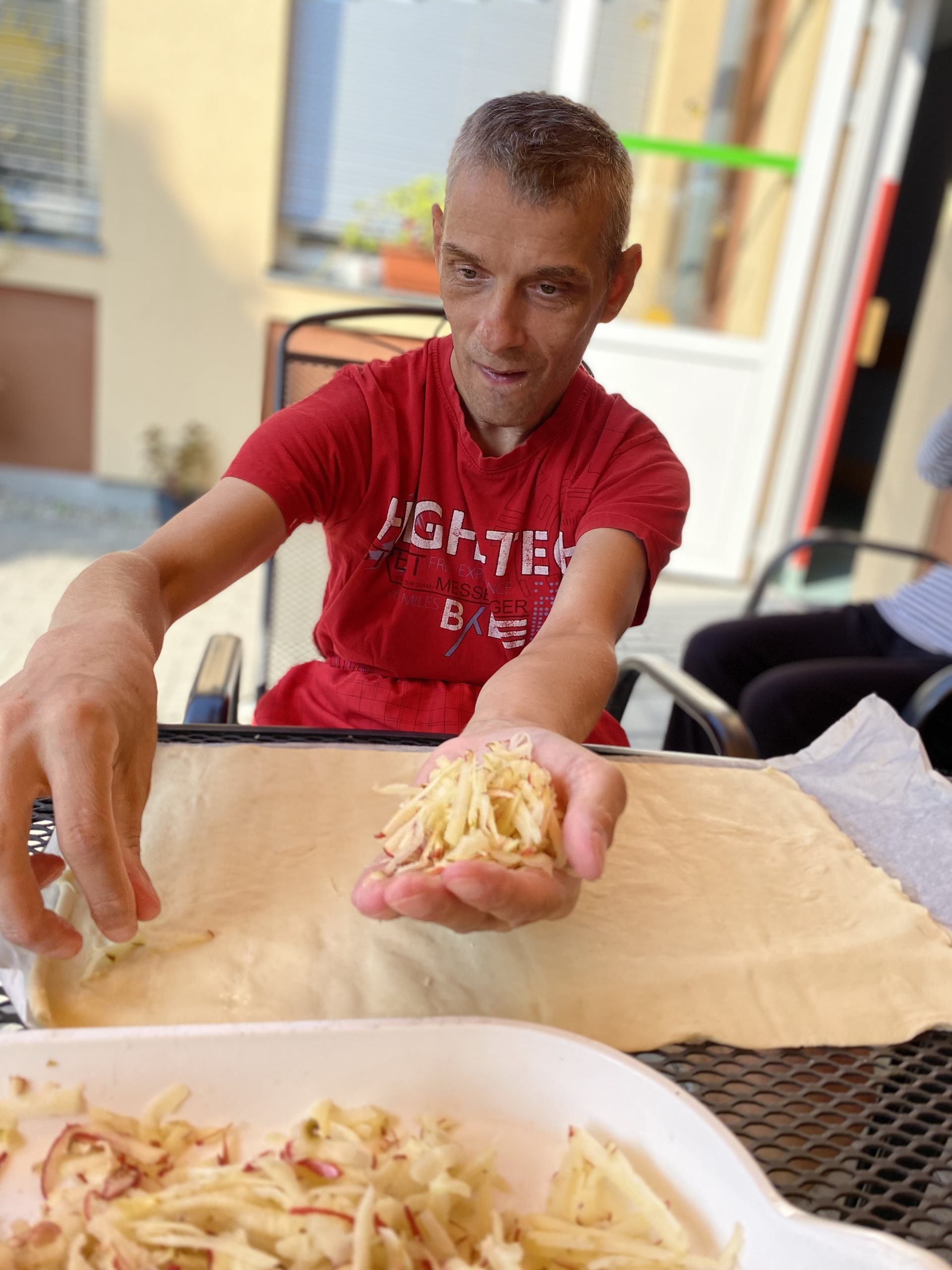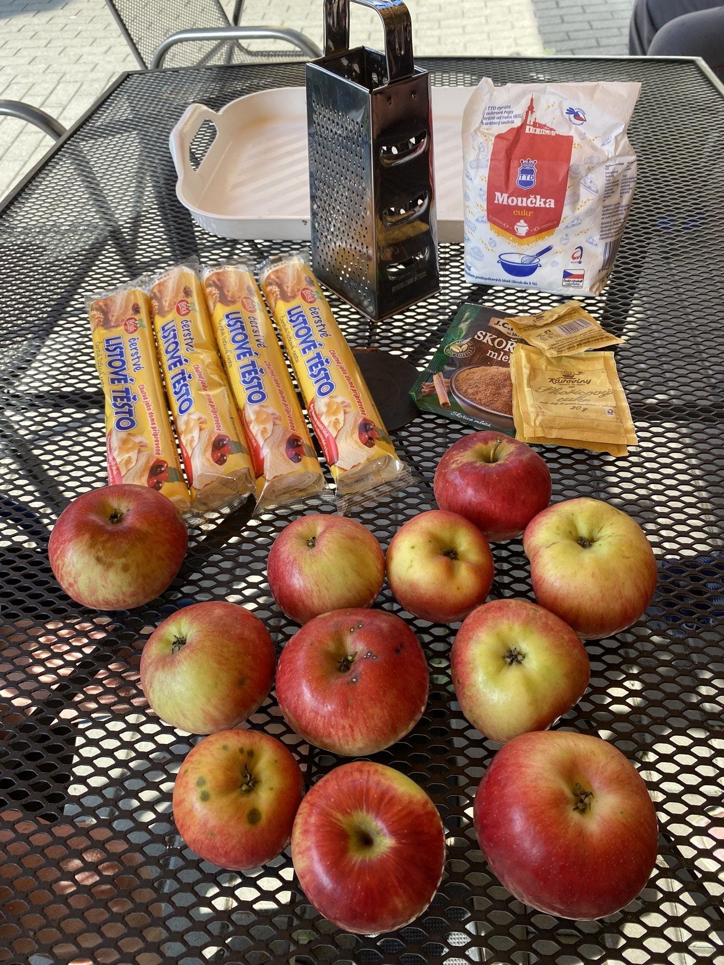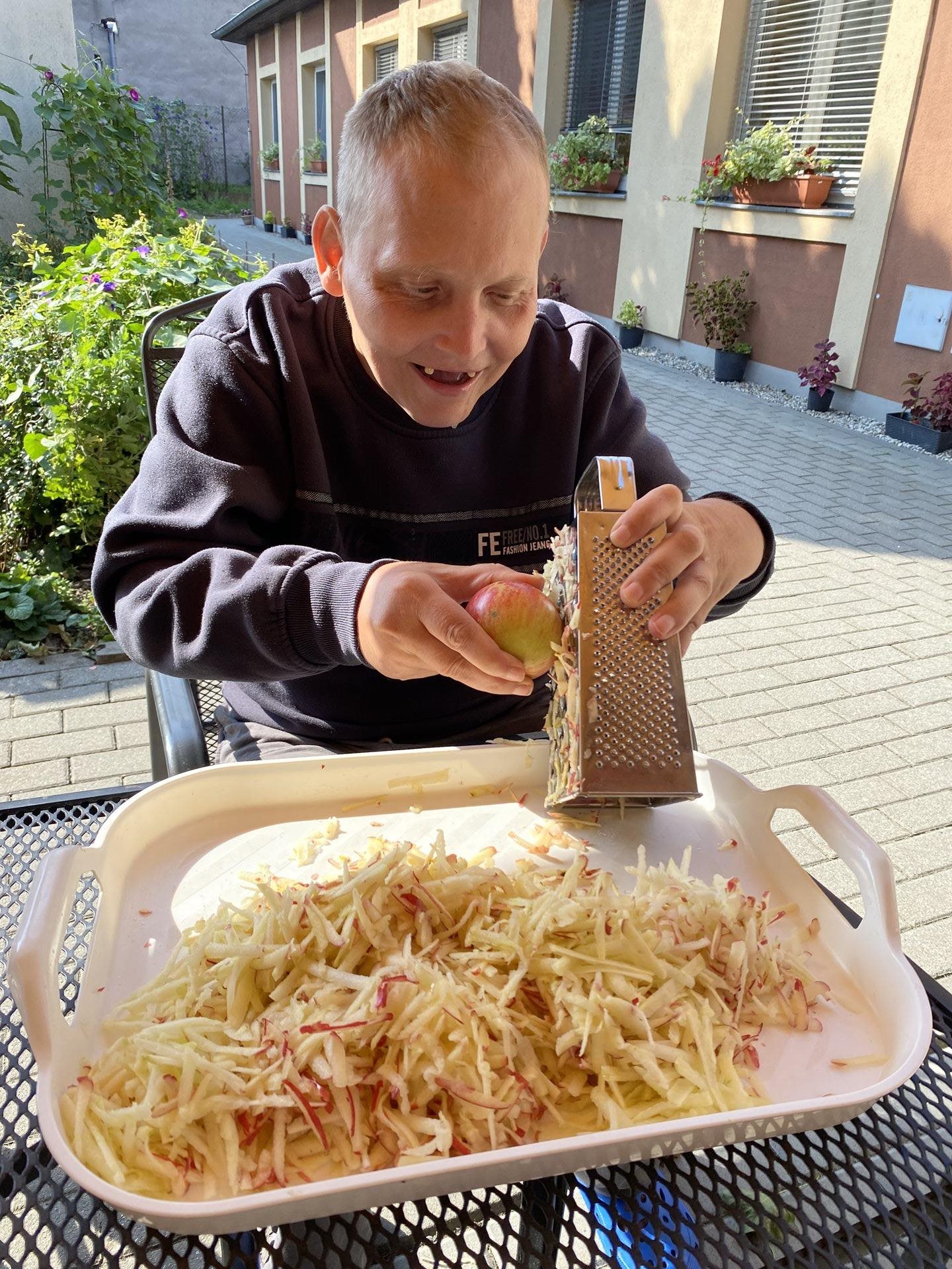 Nějaká jablíčka jsme dostali od našich kamarádů z chráněného bydlení a zbytek surovin jsme si dokoupili. Jablíčka jsme nastrouhali na hrubším struhadle a nešetřili jsme si s nimi. Posypali jsme je skořicovým cukrem a ještě přidali i obyčejný cukr, protože máme štrůdl raději sladší. Po upečení jsme si jej nechali vychladnout a odpoledne si k němu připravili dobrou kávu. Lepší pochoutku než je poctivý jablečný štrůdl zatím neznáme.