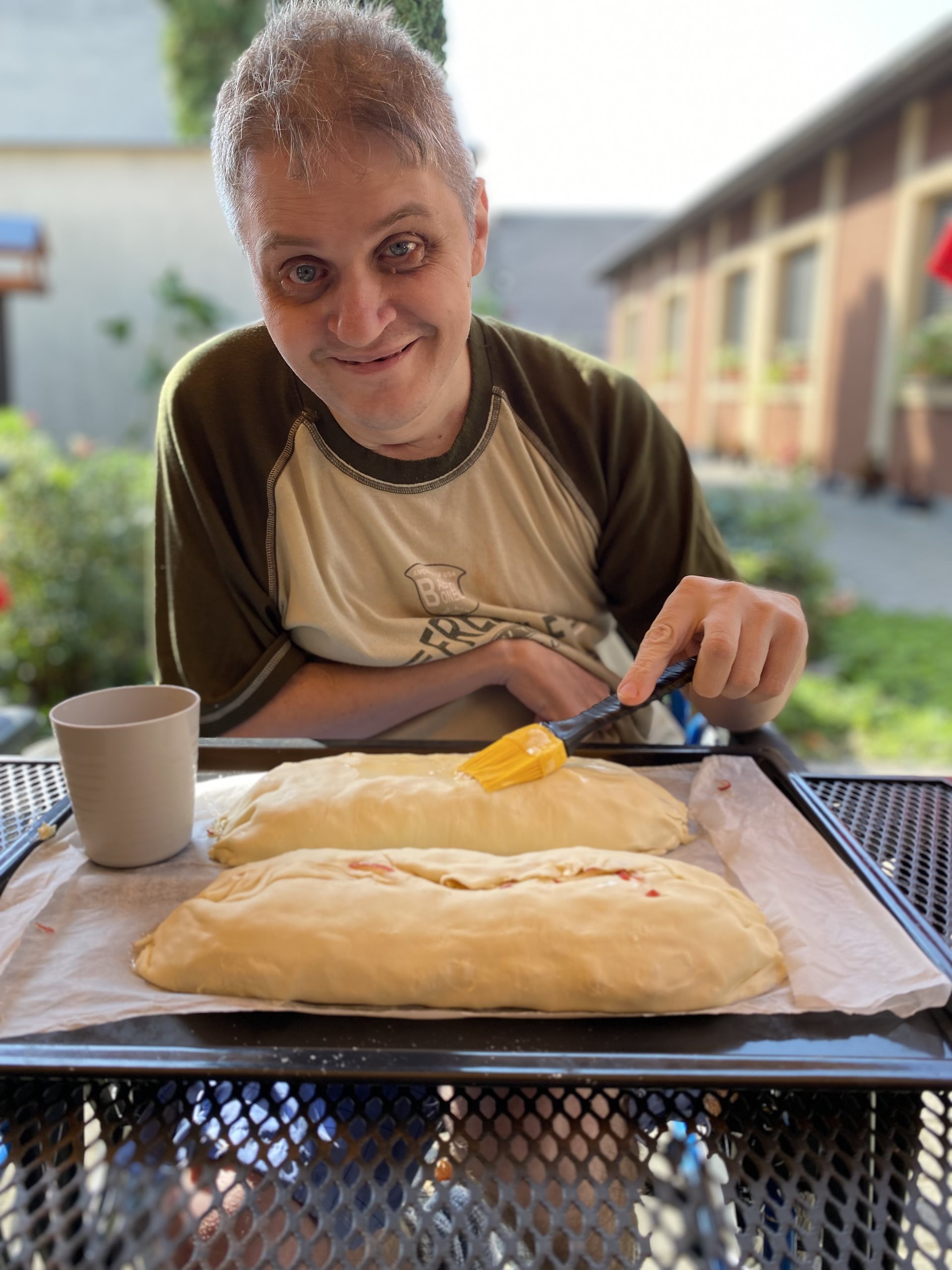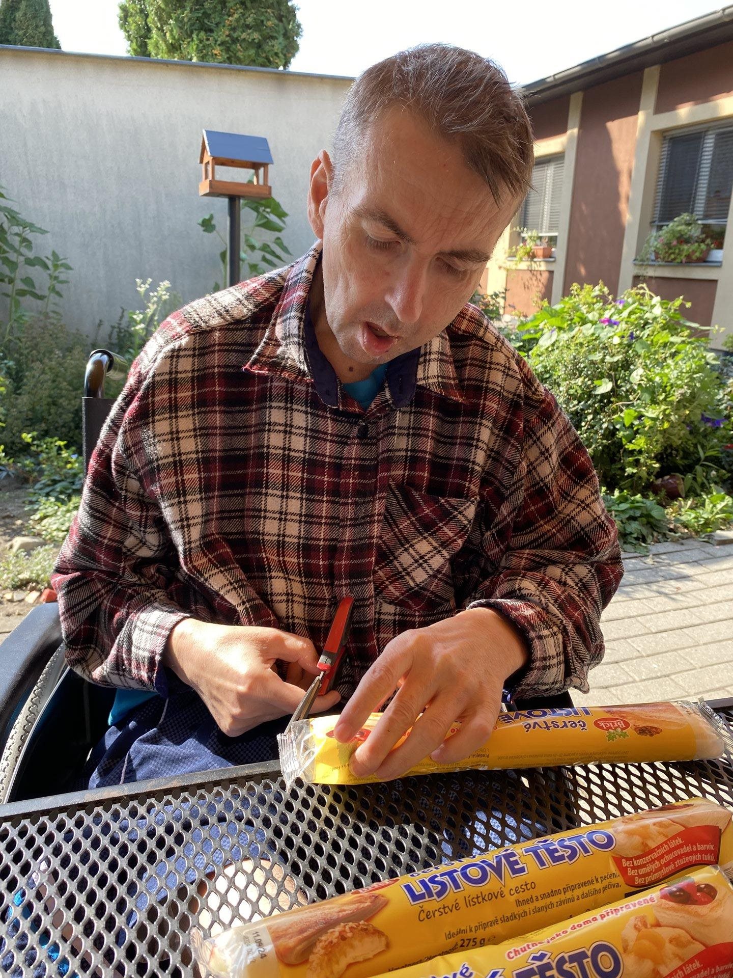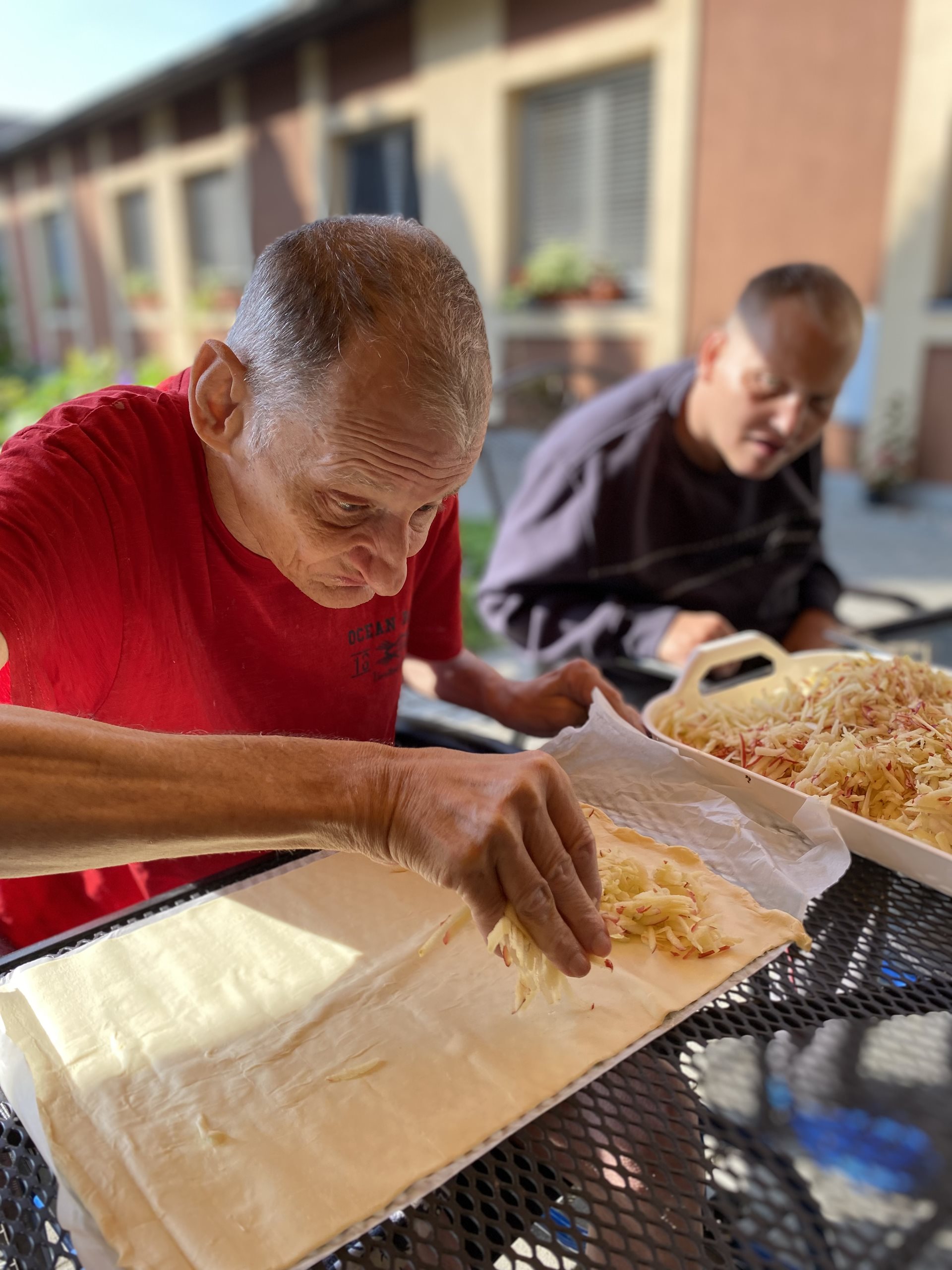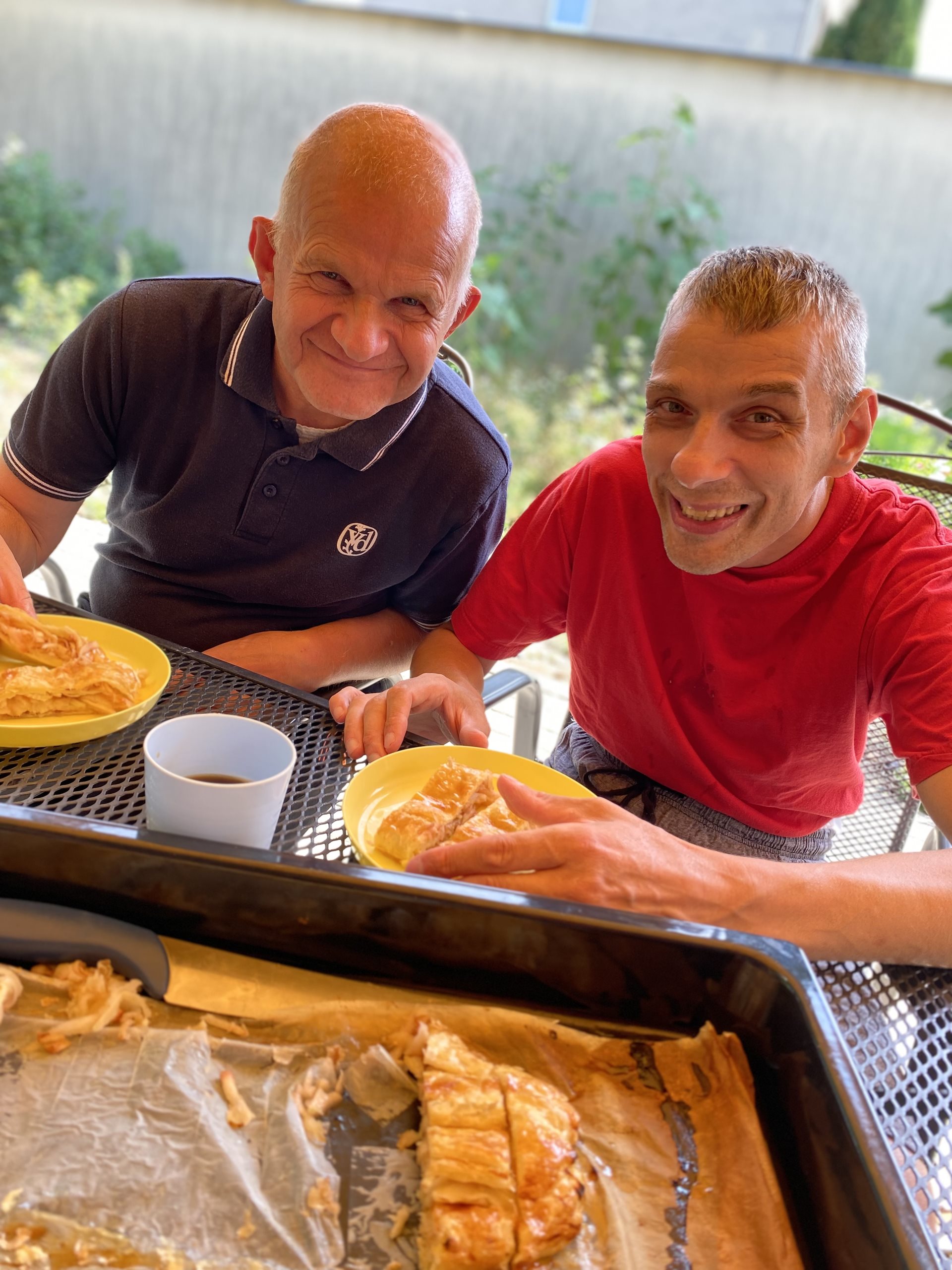 Nějaká jablíčka jsme dostali od našich kamarádů z chráněného bydlení a zbytek surovin jsme si dokoupili. Jablíčka jsme nastrouhali na hrubším struhadle a nešetřili jsme si s nimi. Posypali jsme je skořicovým cukrem a ještě přidali i obyčejný cukr, protože máme štrůdl raději sladší. Po upečení jsme si jej nechali vychladnout a odpoledne si k němu připravili dobrou kávu. Lepší pochoutku než je poctivý jablečný štrůdl zatím neznáme.