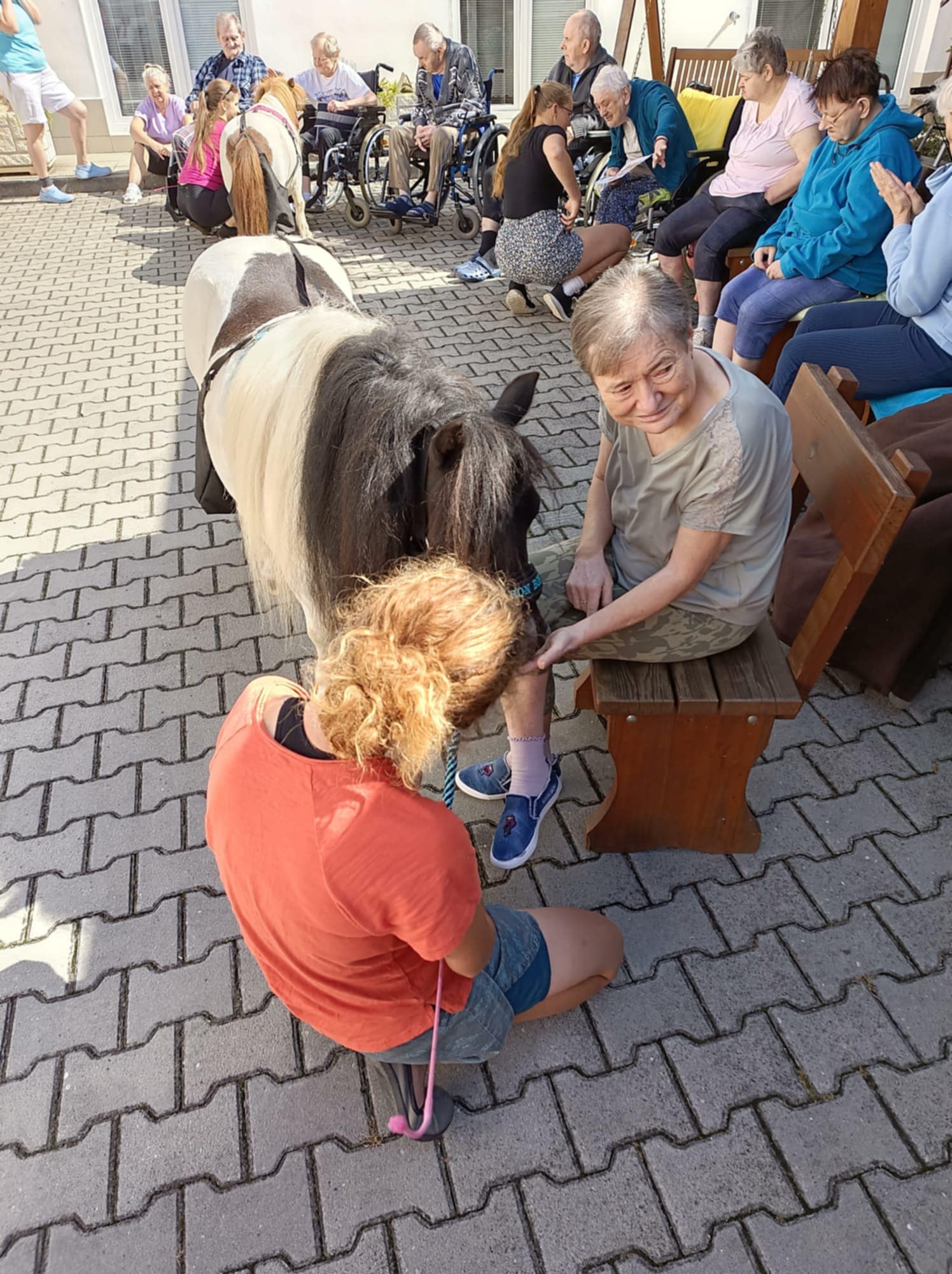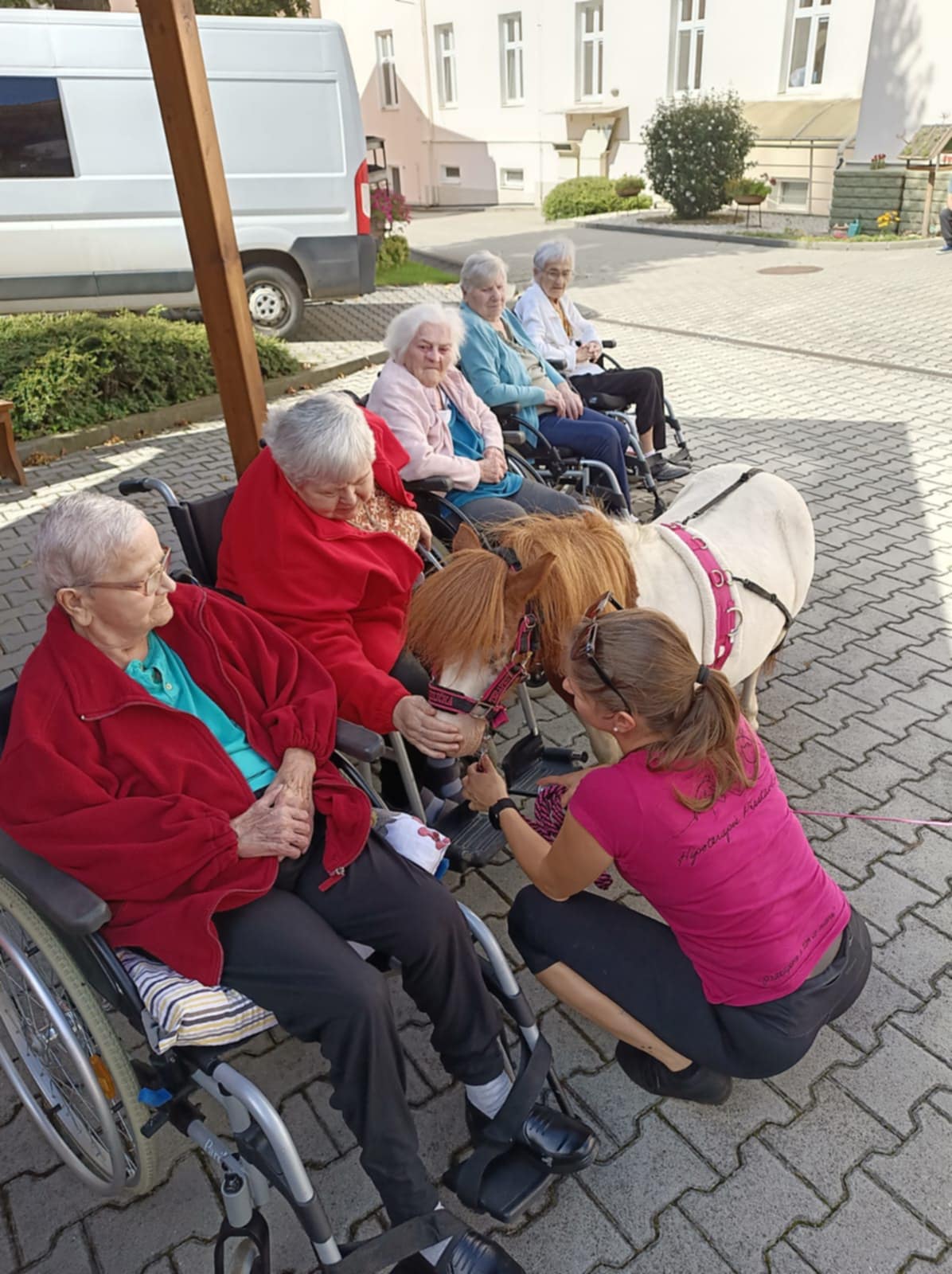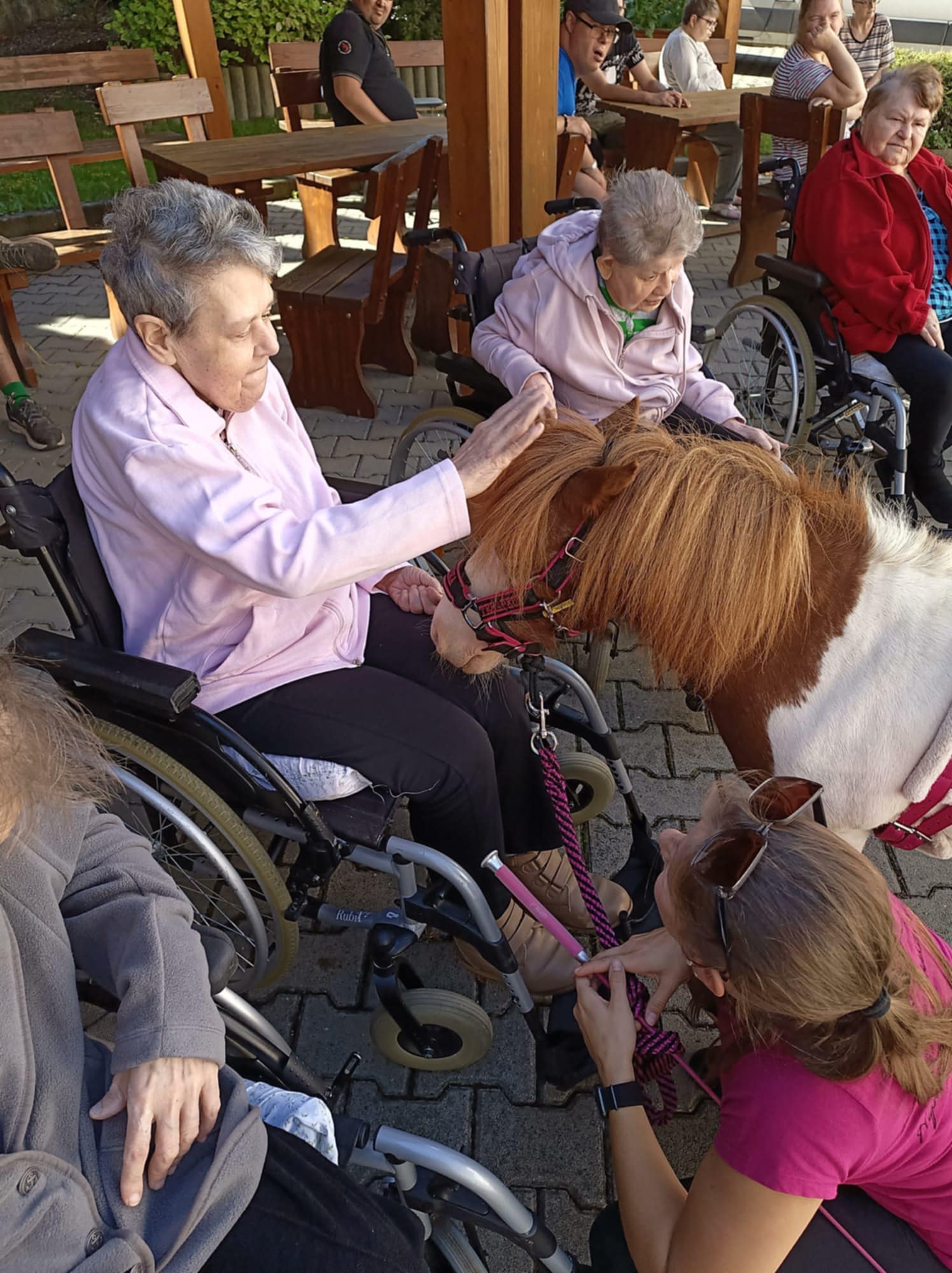 Dnes nás v dopoledních hodinách opět navštívili naši čtyřnozí kamarádi Bonbón a Kulička. Oba poníci přinesli klientům spoustu radosti, úsměvů a hezkých chvil při společném setkání.