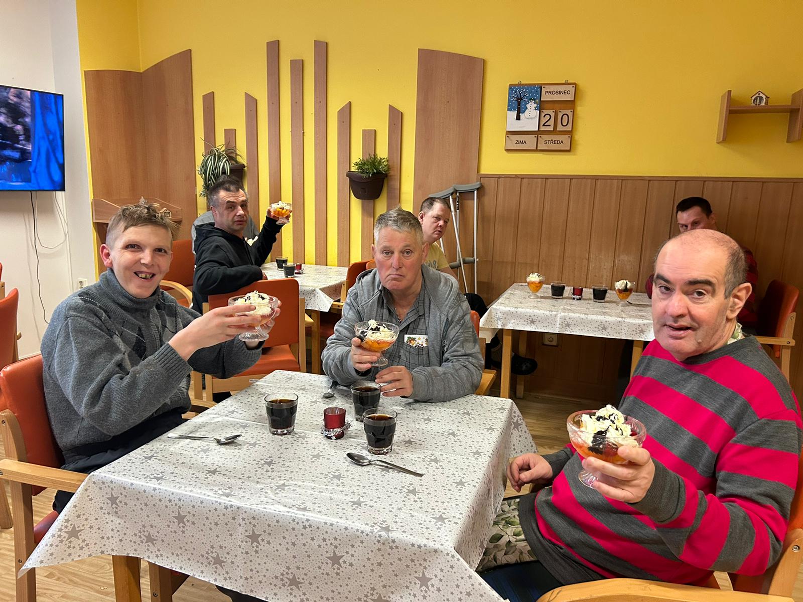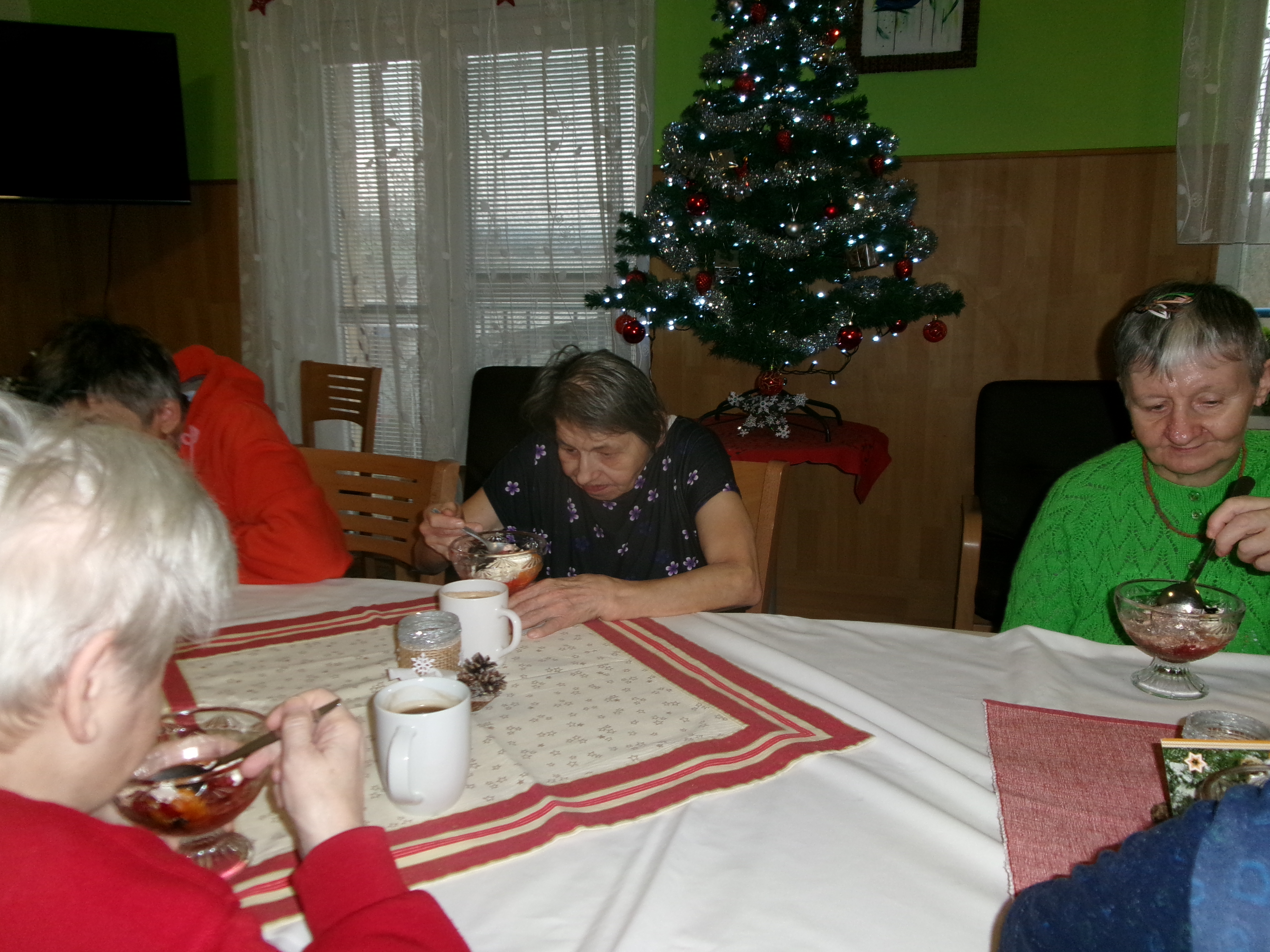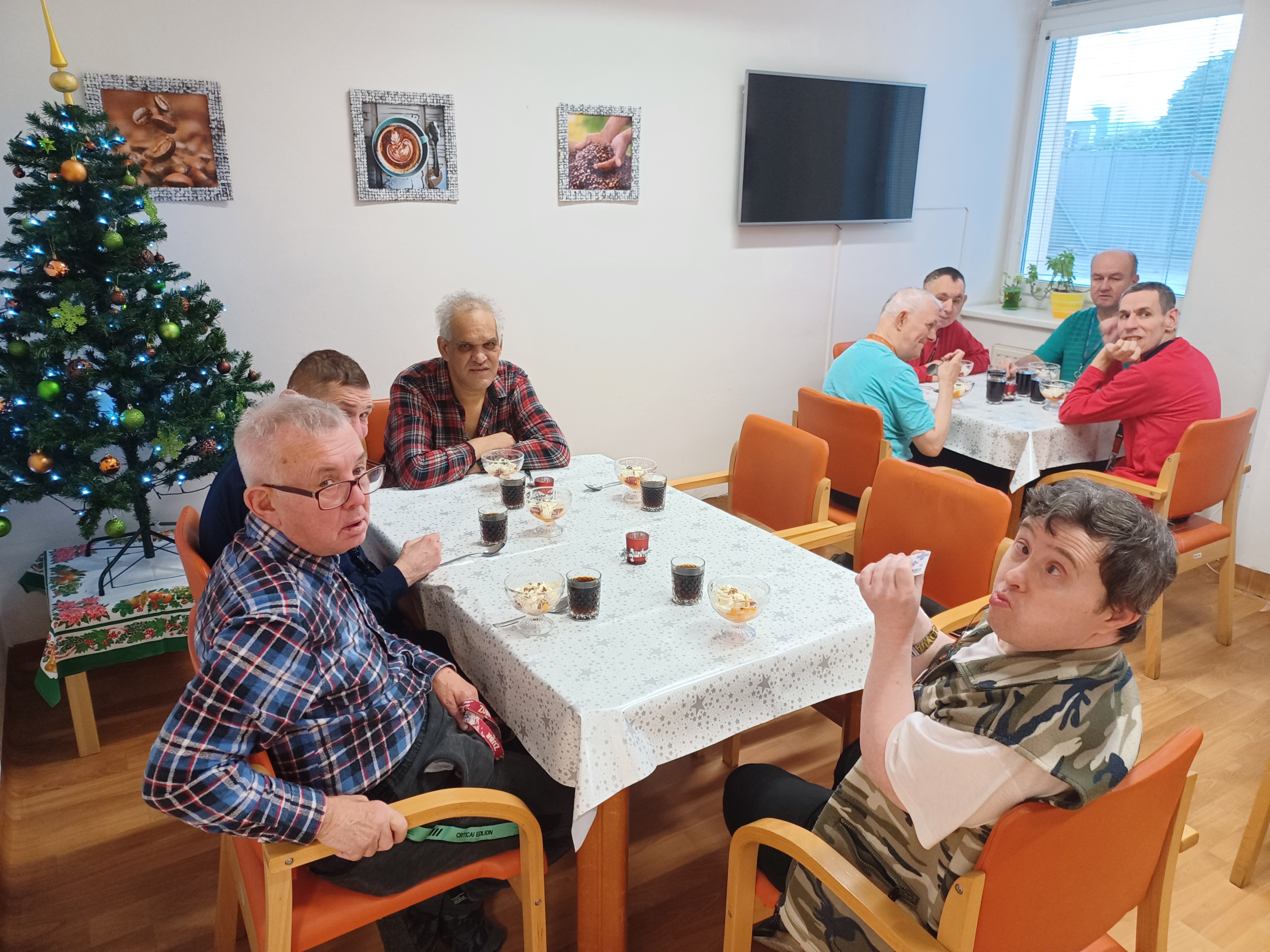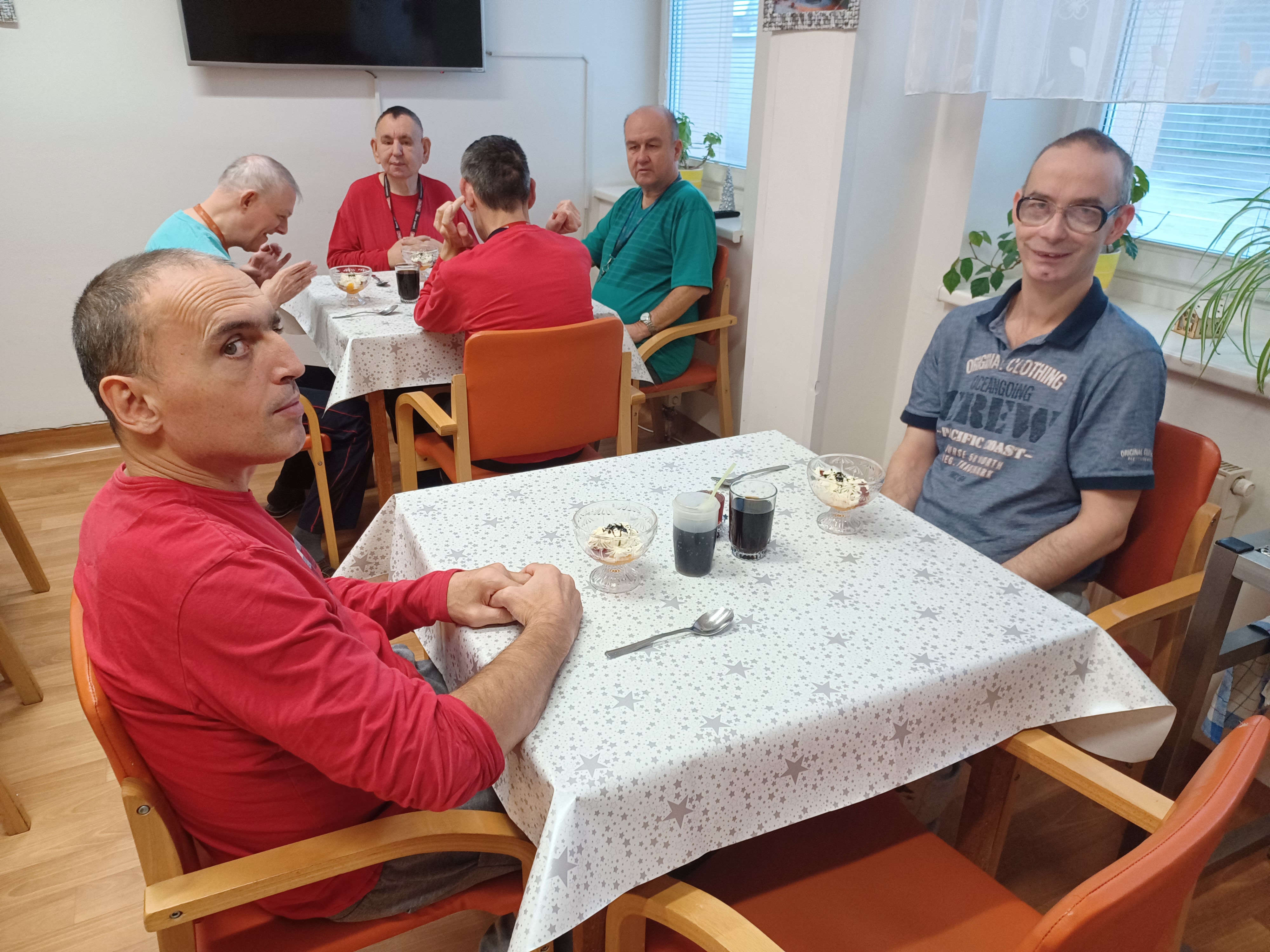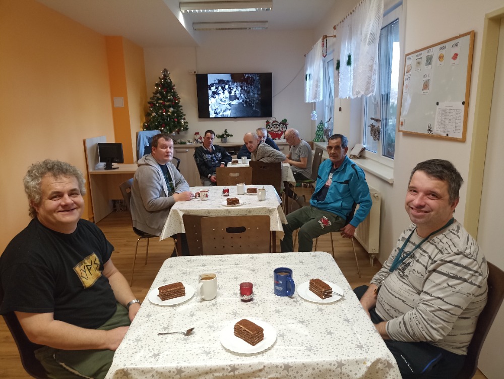 Poslední týden před Vánocemi jsme si podvakrát uspořádali posezení u nazdobených stromečků na společných jídelnách jednotlivých podlaží domova a v aktivizačních místnostech. Zazpívali jsme si koledy, popovídali o tom, co bychom si přáli najít pod stromečkem a zaposlouchali se do pohodové vánoční hudby. Přitom jsme si pochutnali na dortu Marlenka, ovocném poháru a kávičce se šlehačkou, což nám umožnily finanční prostředky dárců. Moc děkujeme.