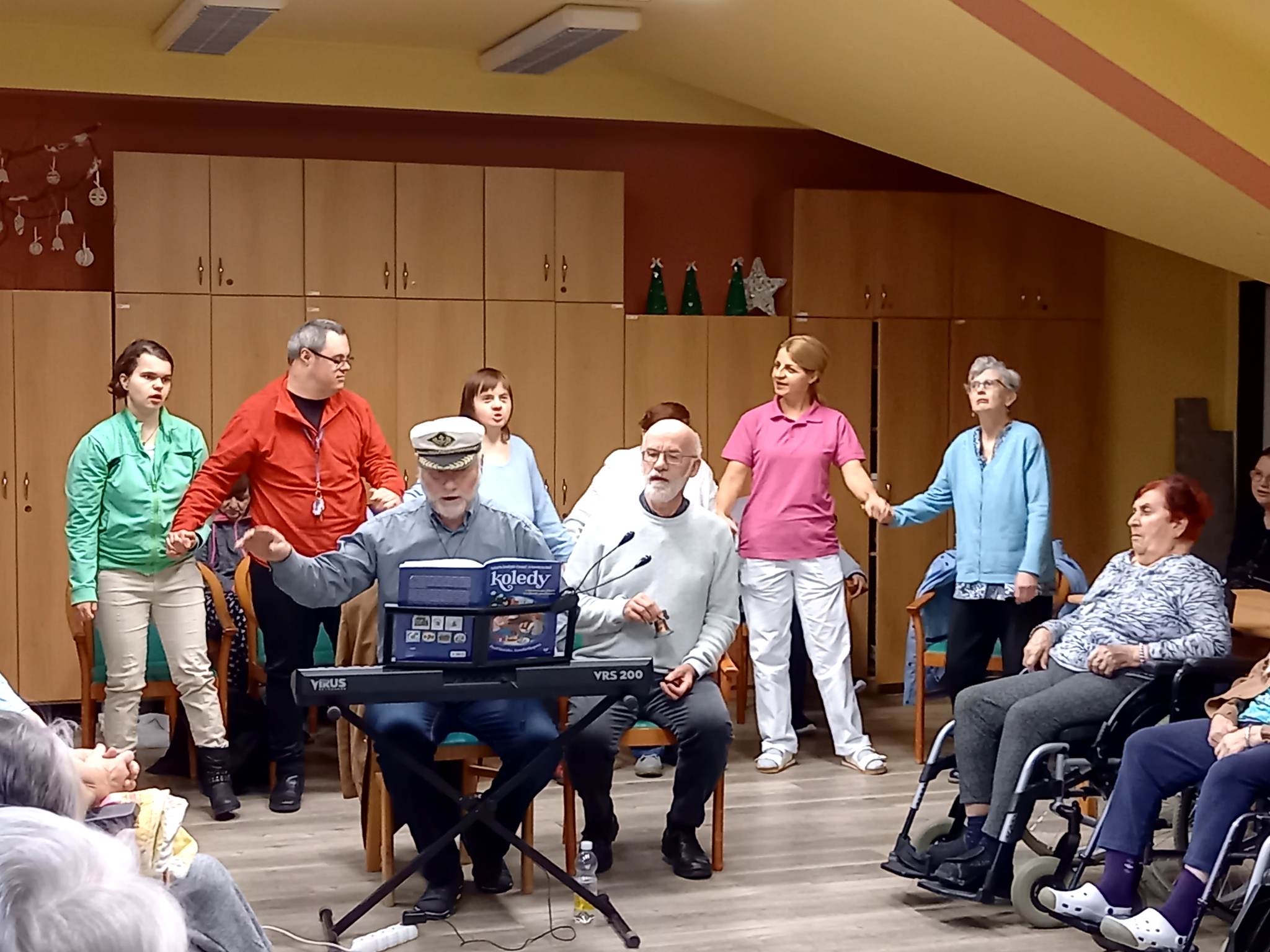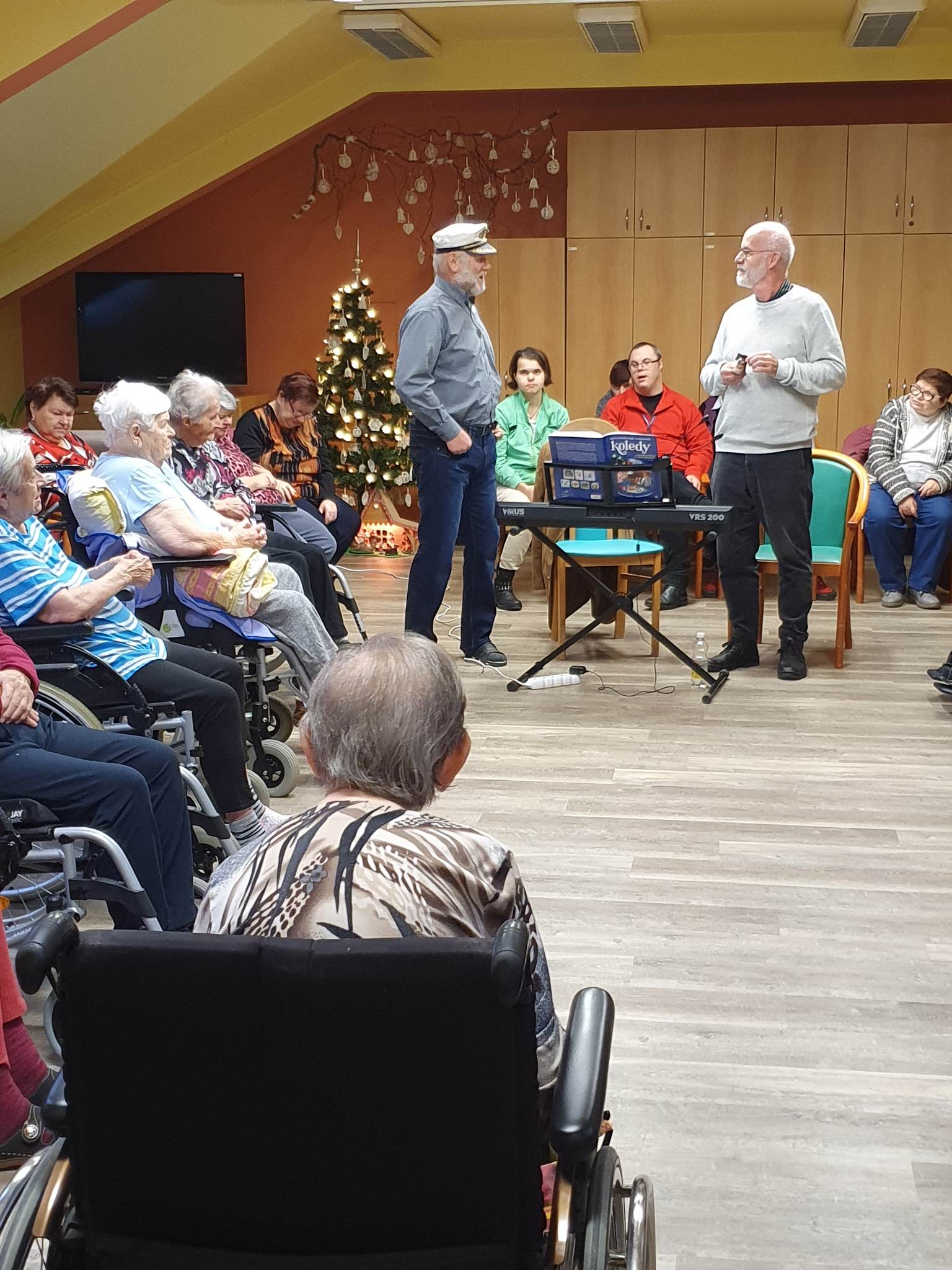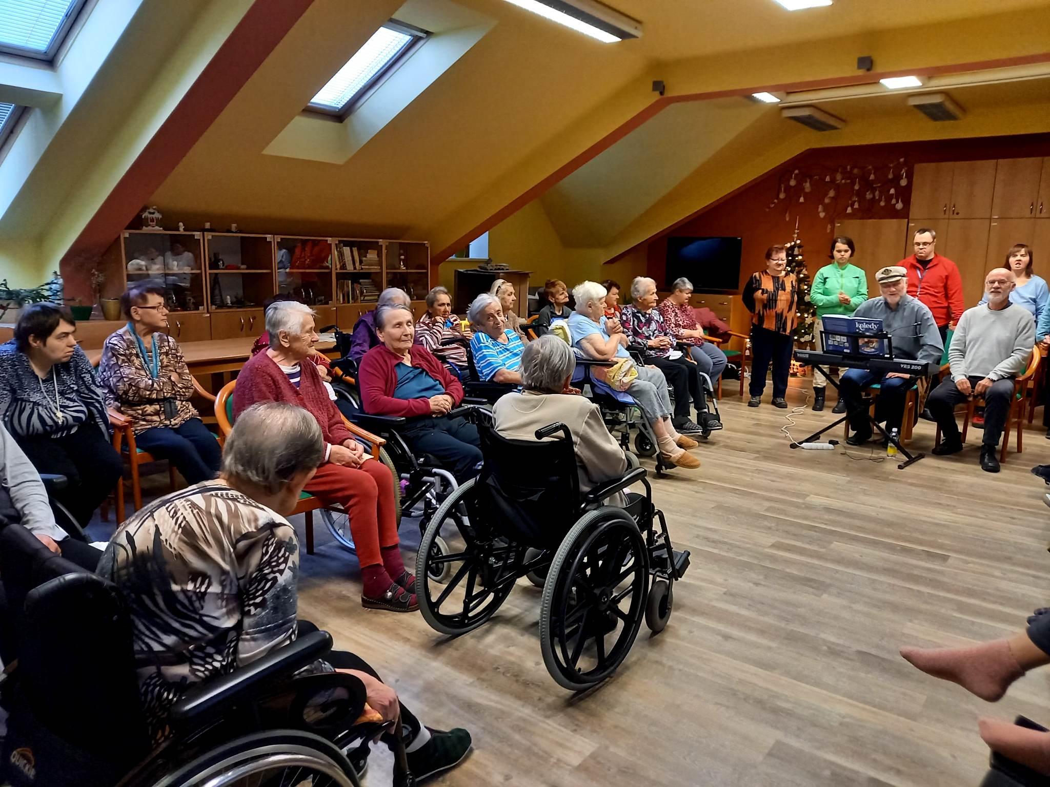 Za okny podkrovního sálu Centra Dominika Kokory se dne 14. 12. 2022 v 10.00 rozezněly zvonečky, libé tóny různých hudebních nástrojů, včetně kláves a slova vánočních koled. Venku sice mrzlo, až to jiskřilo, ale uvnitř vládla radostná a usměvavá atmosféra, neboť nás opět navštívili Olda s Pavlem expresivní terapeuti z Pedagogické fakulty Univerzity Palackého. Jejich pravidelné muzicírování a hrátky na hudební nástroje se u našich klientů těší velké oblibě. V jejich podání ožívají pro některé z nás již méně známé koledy či písně, jejichž slova jsme již zapomněly. Sotva však zazní první tóny kláves a nohy i ruce se začnou vlnit do rytmu, vše zapomenuté rázem ožije a zpívá i ten, jehož onemocnění krade slova i rým. Není důležité, jak moc se písně podobají originálu ale to, co je dělá originálními. Díky tomuto druhu vokální a instrumentální produkce se mohl každý z nás přenést tam, kde mu je nebo bylo kdysi dobře, utéct tak od tradičního předvánočního shonu a naladit se na nadcházející Vánoční svátky.