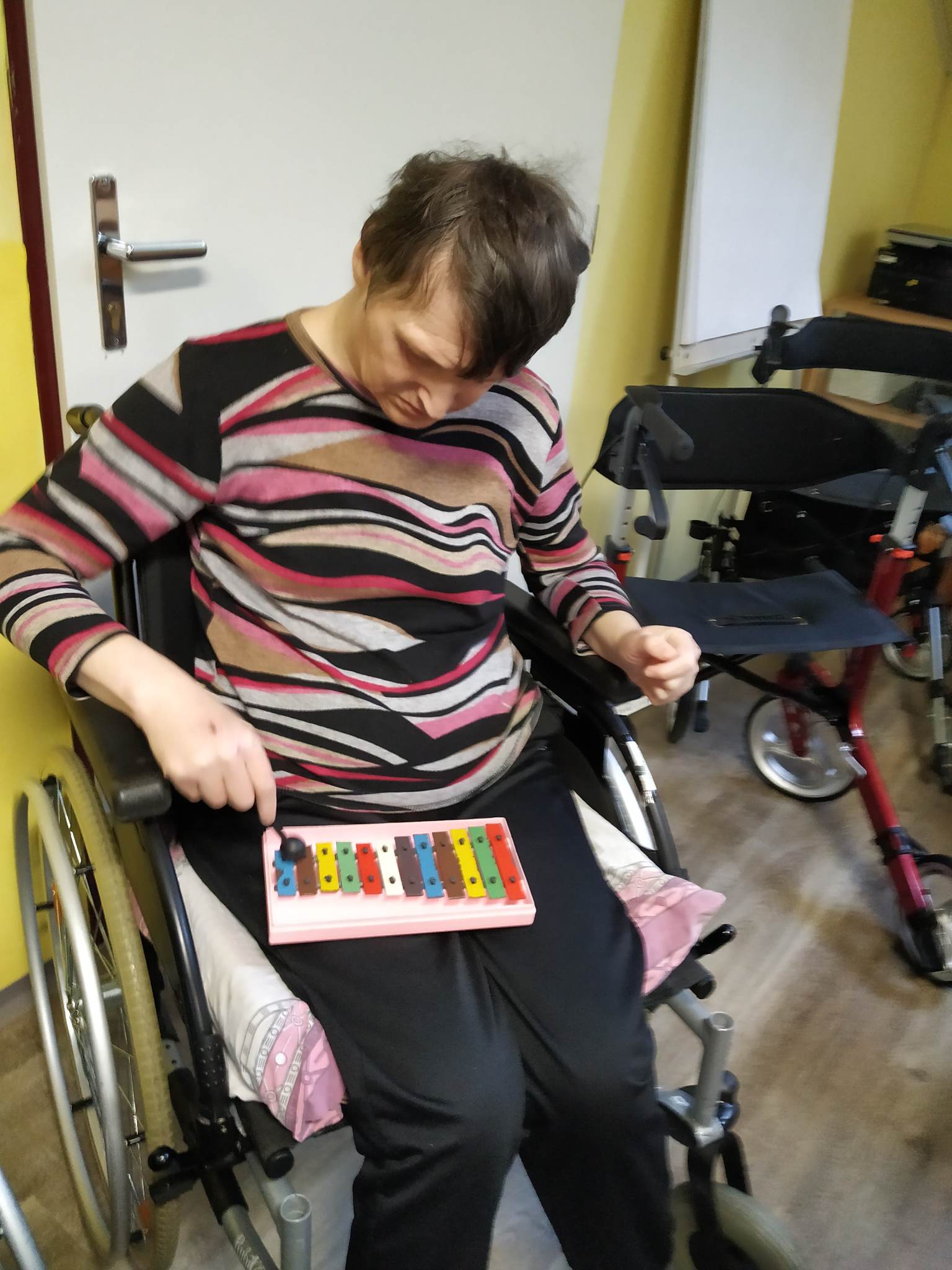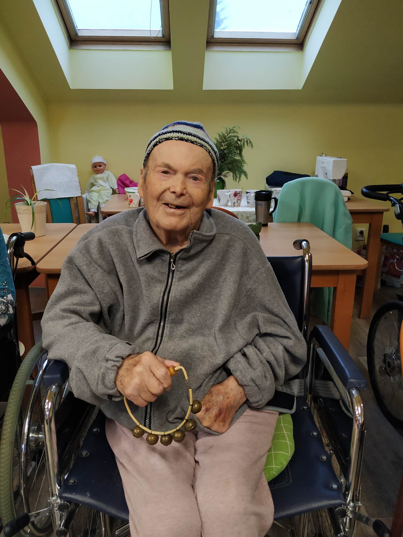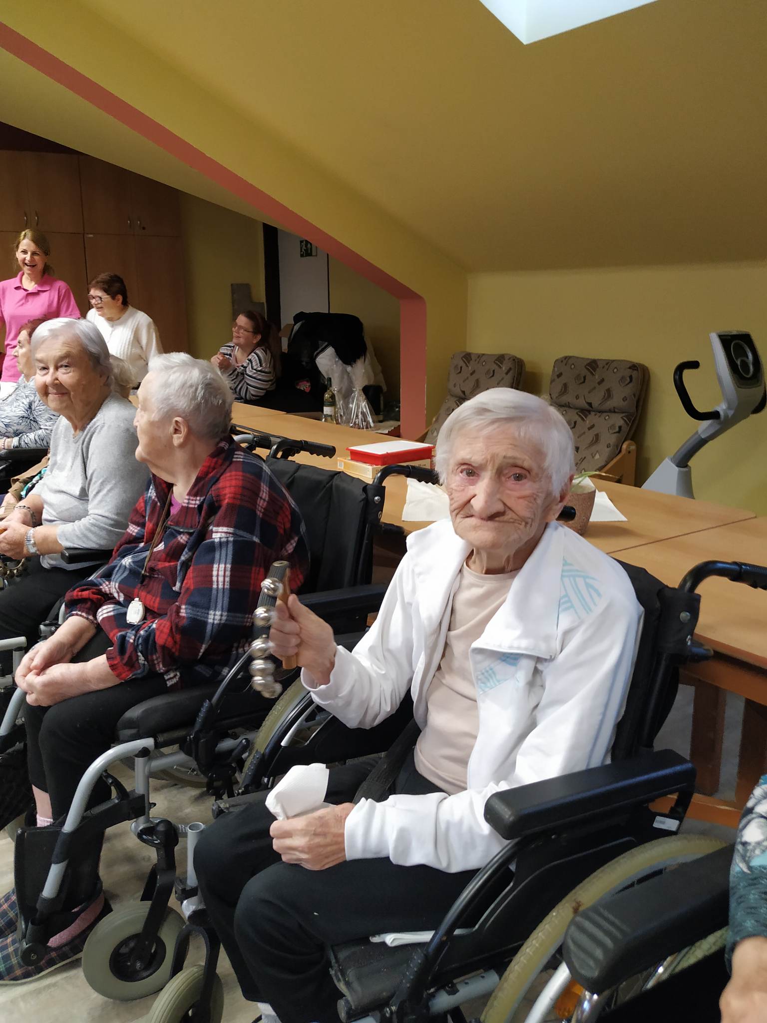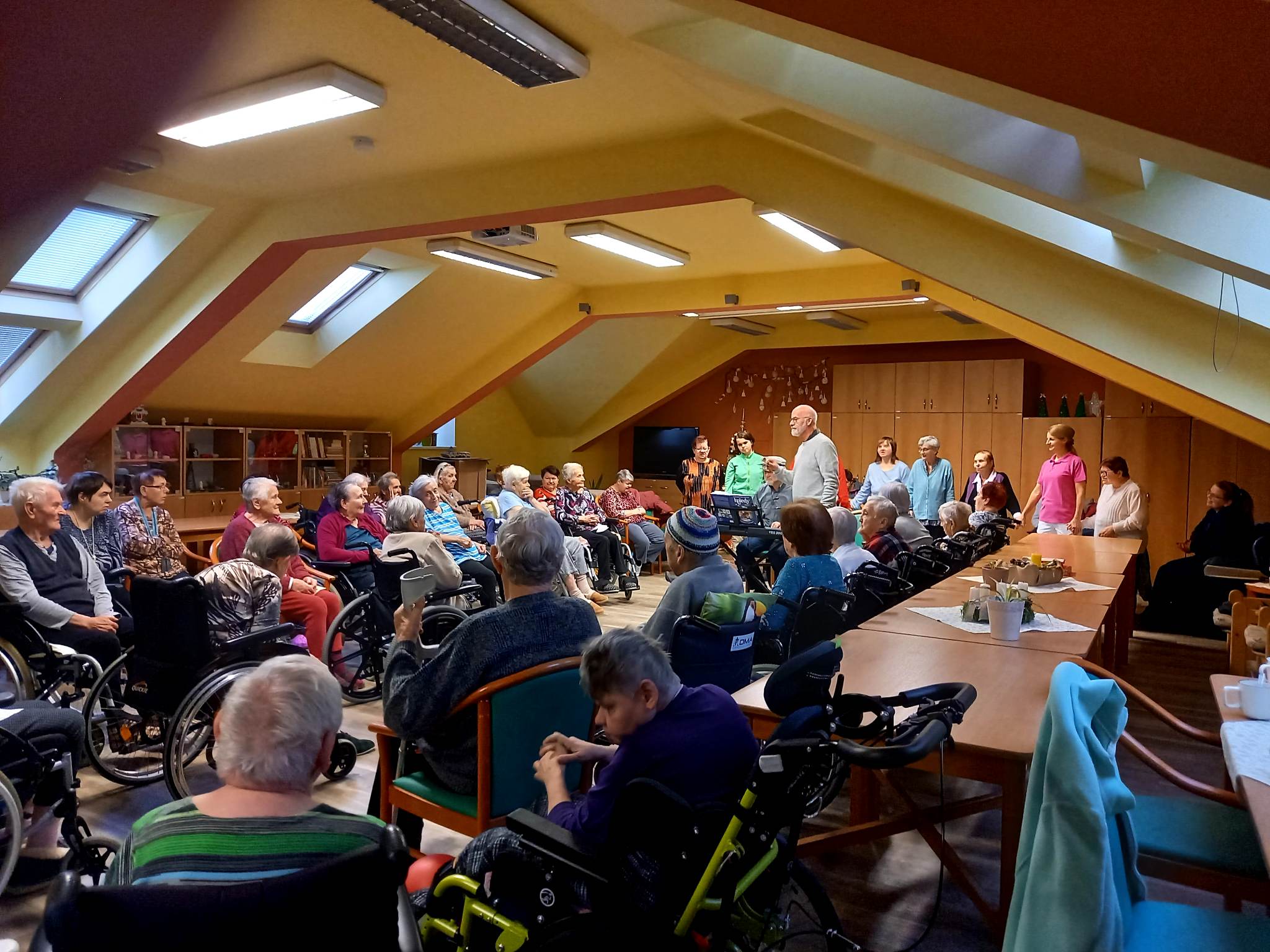 Za okny podkrovního sálu Centra Dominika Kokory se dne 14. 12. 2022 v 10.00 rozezněly zvonečky, libé tóny různých hudebních nástrojů, včetně kláves a slova vánočních koled. Venku sice mrzlo, až to jiskřilo, ale uvnitř vládla radostná a usměvavá atmosféra, neboť nás opět navštívili Olda s Pavlem expresivní terapeuti z Pedagogické fakulty Univerzity Palackého. Jejich pravidelné muzicírování a hrátky na hudební nástroje se u našich klientů těší velké oblibě. V jejich podání ožívají pro některé z nás již méně známé koledy či písně, jejichž slova jsme již zapomněly. Sotva však zazní první tóny kláves a nohy i ruce se začnou vlnit do rytmu, vše zapomenuté rázem ožije a zpívá i ten, jehož onemocnění krade slova i rým. Není důležité, jak moc se písně podobají originálu ale to, co je dělá originálními. Díky tomuto druhu vokální a instrumentální produkce se mohl každý z nás přenést tam, kde mu je nebo bylo kdysi dobře, utéct tak od tradičního předvánočního shonu a naladit se na nadcházející Vánoční svátky.