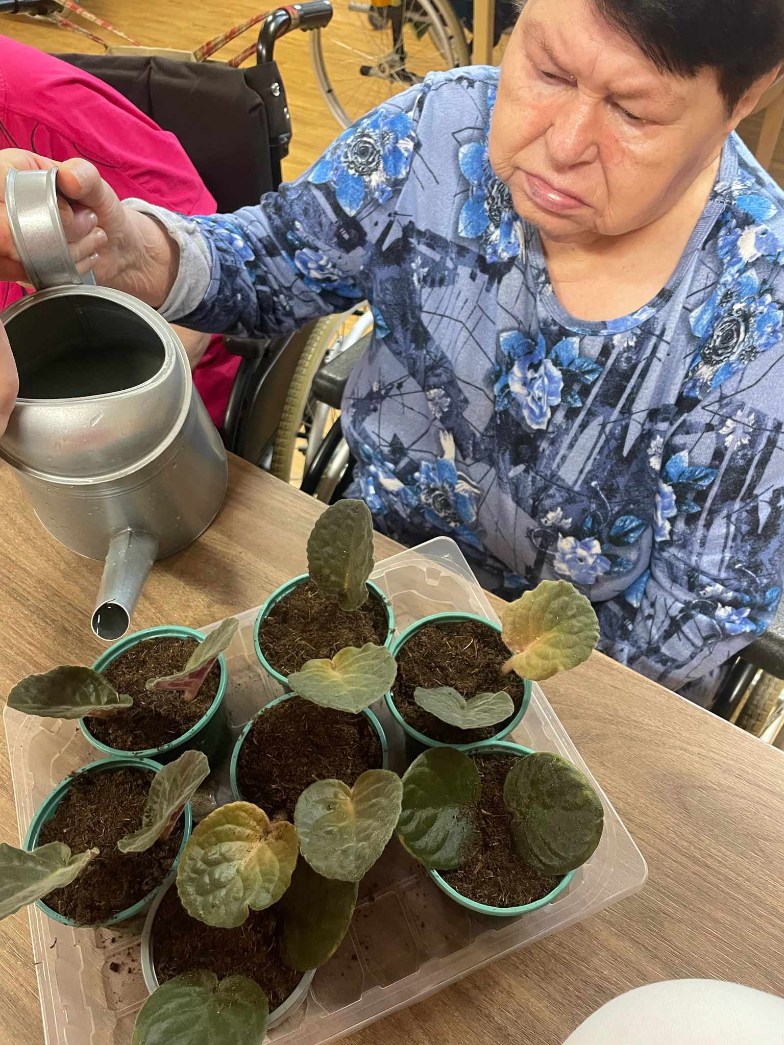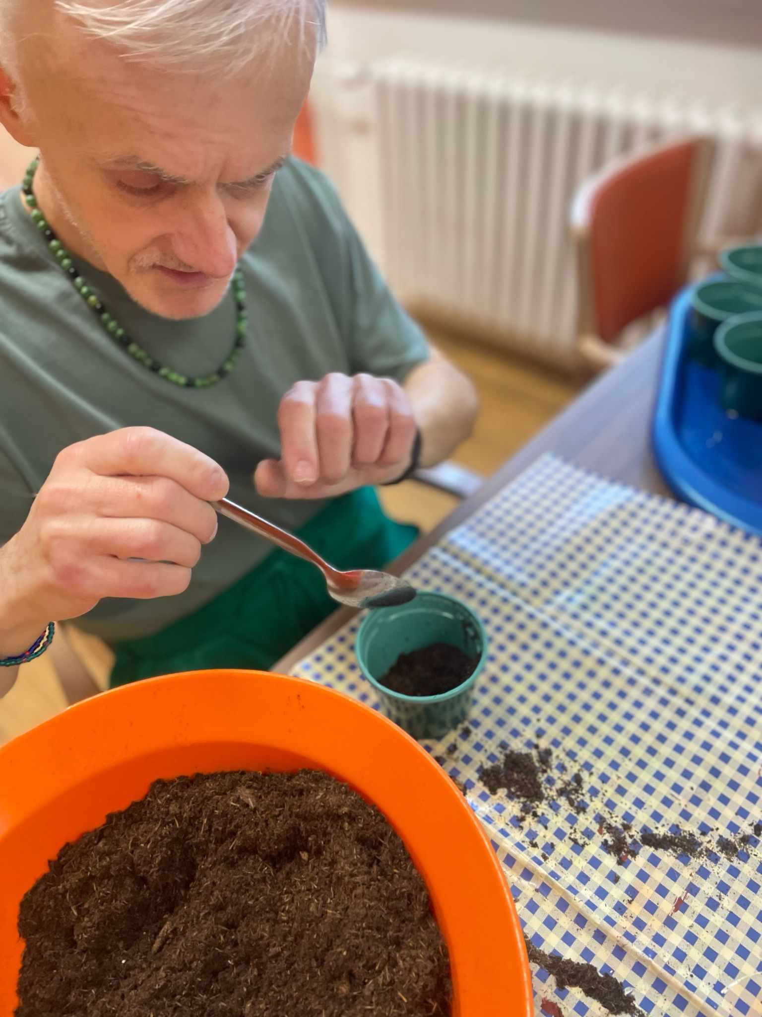 Dnes dopoledne se klienti Centra Dominika Kokory zapojili do tvůrčích a smysluplných aktivit spojených s příchodem jara. Hlavní činností bylo sázení fialek, které nejen přineslo radost, ale zároveň podpořilo jemnou motoriku a smyslovou stimulaci. Každý měl příležitost naplnit květináč hlínou, zasadit mladé rostlinky a následně se o ně postarat pravidelným zaléváním.