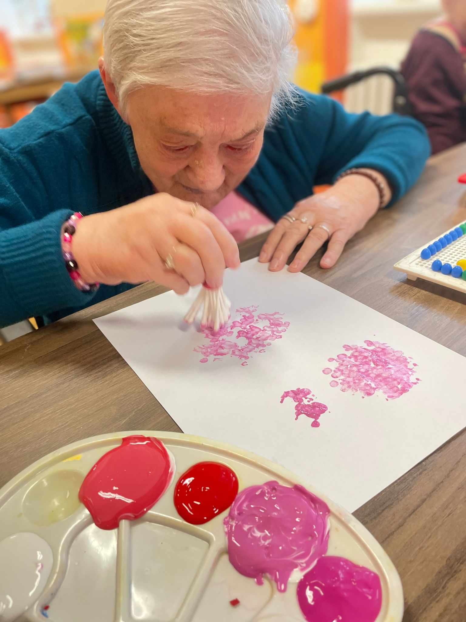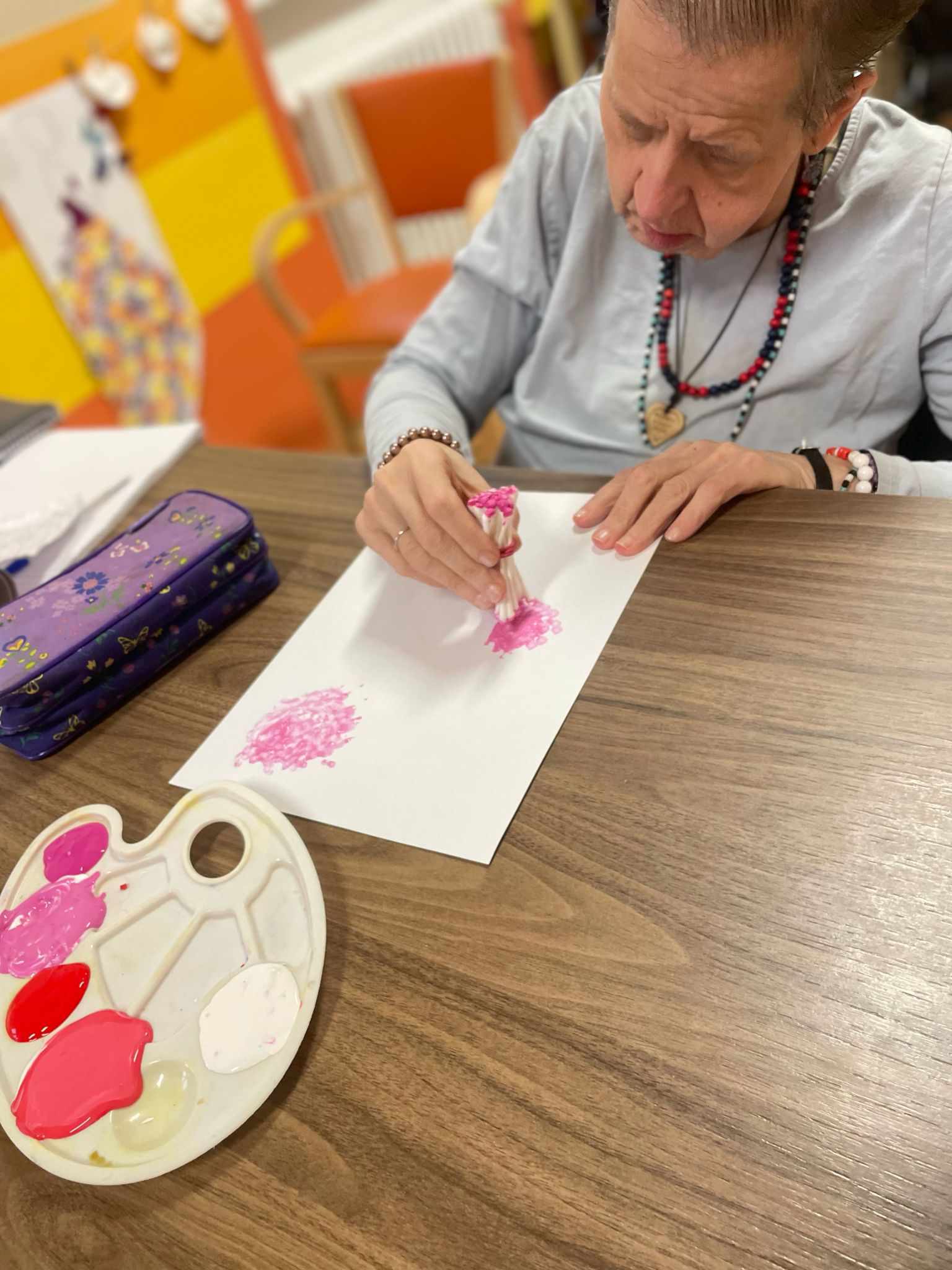 Tuto zahradnickou činnost doplnila výtvarná tvorba inspirovaná probouzející se přírodou. Klienti pomocí různých technik nanášeli barvy a vytvářeli otisky připomínající rozkvetlé květiny. Jemné odstíny růžové a červené dodaly jejich dílům svěžest a živost. Kreativní proces jim umožnil projevit fantazii a vytvořit jedinečné obrazy.