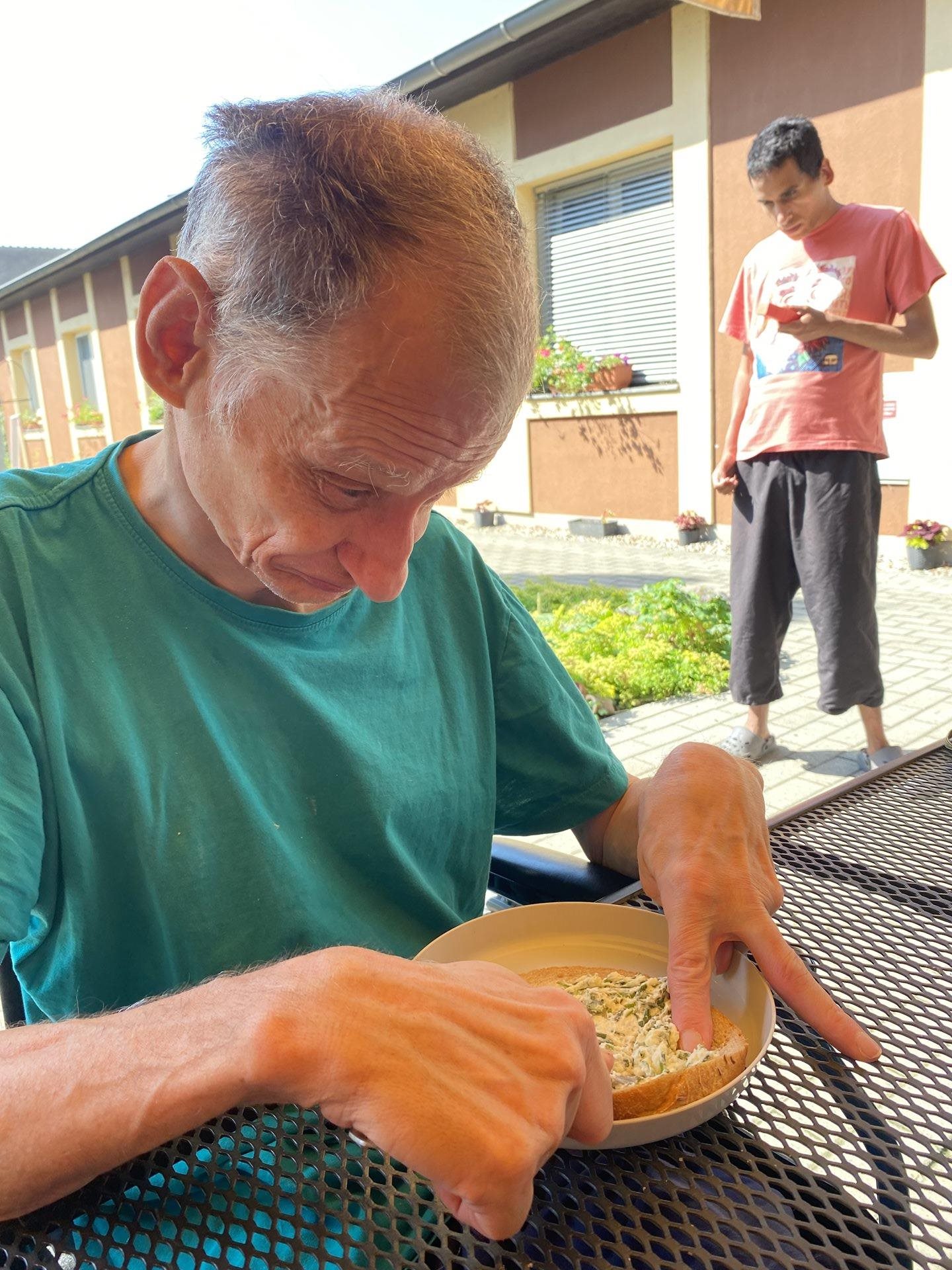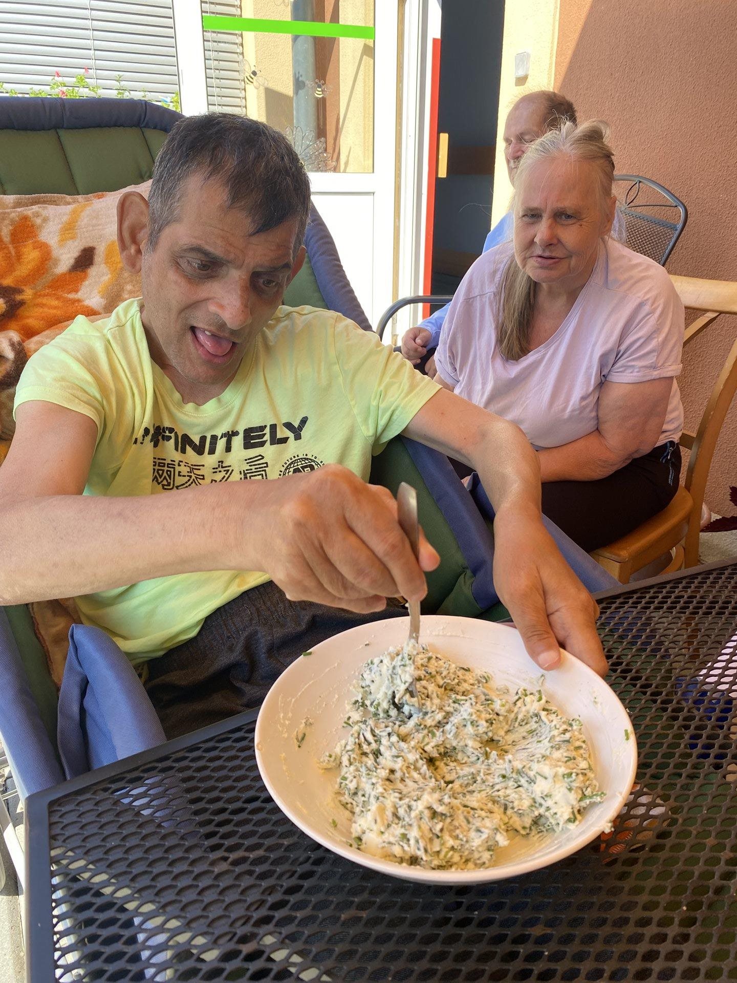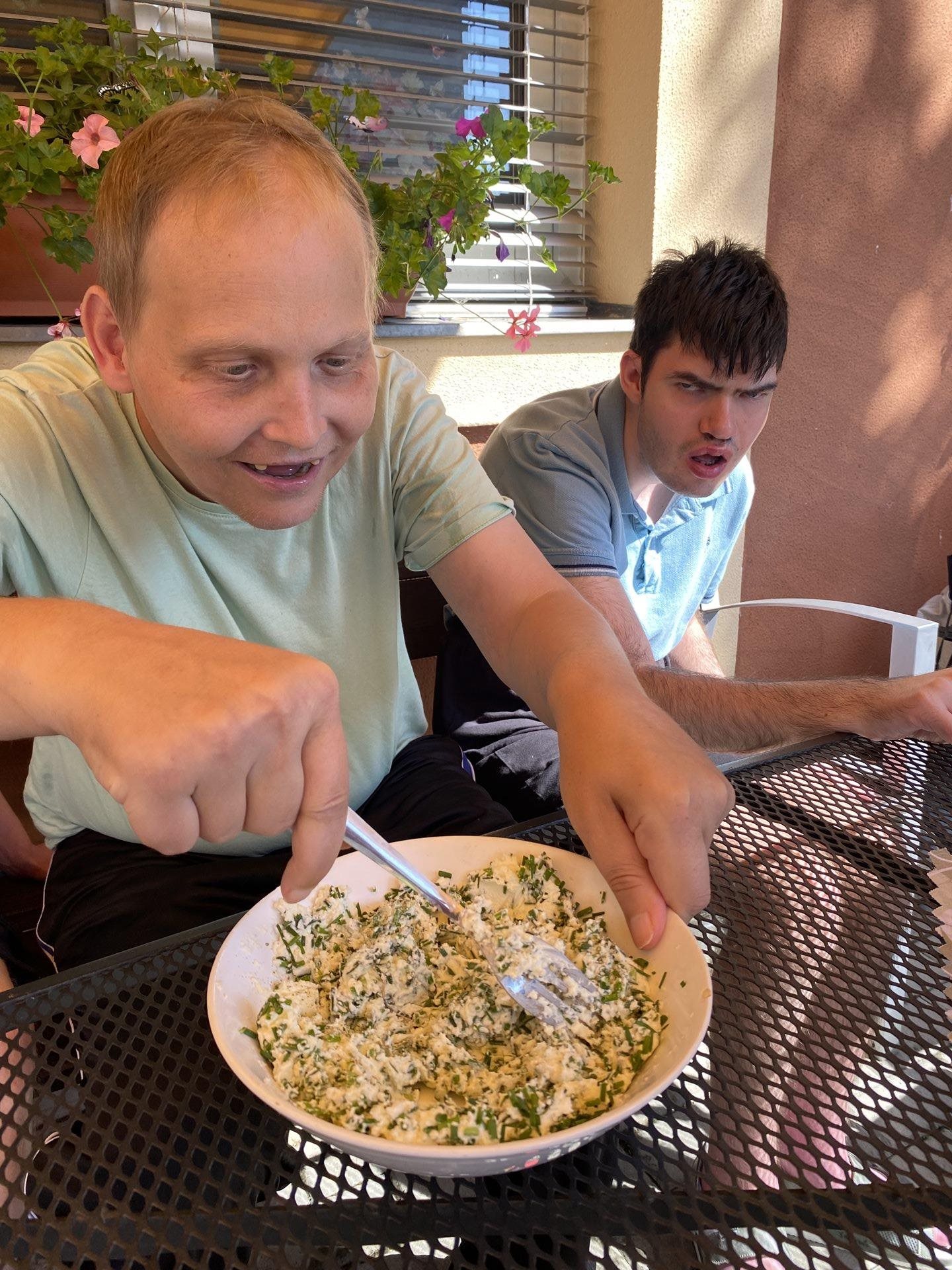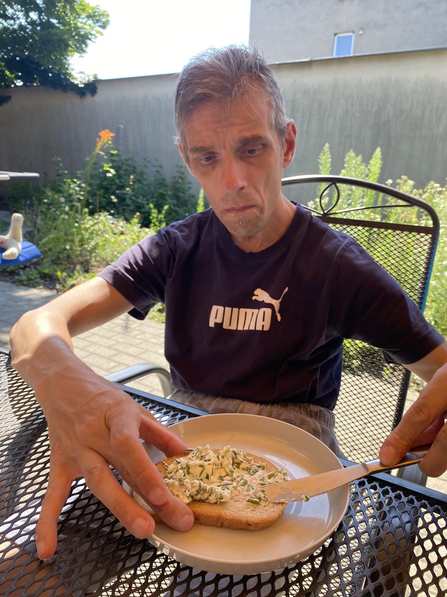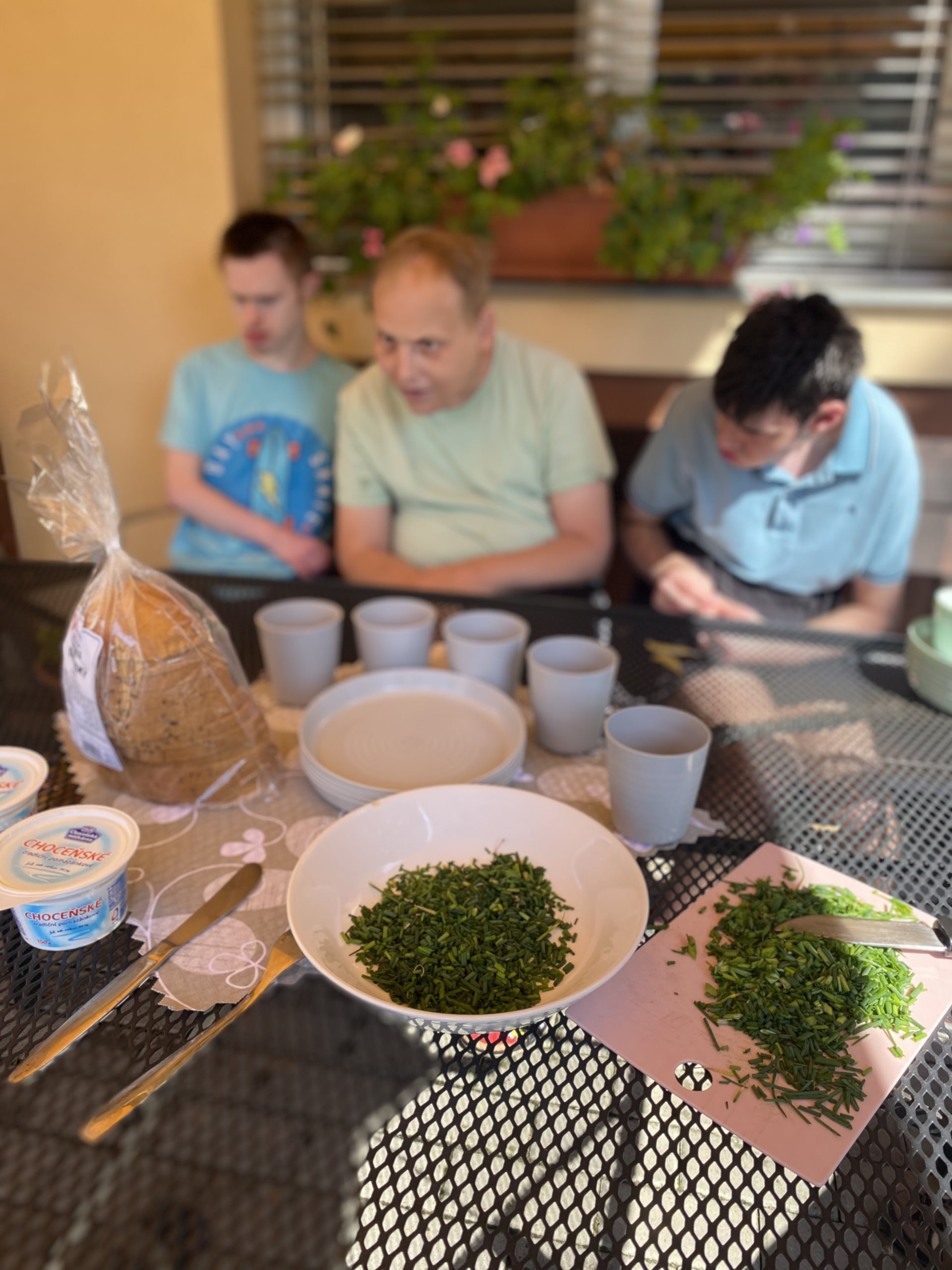 Pomazánku s velkým podílem pažitky máme velmi rádi. Pěstujeme si pažitku v zahrádce na několika místech a ať je počasí slunné nebo deštivé, pažitce se u nás daří. Připravili jsme si pomazánkové máslo, bylinkovou sůl a hodně pažitky. V jednoduchosti je síla a tohle spojení je dokonalé. Občas si pomazánku ozvláštníme štiplavou cibulkou a nebo pomazánkové máslo vyměníme za jemný tvaroh. K jídlu jsme si připravili i bylinkovou limonádu s citronem a parádně jsme si pochutnali. Byl to příjemný svěží letní den.
