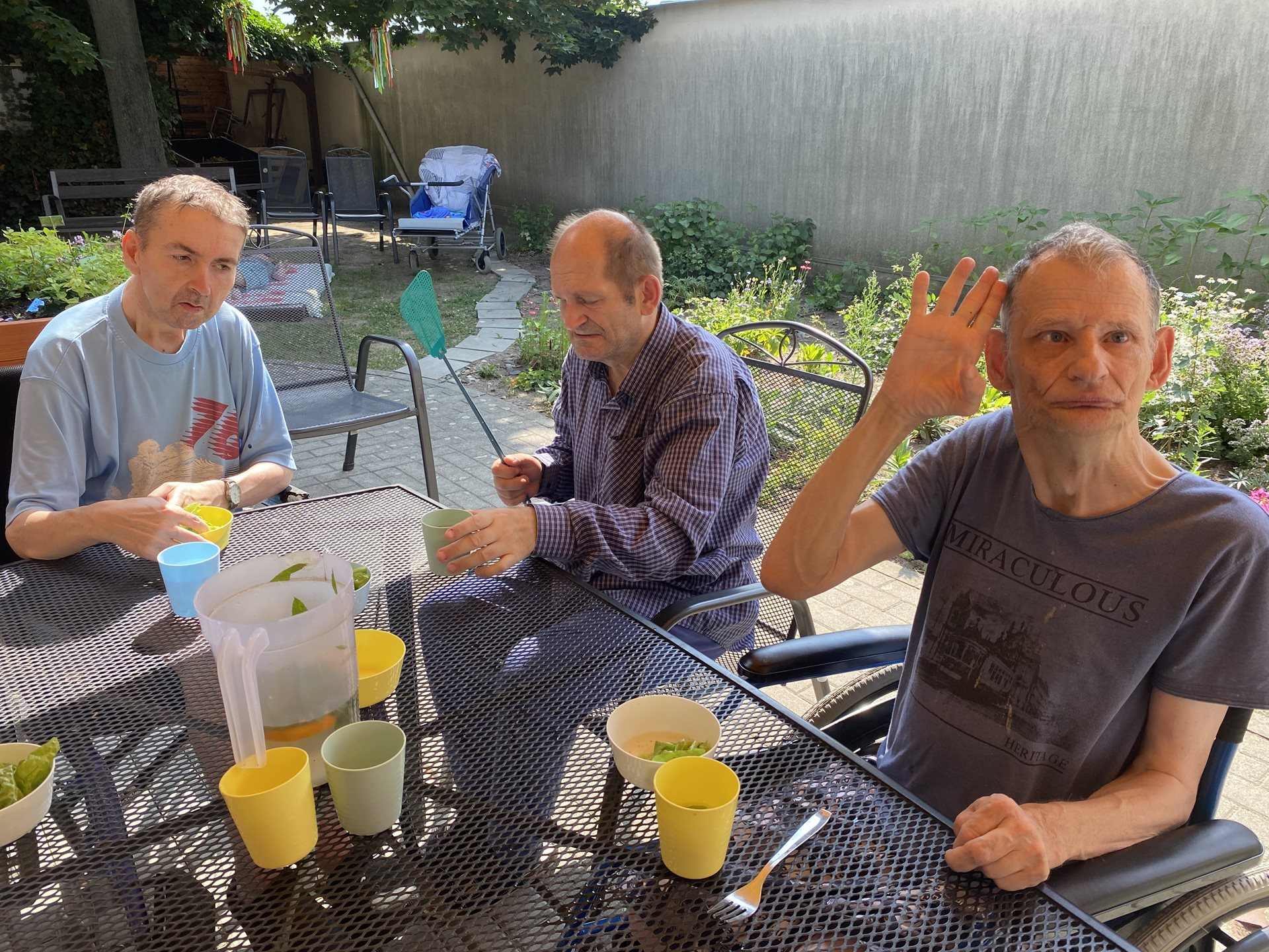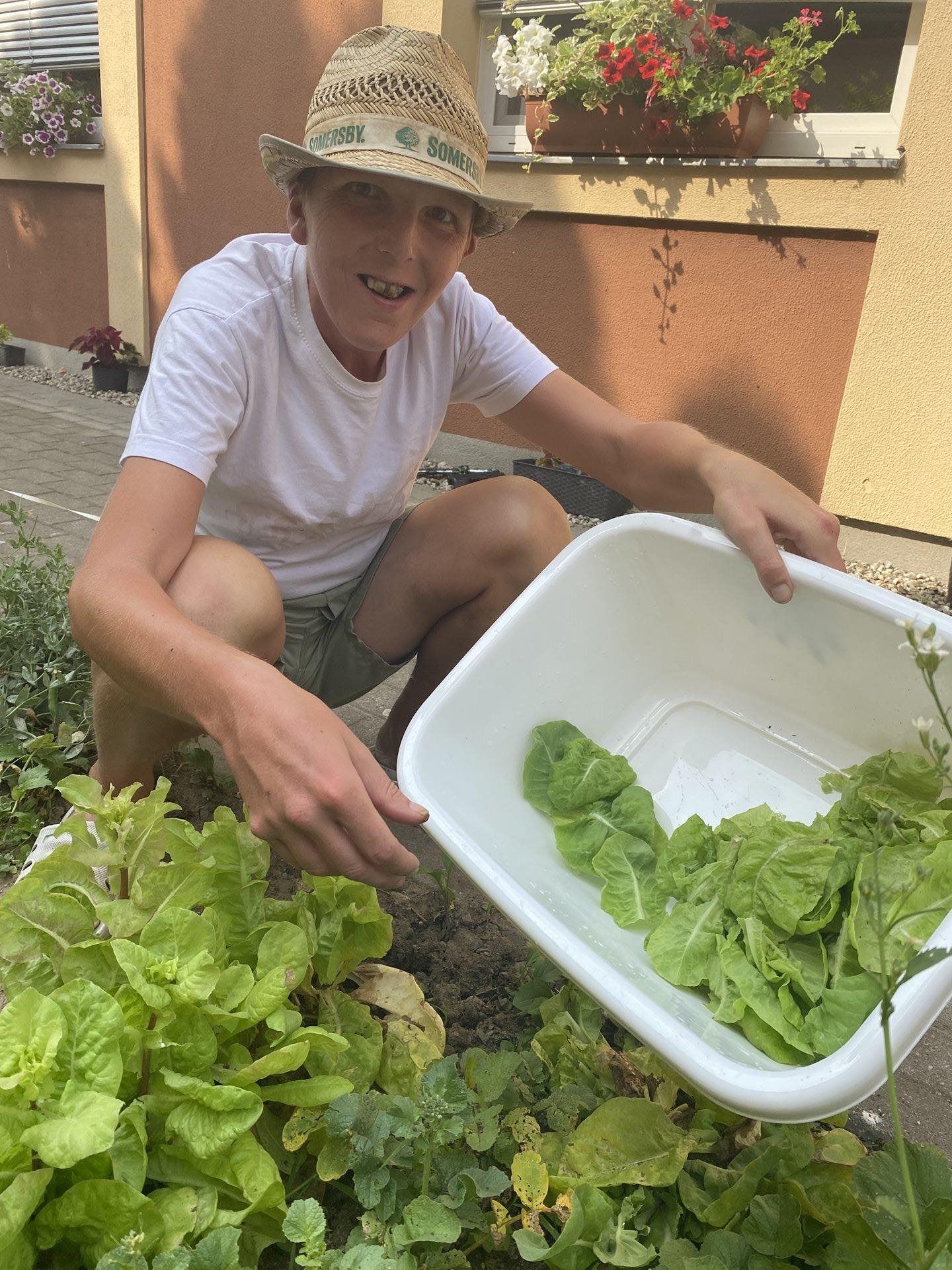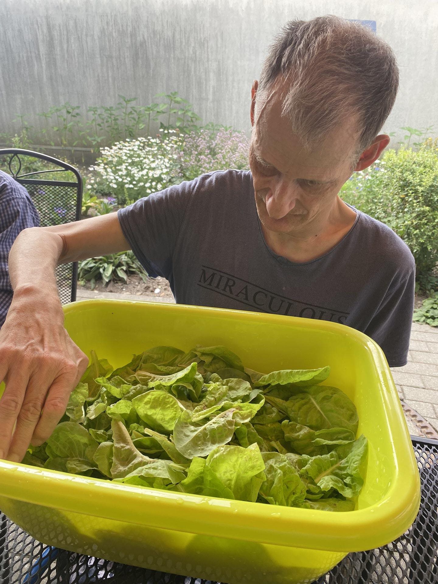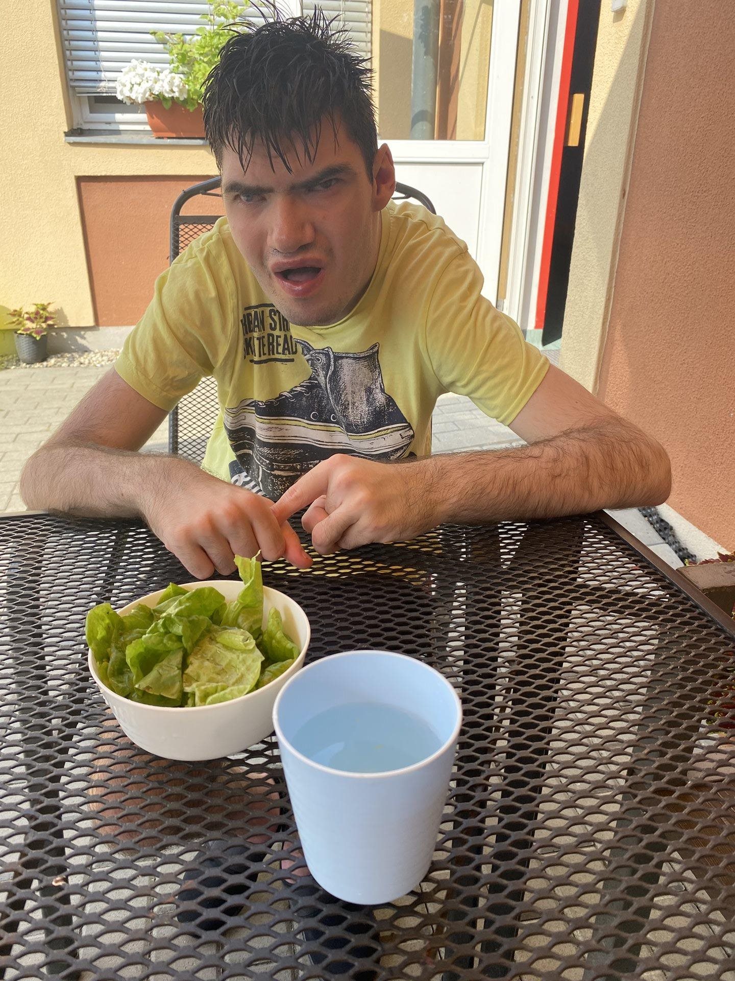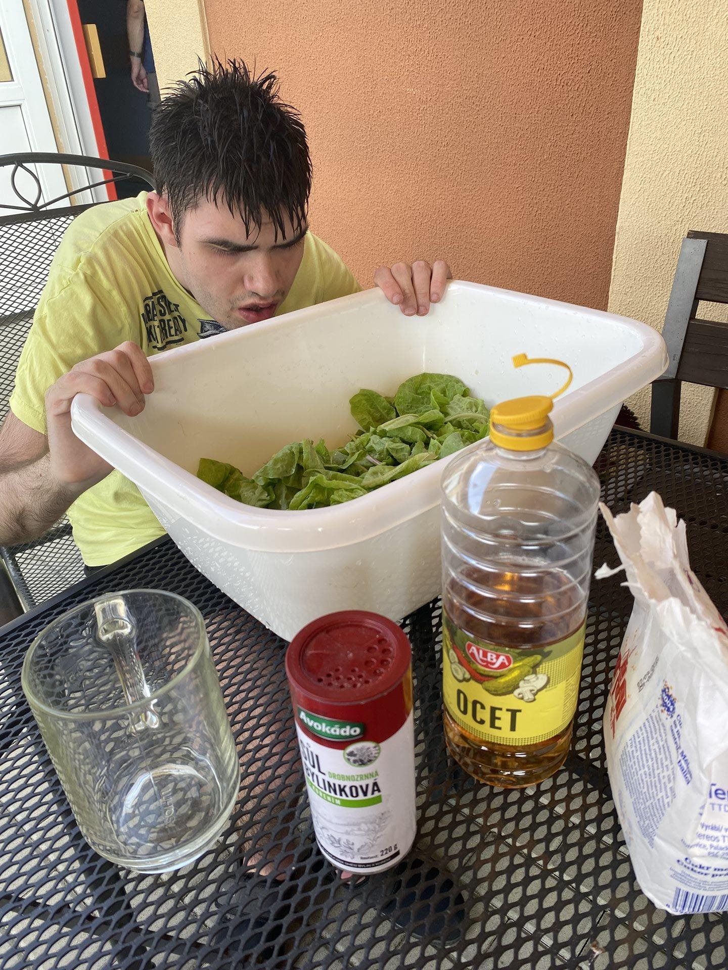 Hlávkový salát je plný vitamínů a minerálů, je také zdrojem kyseliny listové. Saláty také obsahují vlákninu, její množství se liší v závislosti na odrůdě. My jsme se dnes rozhodli si sklidit salát z naší zahrádky, který si sami pěstujeme. Listy jsme otrhali, několikrát ve studené vodě oprali. Připravili jsme si sladkokyselý nálev z vody, cukru, octu a bylinkové soli. Zalili jsme moučkový cukr teplou vodou, aby se nám rozpustil. Pak jsme do nálevu přidali ocet a rozmíchali vidličkou. Přidali jsme bylinkovou sůl, černý pepř a zředili jsme nálev vychlazenou vodou. Promíchali jsme a nechali ještě chvilku vychladit. Poté jsme do nálevu vložili pečlivě umyté okapané listy salátu a venku na zahrádce jsme si na něm poté pochutnali.