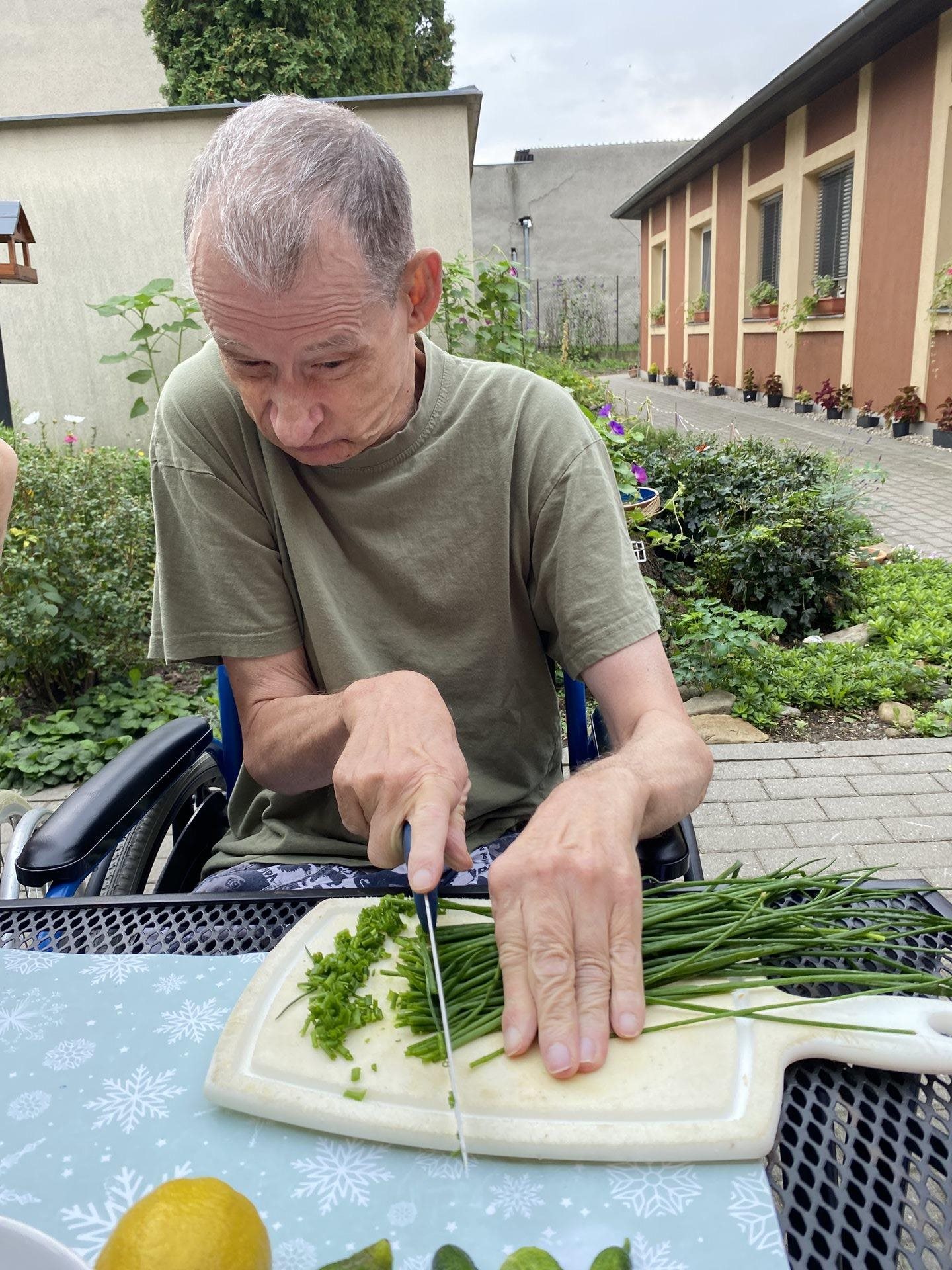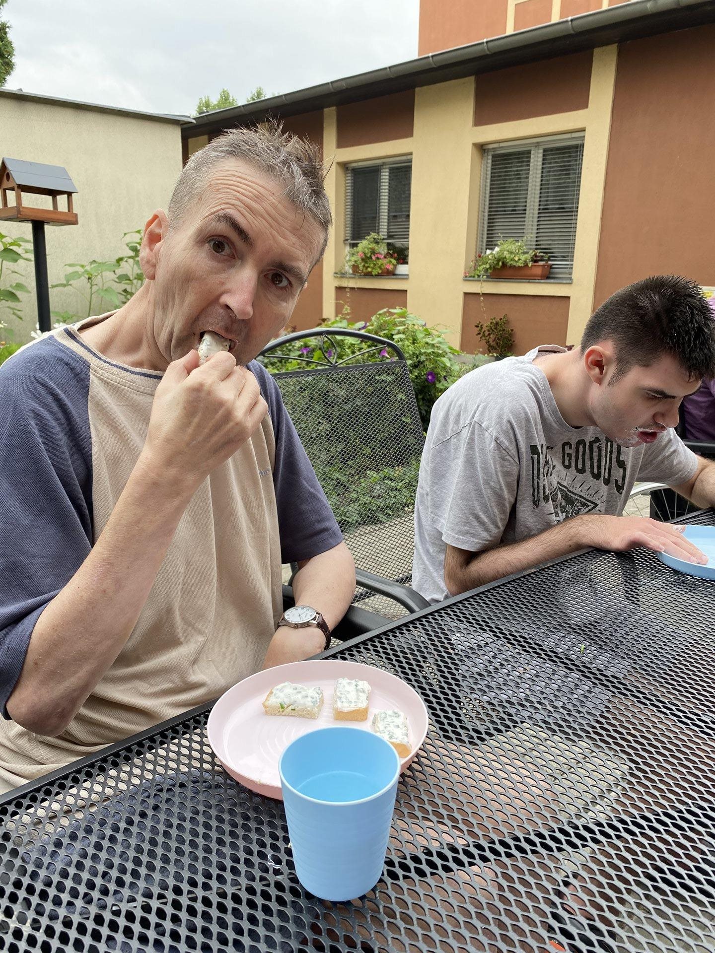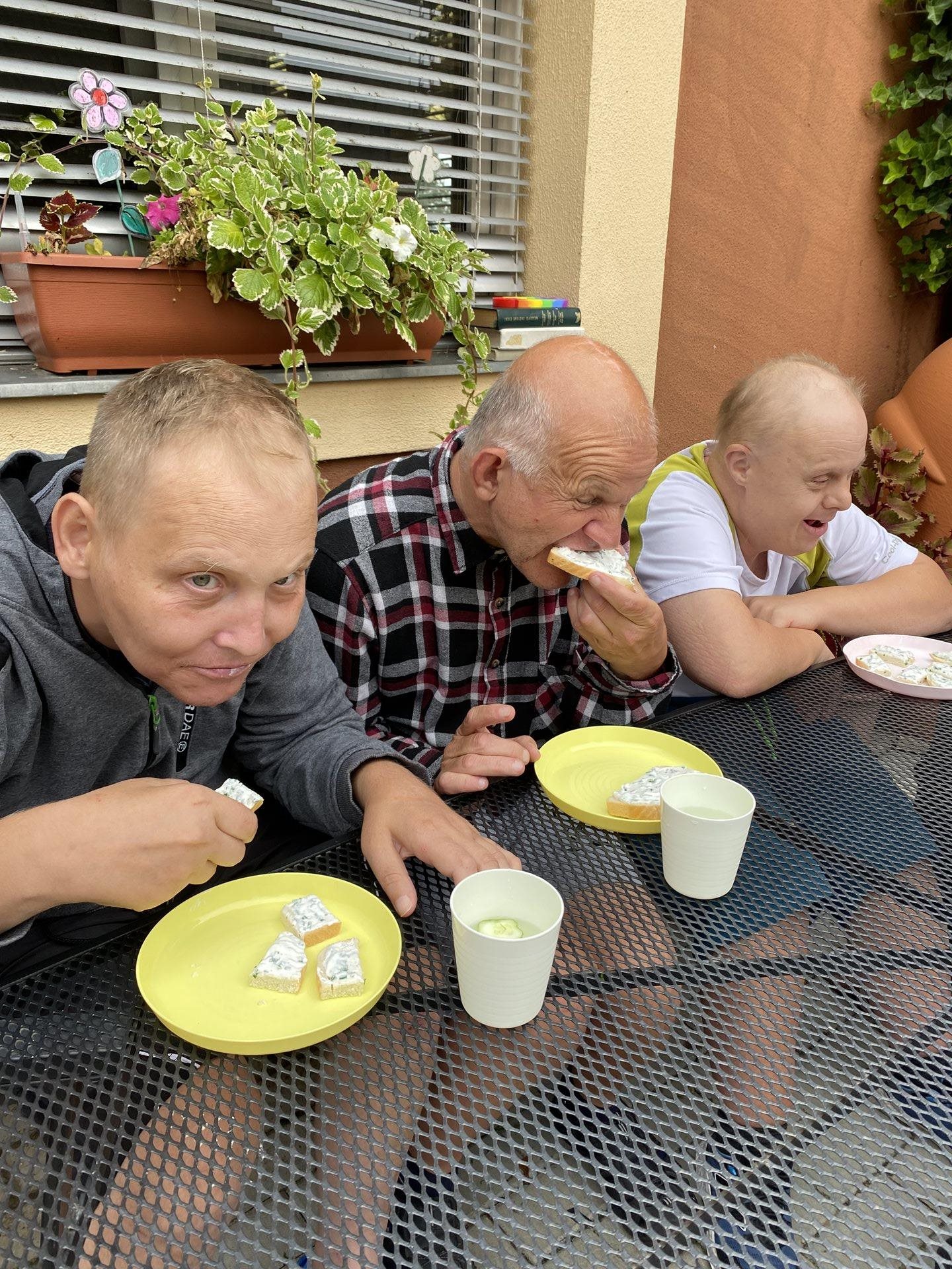 Na zahrádce nám krásně roste pažitka, z čehož máme velikou radost. Je jí stále dost a tak jsme se rozhodli, že si připravíme tvarohovou pomazánku s touto voňavou bylinkou. Pažitku jsme opláchli, nakrájeli najemno, v misce jsme rozmíchali tvaroh a pažitku jsme k němu přidali. Použili jsme také bylinkovou sůl, která nám pomazánku báječně dochutila. Jako pečivo jsme si koupili toustový chléb, na který jsme pomazánku namazali, vše nakrájeli na jednohubky a velmi si na všem pochutnali.