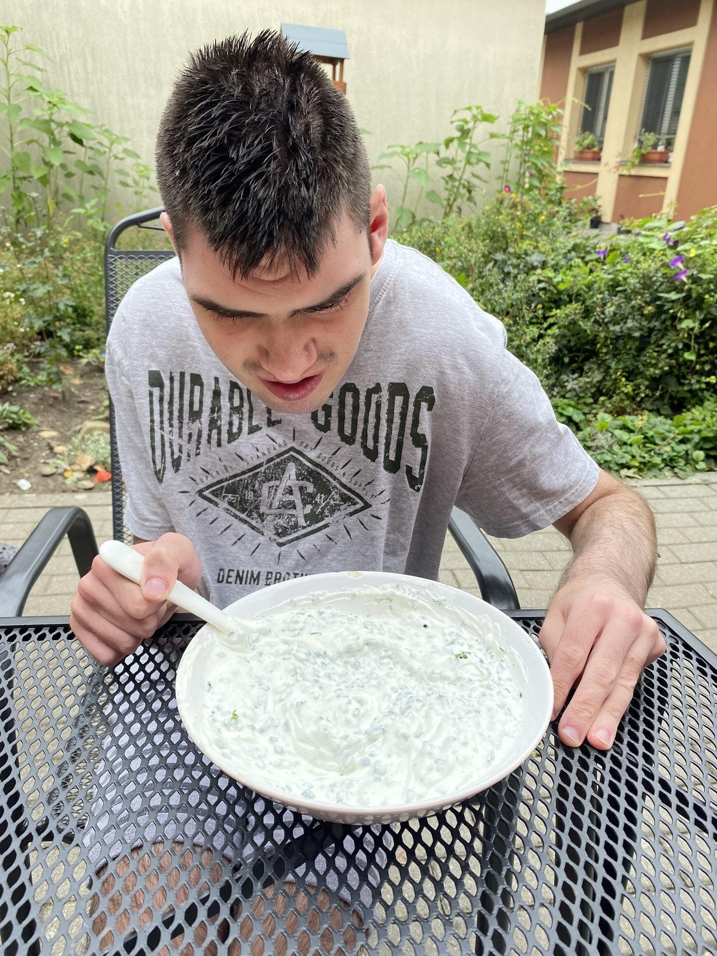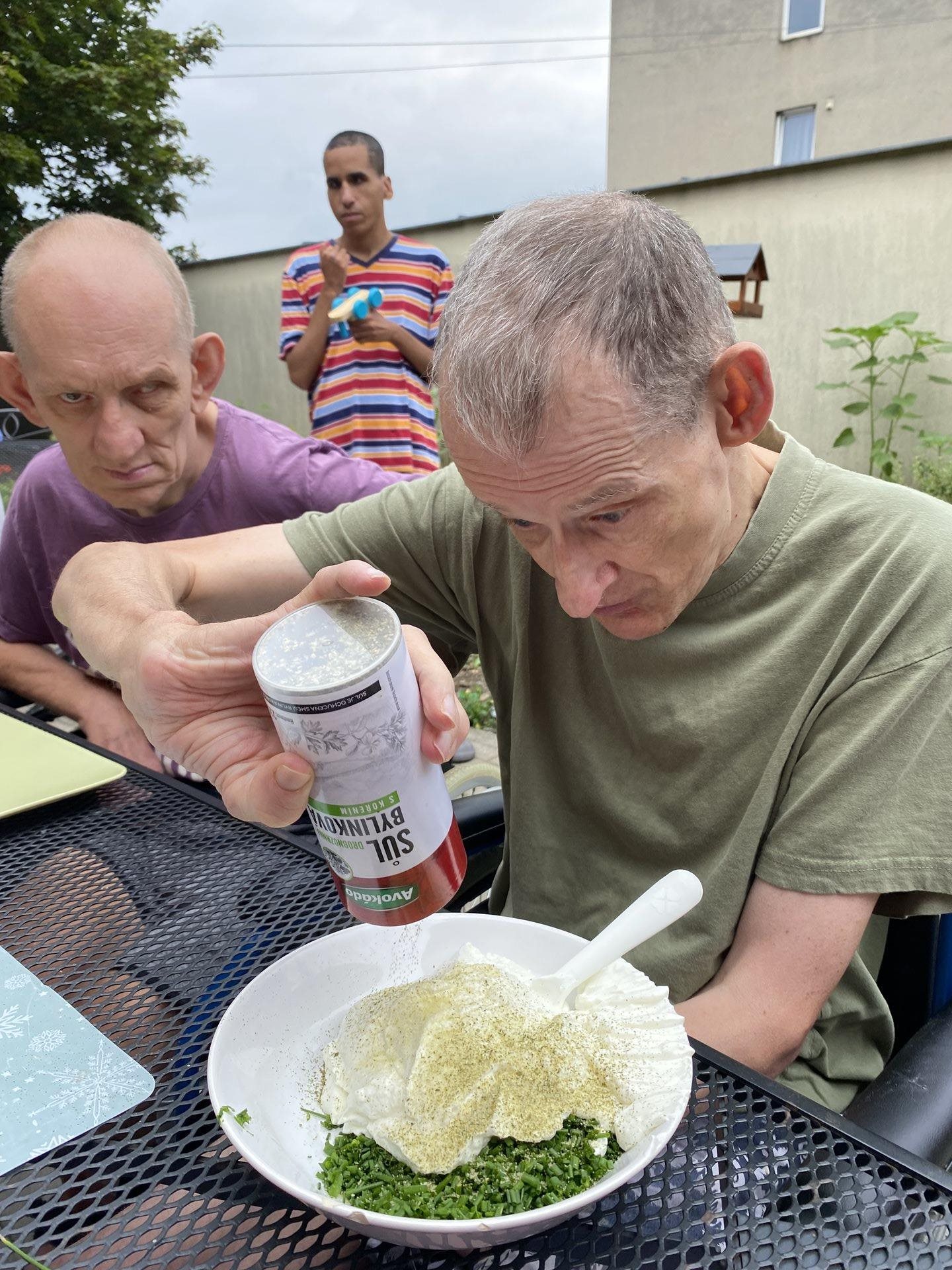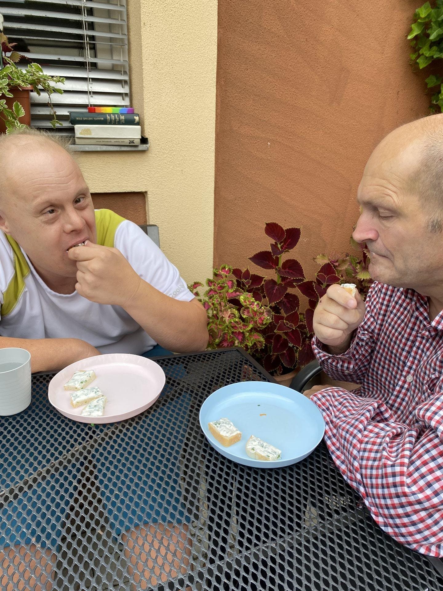Na zahrádce nám krásně roste pažitka, z čehož máme velikou radost. Je jí stále dost a tak jsme se rozhodli, že si připravíme tvarohovou pomazánku s touto voňavou bylinkou. Pažitku jsme opláchli, nakrájeli najemno, v misce jsme rozmíchali tvaroh a pažitku jsme k němu přidali. Použili jsme také bylinkovou sůl, která nám pomazánku báječně dochutila. Jako pečivo jsme si koupili toustový chléb, na který jsme pomazánku namazali, vše nakrájeli na jednohubky a velmi si na všem pochutnali.