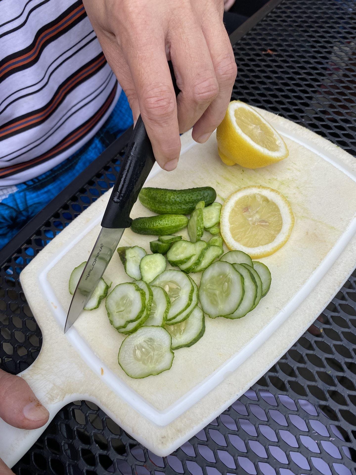 Také jsme si přichystali domácí limonádu z citronu, do které jsme přidali námi vypěstované okurky a mátu.
