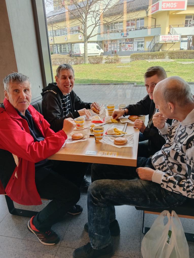 Po kulturním zážitku jsme se rozhodli, že si uděláme radost něčím dobrým. Zamířili jsme do nově otevřeného McDonald's Přerov. Dali jsme si klasiku – hranolky a hamburger, což přišlo vhod úplně všem. Bylo to takové pohodové zakončení dopoledne. Smáli jsme se, povídali si a užívali si společný čas. Nakonec jsme si ještě dopřáli kafe a zákusek, abychom to zakončili hezky sladce. To už jsme jen seděli, relaxovali a vstřebávali celý výlet. Celkově to byl moc fajn den a všichni jsme odjížděli s dobrou náladou.