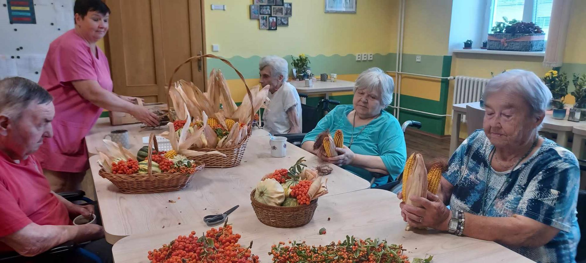 Poslední sobotní srpnové dopoledne proběhlo u seniorů v duchu smyslové aktivizace na téma "Dožínky". Čekalo je voňavé překvapení v podobě "stolů hojnosti" v jídelně, které byly plné nasušených nebo i čerstvých obilovin, makovic, kukuřičných klasů a šustí, bylin a různých druhů trvanlivé zeleniny. Následovalo povídání o významu a tradicích dožínek, o dožínkovém věnci, paběrkářích, kláskování... O všem, co souviselo s tímto obdobím a naši senioři si pamatovali. Rozpovídali se k tomuto období svého života, kdy chodili pomáhat na pole a do sadů svým prarodičům. Povídání provázelo tvoření dekoračních košíků a váz hojnosti z plodů pole a zahrádky. A jelikož nesměly chybět hlavně obilniny, vytvořili si dle lidové tradice i "poslední snop". Zde jsme ale improvizovali a obilniny uvázali do kytice, aby nám mohla dekorovat hlavní chodbu na oddělení. Seniory velmi potěšilo držet v dlaních i malé dýně, máslové dýně, cuketu a baklažán. Vznikly sázky, kolik vlastně váží. Všechny výrobky pak senioři v doprovodu personálu odvezli na chodbu, aby se podívali a rozhodli, jak budou umístěné vedle sebe, aby vše co nejvíce odpovídalo jejich vzpomínkám a zkušenostem v souvislosti se zvyky, tradicemi a pranostikami.