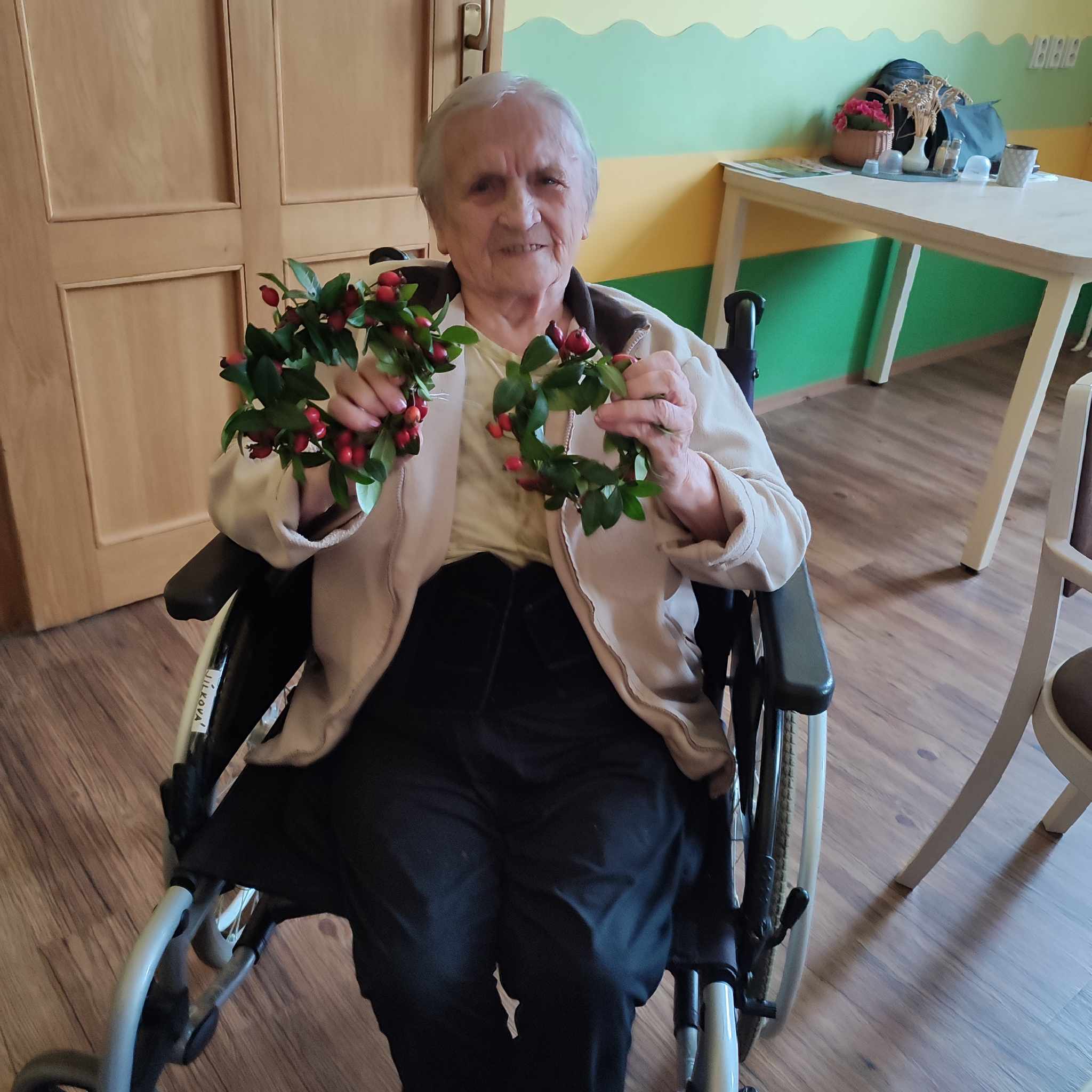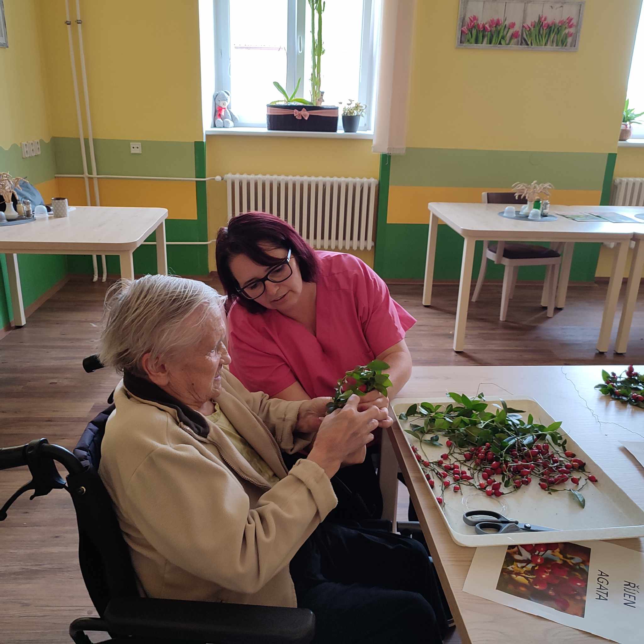 V rámci této individuální smyslové aktivizace jsme se seniorkou vzpomínaly, jaké má šípek vlastnosti, že je to zdroj bohatý na vitamin C. Dále, že se šípky suší nebo se z nich dělá marmeláda. Seniorka také zavzpomínala, kde všude v jejím okolí šípky rostly. Tato plodina se dá krásně využít na podzimní dekorace, a tak si seniorka za pomoci personálu vyrobila věneček.