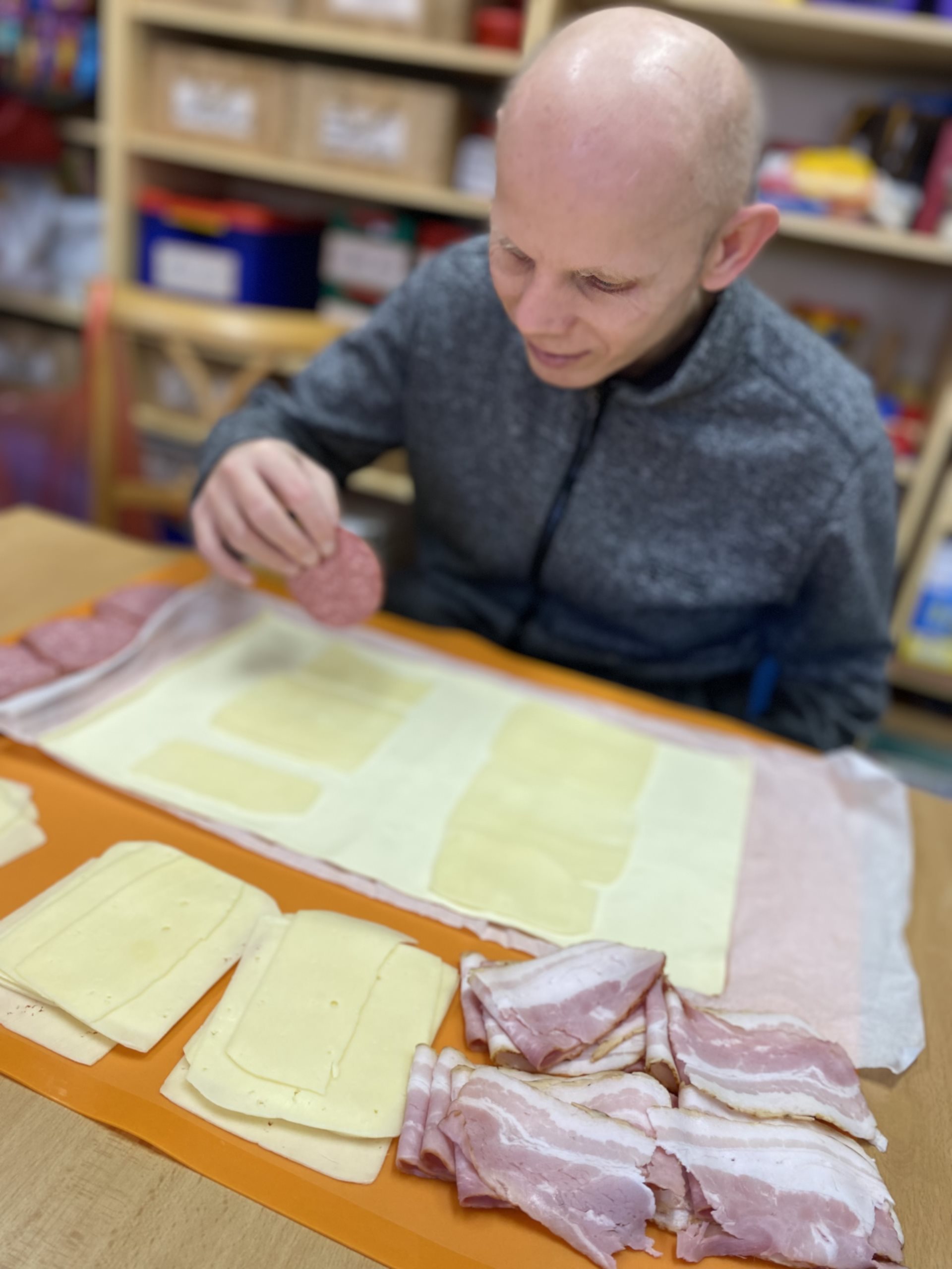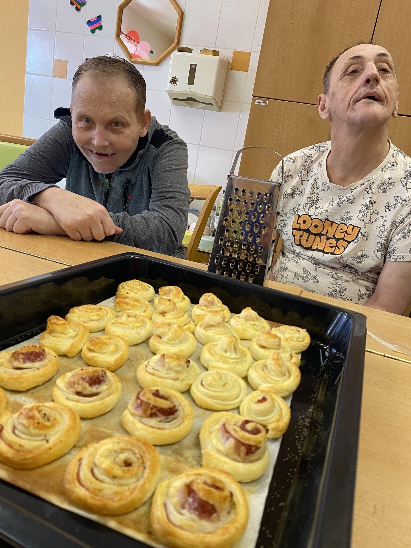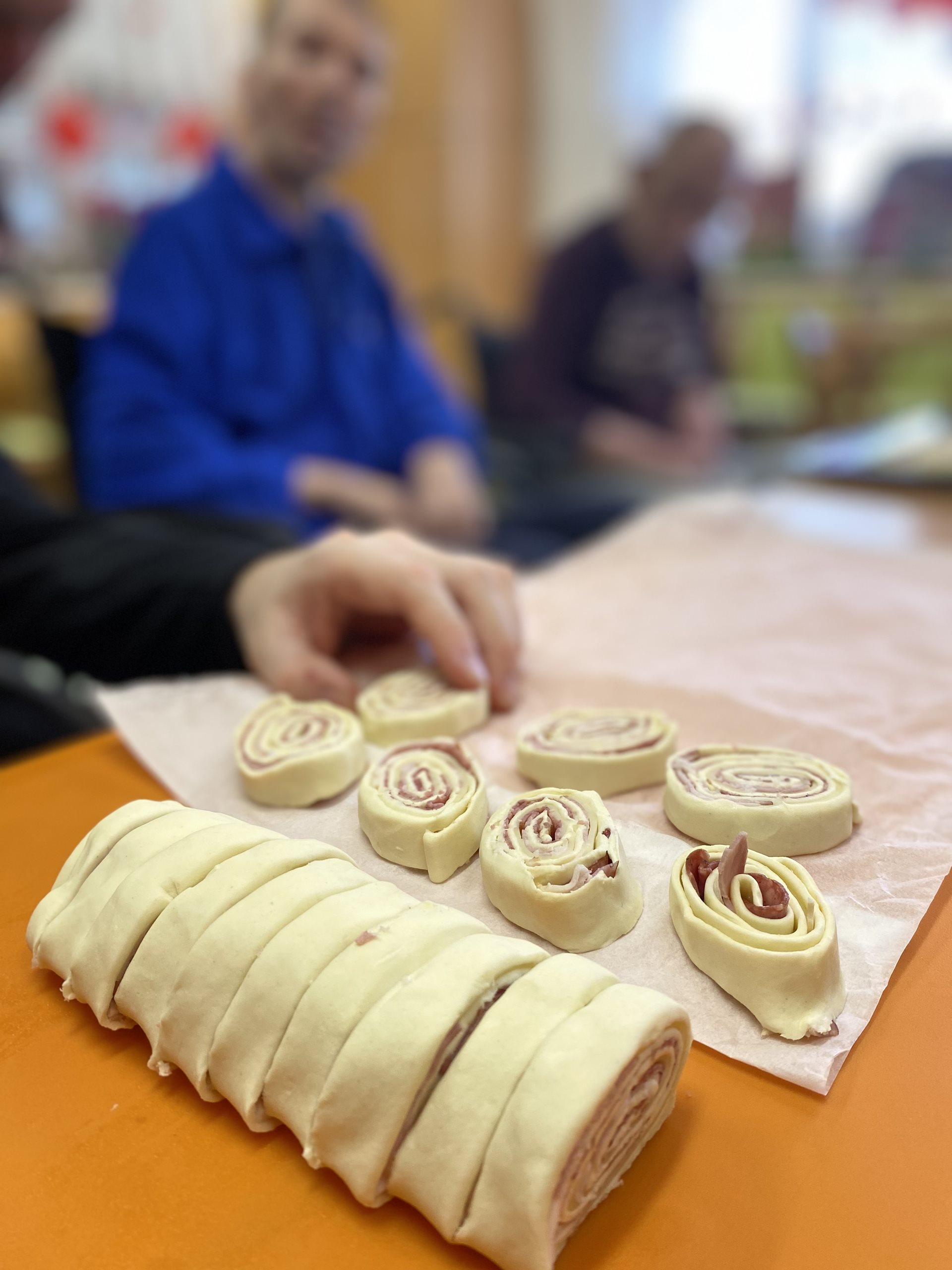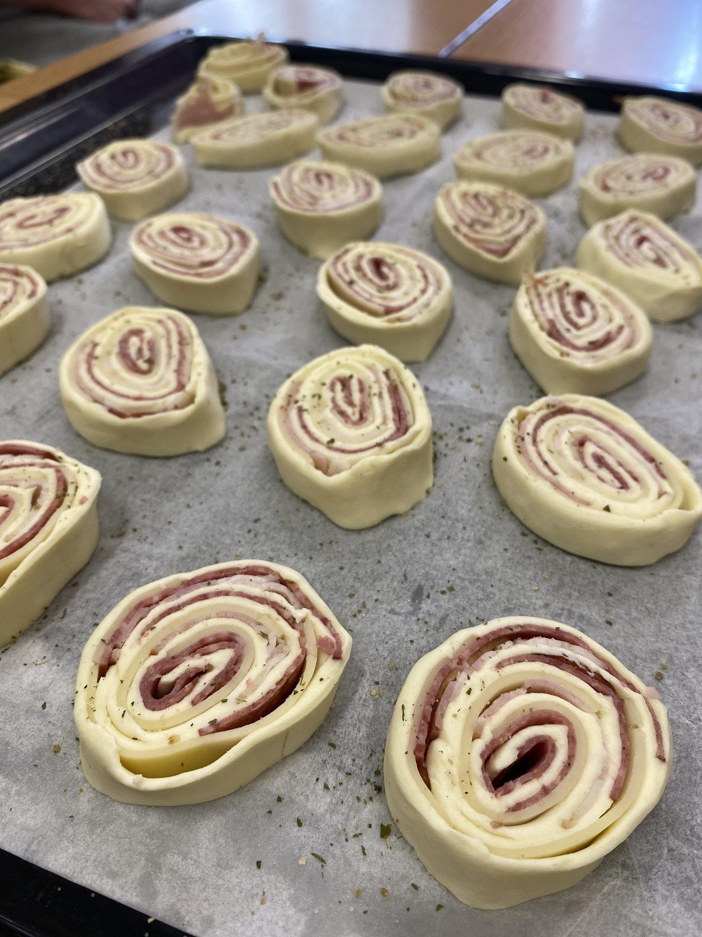 Koupili jsme si sýr, salám, slaninu a pustili se do práce. Roztáhli jsme si těsto, poskládali všechny ingredience, těsto pak zabalili a nakrájeli šneky. Sýr, salám a slanina lákaly svou vůní, tak jsme je také ochutnávali.