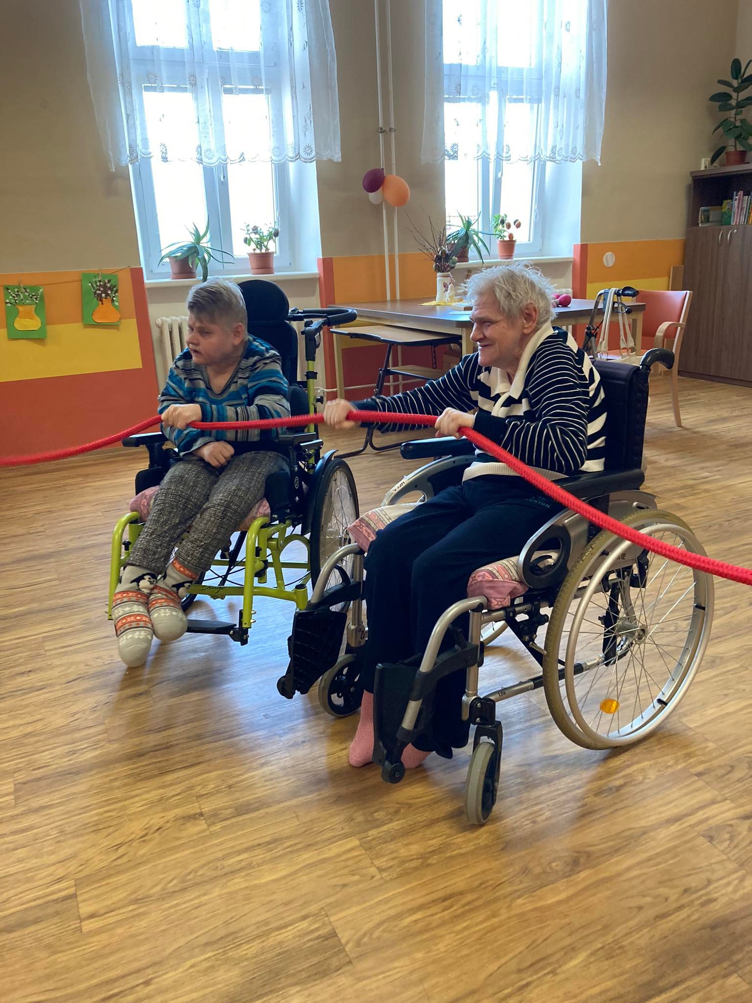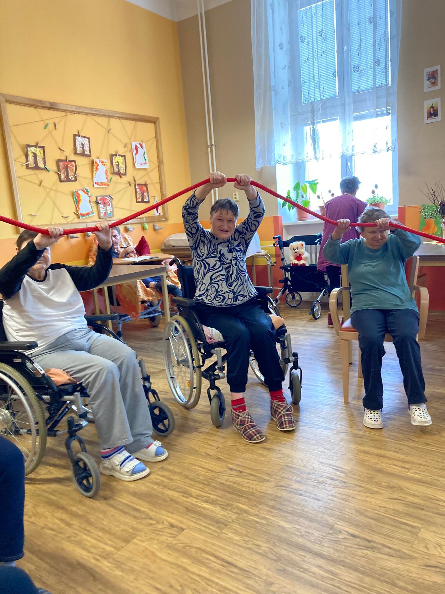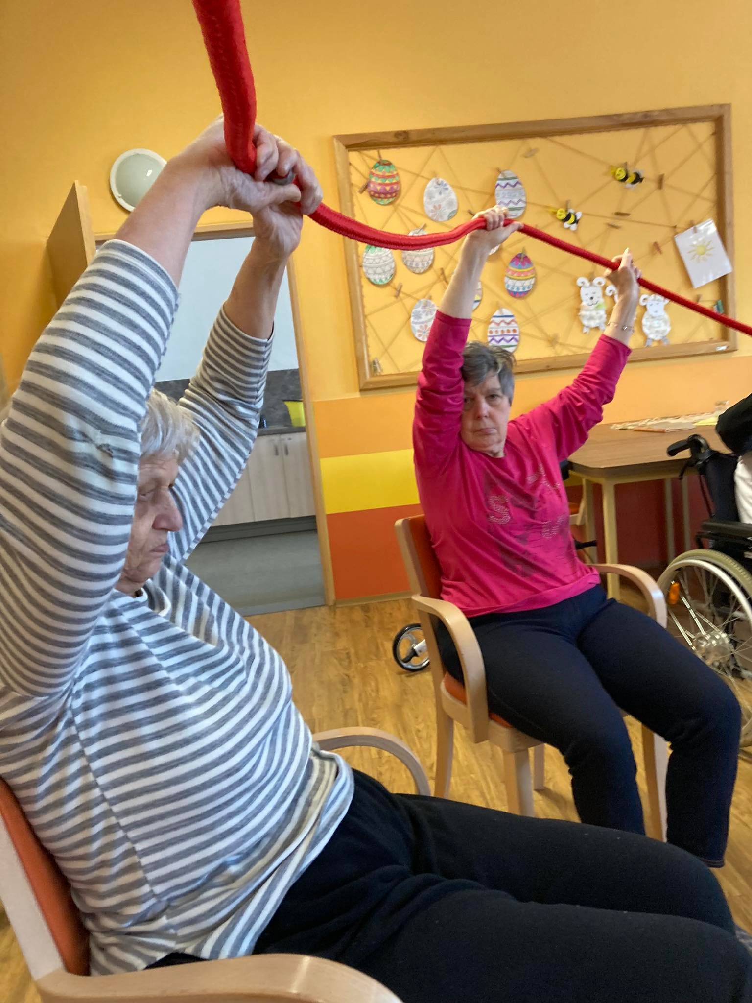 Tanec v sedě s využitím měkkého lana. Cílem tohoto cvičení je posílení vzájemné interakce klientů, koordinace oko - ruka a v neposlední řadě také zlepšení pohybových schopnosti klientů.
