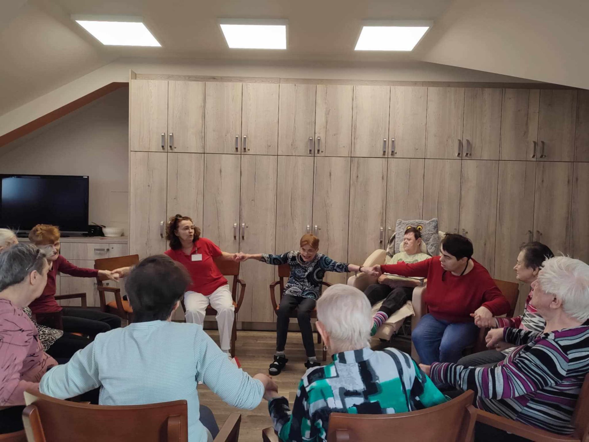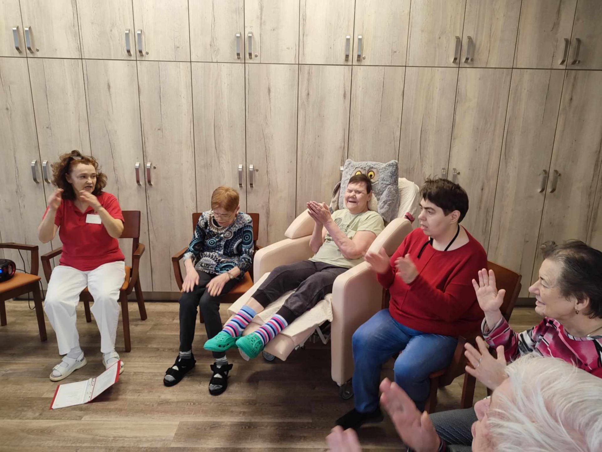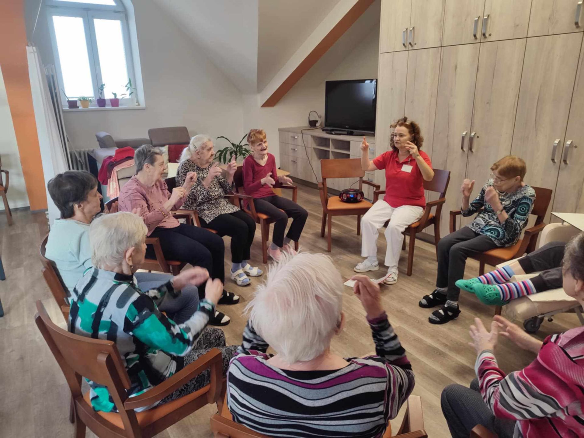 Dnes se klientky DOZP zapojily do taneční aktivity vsedě, která je součástí pravidelného skupinového cvičení zaměřeného na rozvoj motoriky, koordinace a celkové pohody. Dlouhodobé sledování ukazuje, že pravidelná účast přináší viditelné zlepšení – pohyb je plynulejší, koordinace jistější a radost z aktivity patrná.