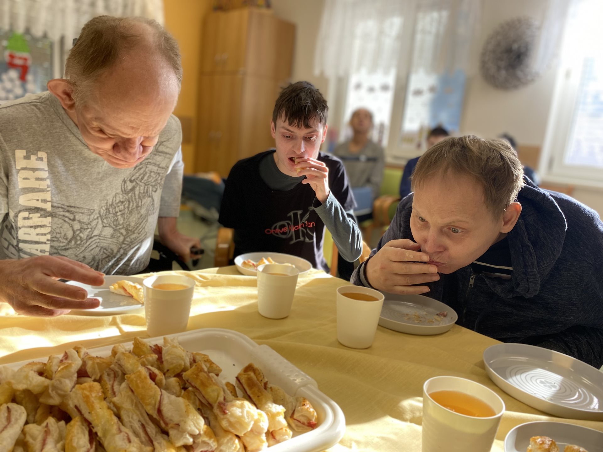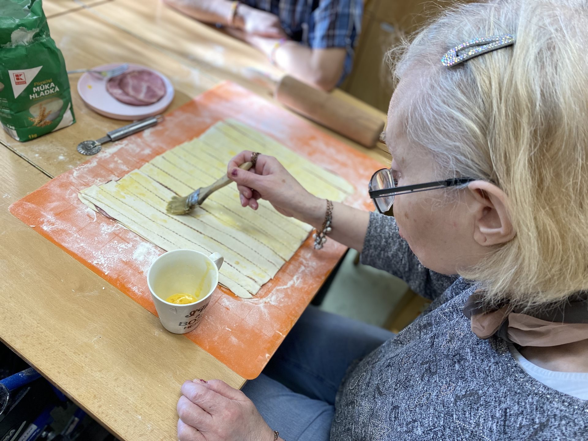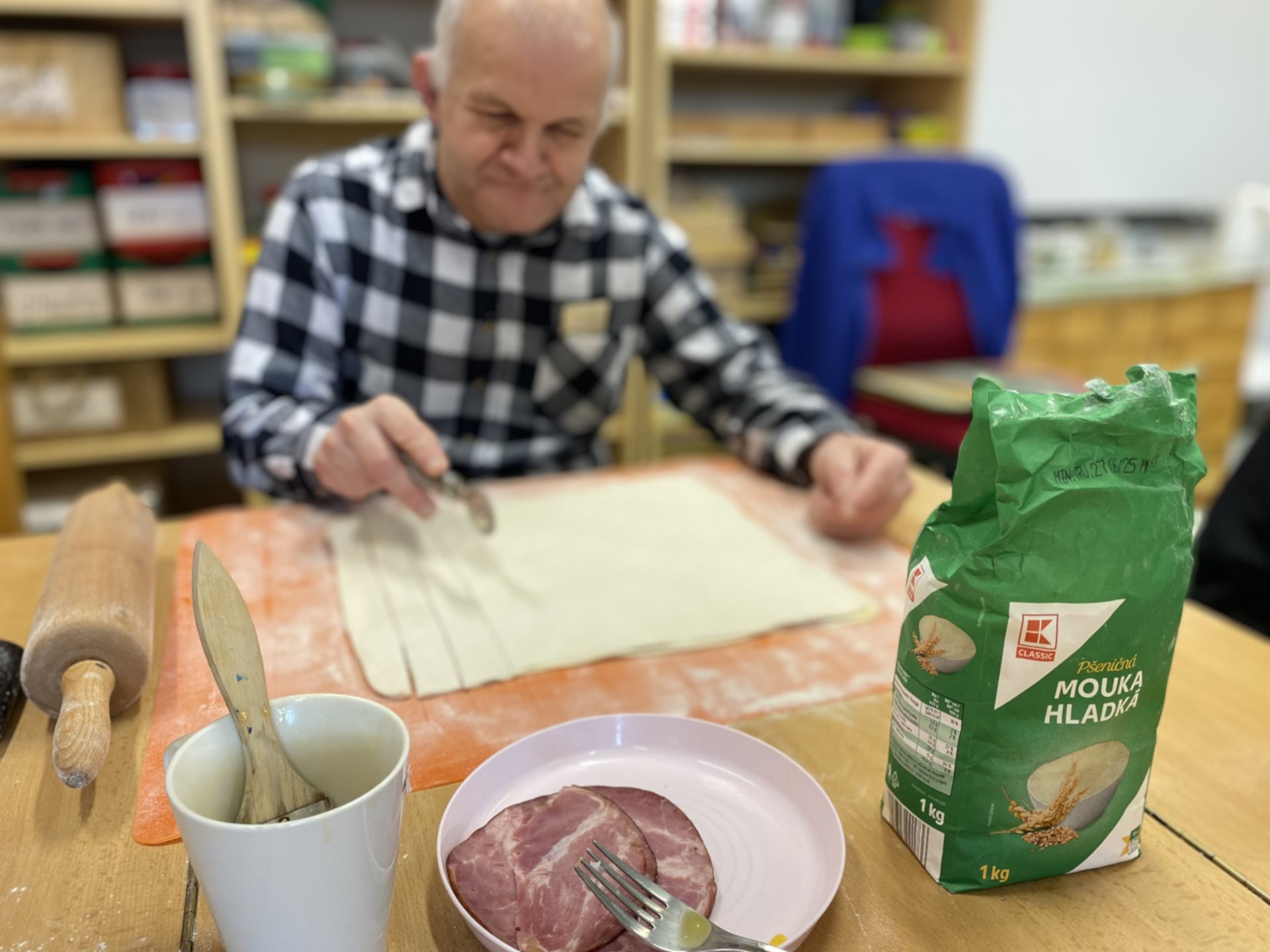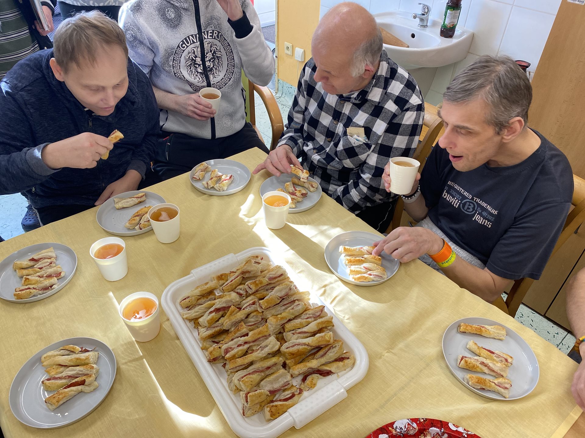 Koupili jsme si těsta, rozváleli je na tenké plátky, poskládali jsme na něj kolečka anglické slaniny, na to položili další plát, natřeli vajíčkem, rozkrájeli na proužky a při pokládání na plech jsme proužky zakroutili. Z trouby se linula nádherná vůně a my se velmi těšili na to, až si na nich pochutnáme. Všechny tyčinky se nám krásně povedly, zůstaly hezky nafouknuté a křupavé. Byly moc dobré a my se těšíme na další podobné pečení a pochutnání.