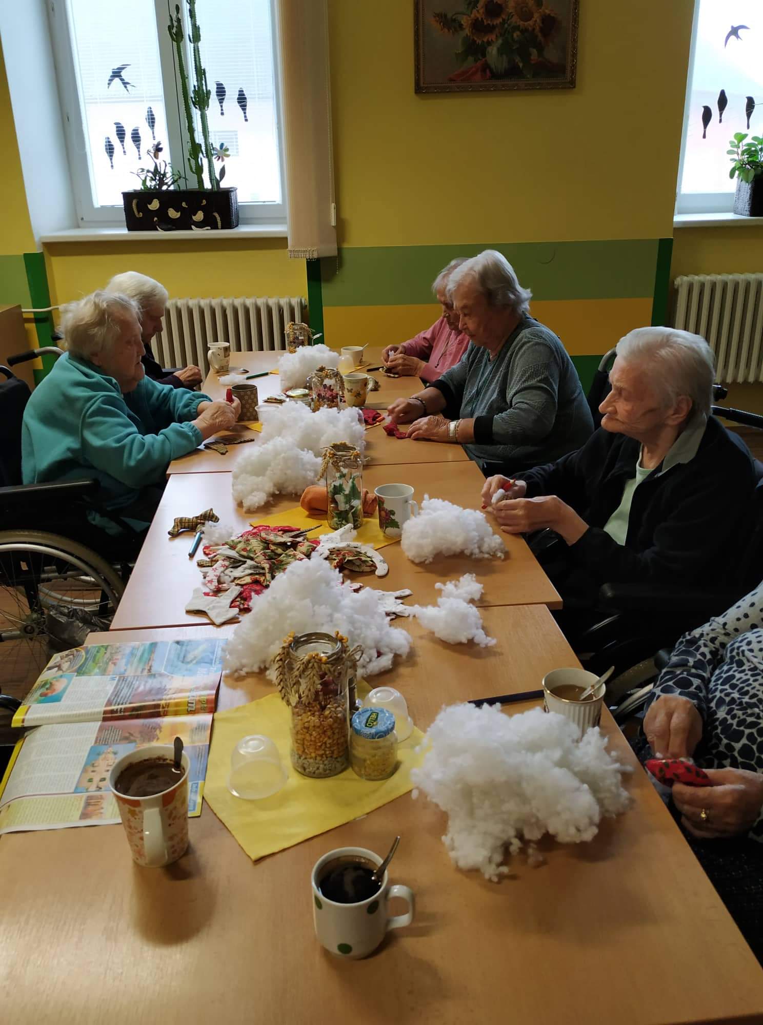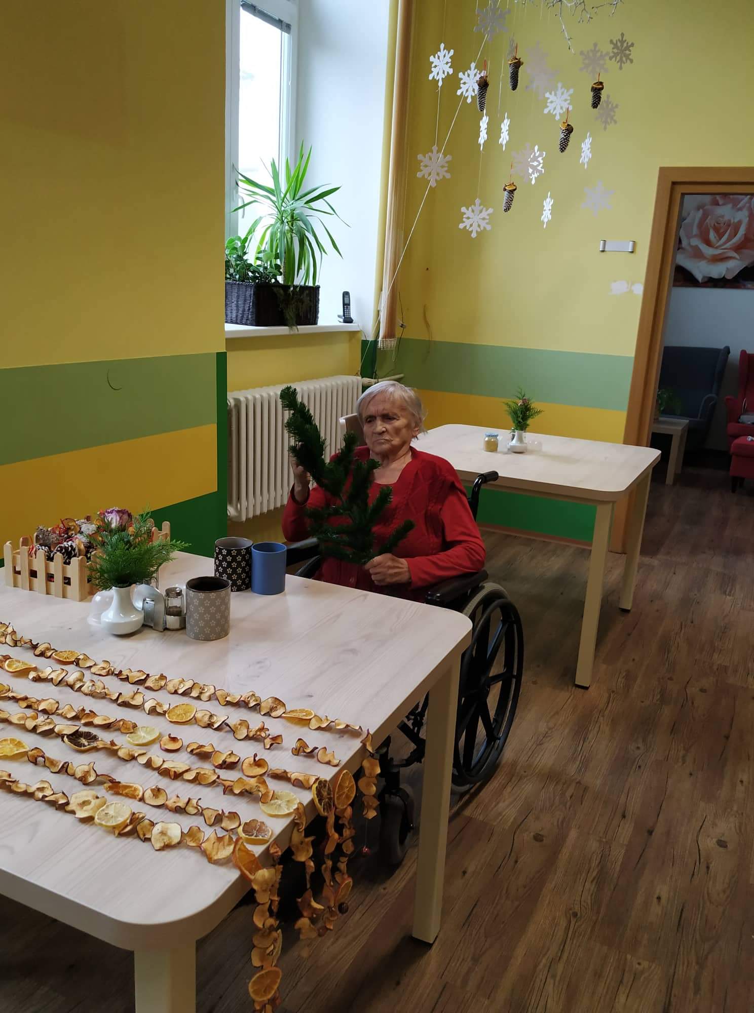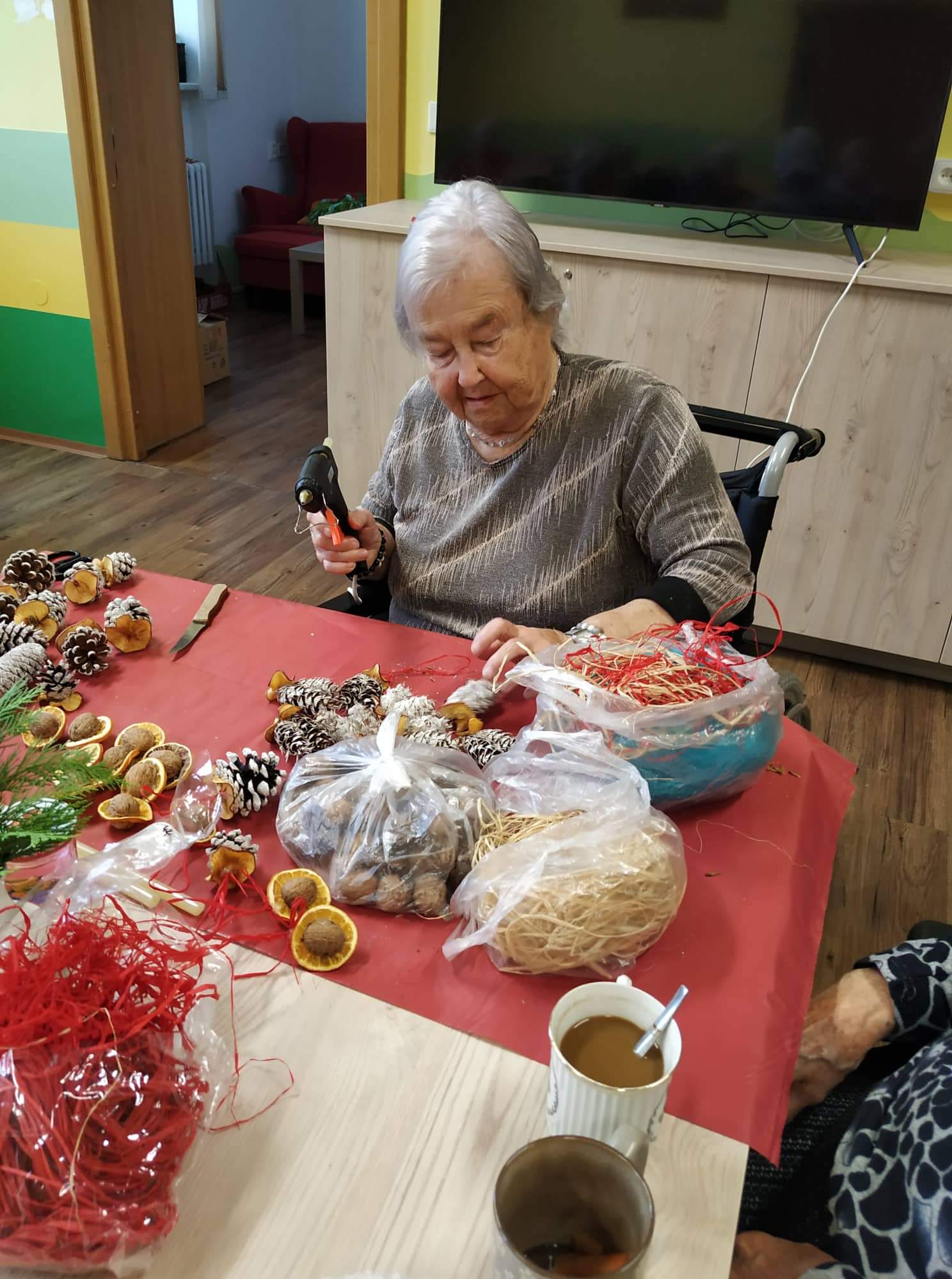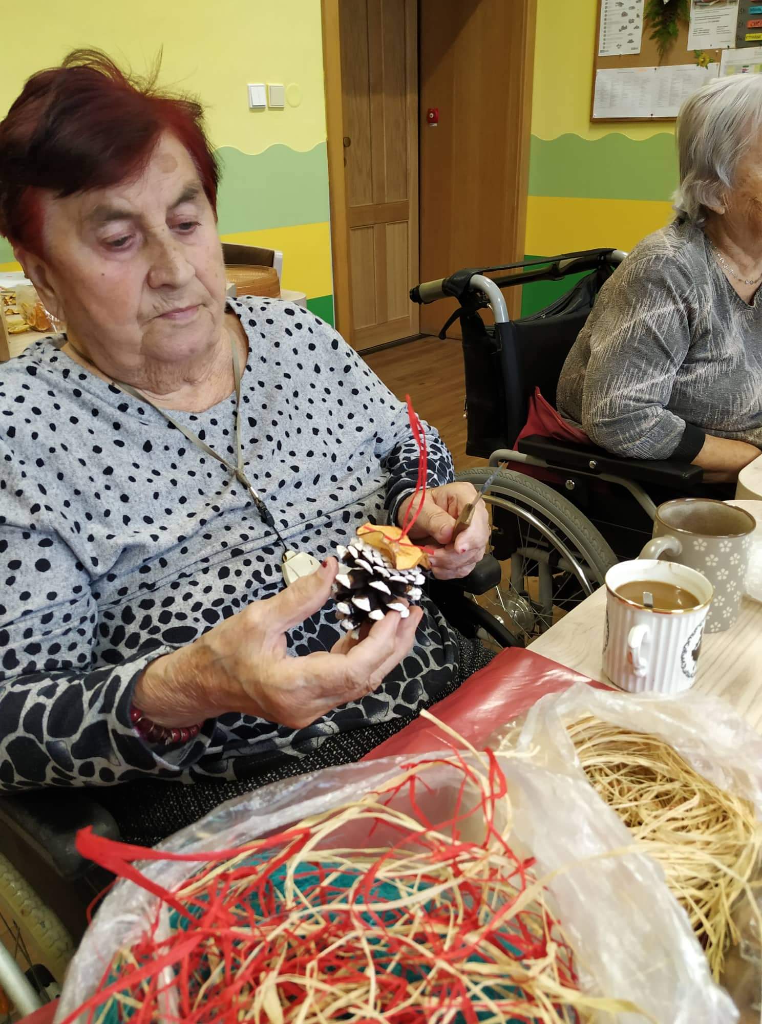 S blížícím se Adventem se naši senioři pustili do tvorby vánočních dekorací na stoly a ozdob na vánoční stromeček z přírodních materiálů. K tvoření využili šišky, ořechy a sušené ovoce. S pomocí pracovníků si také už nyní stromek složili a nazdobili.