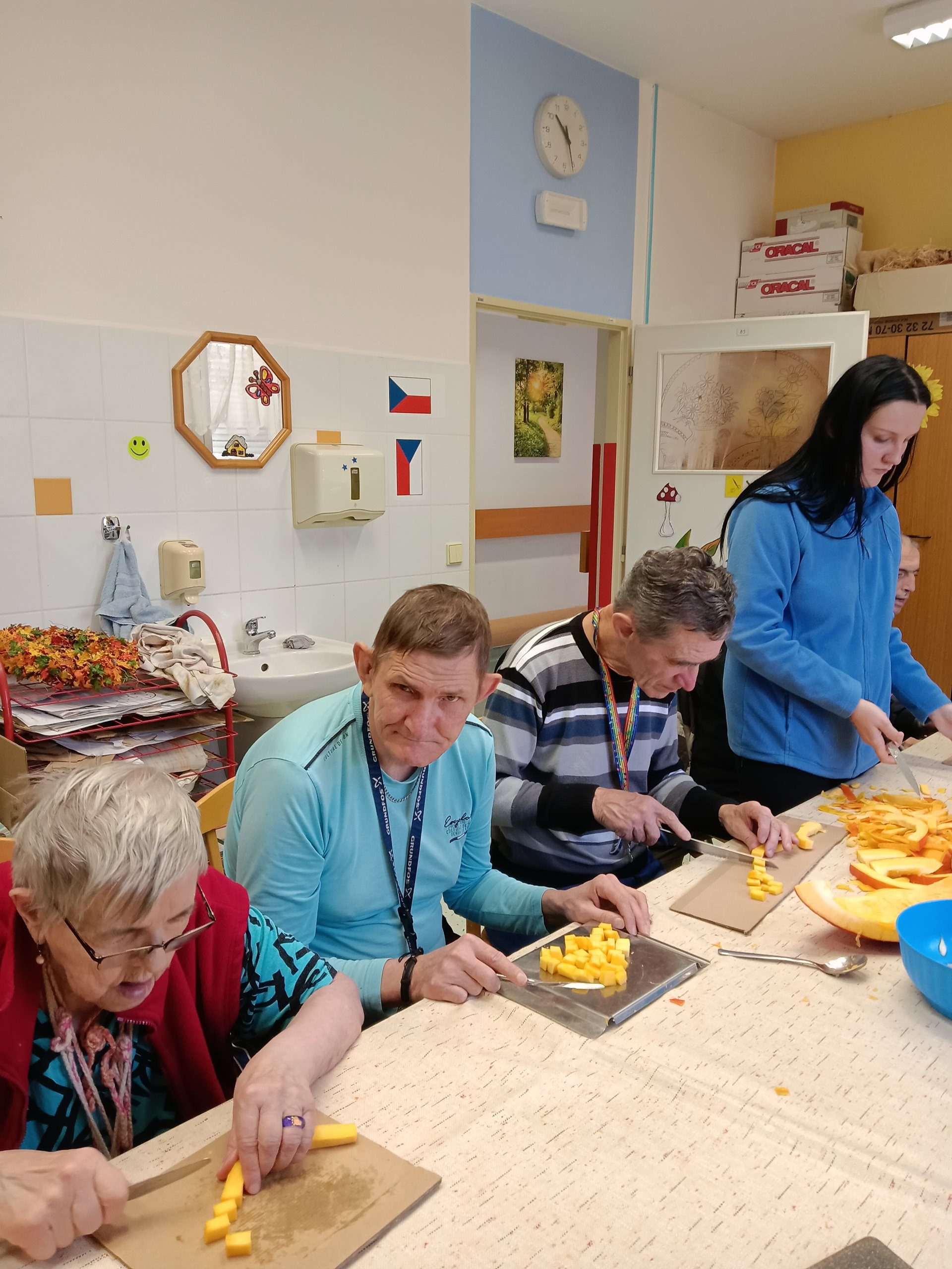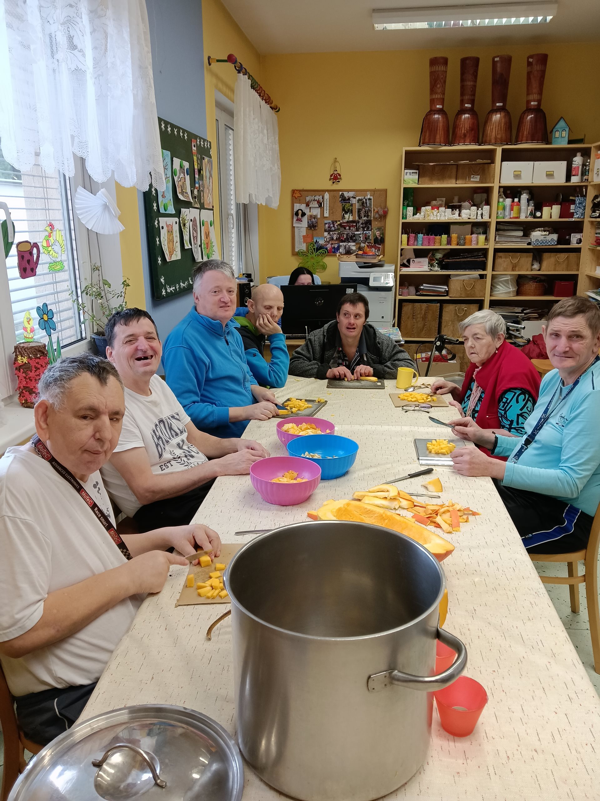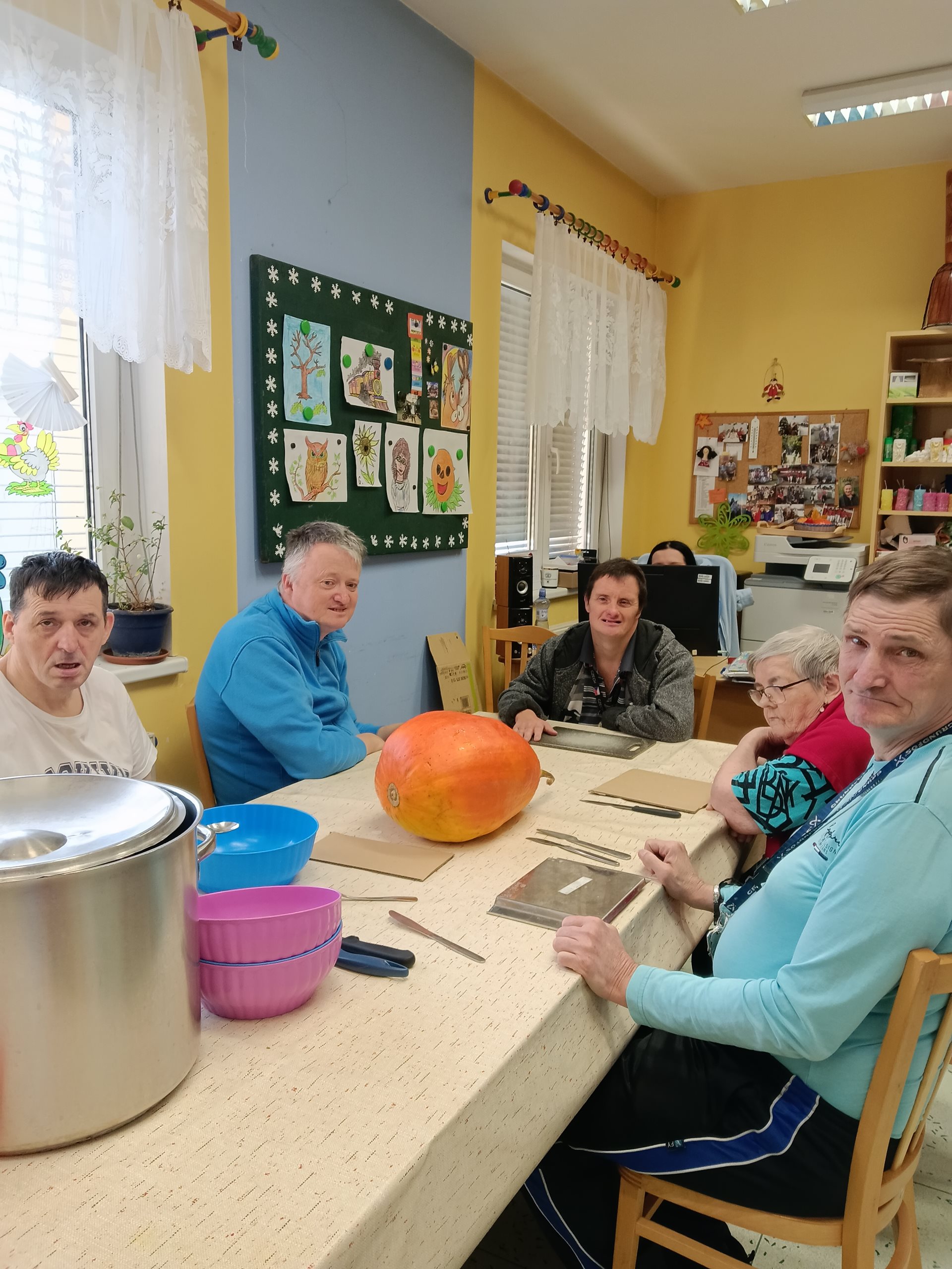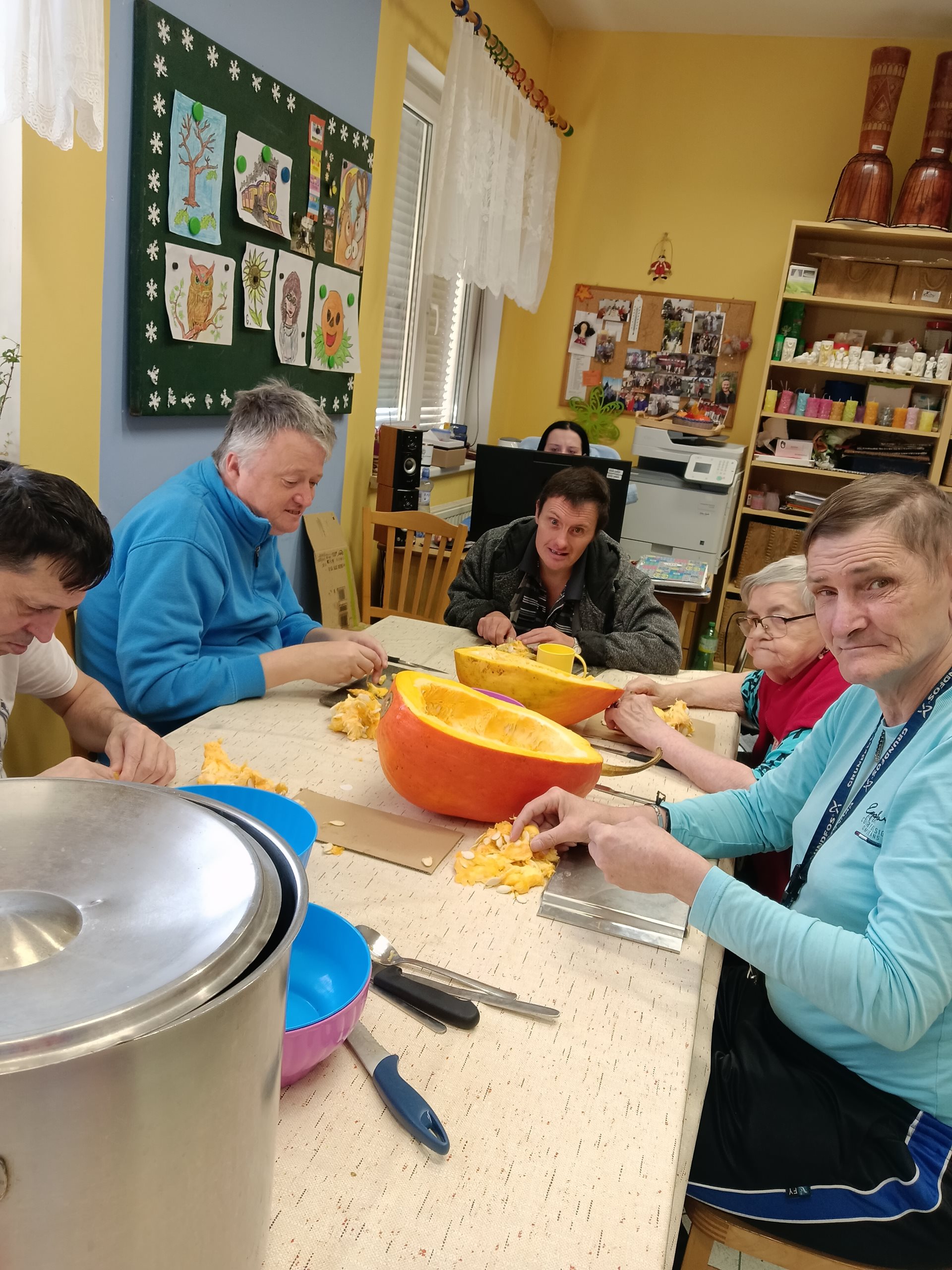 Nejdříve jsme dýni vydlabali, pokrájeli na kousky a v hrnci namočili do octové vody. Druhý den jsme octovou vodu slili a dýni vařili s cukrem, citronem a skořicí. Po uvaření jsme kompot nechali vychládnout a následně jsme si na něm všichni zúčastnění pochutnali. Opravdu se nám povedl.