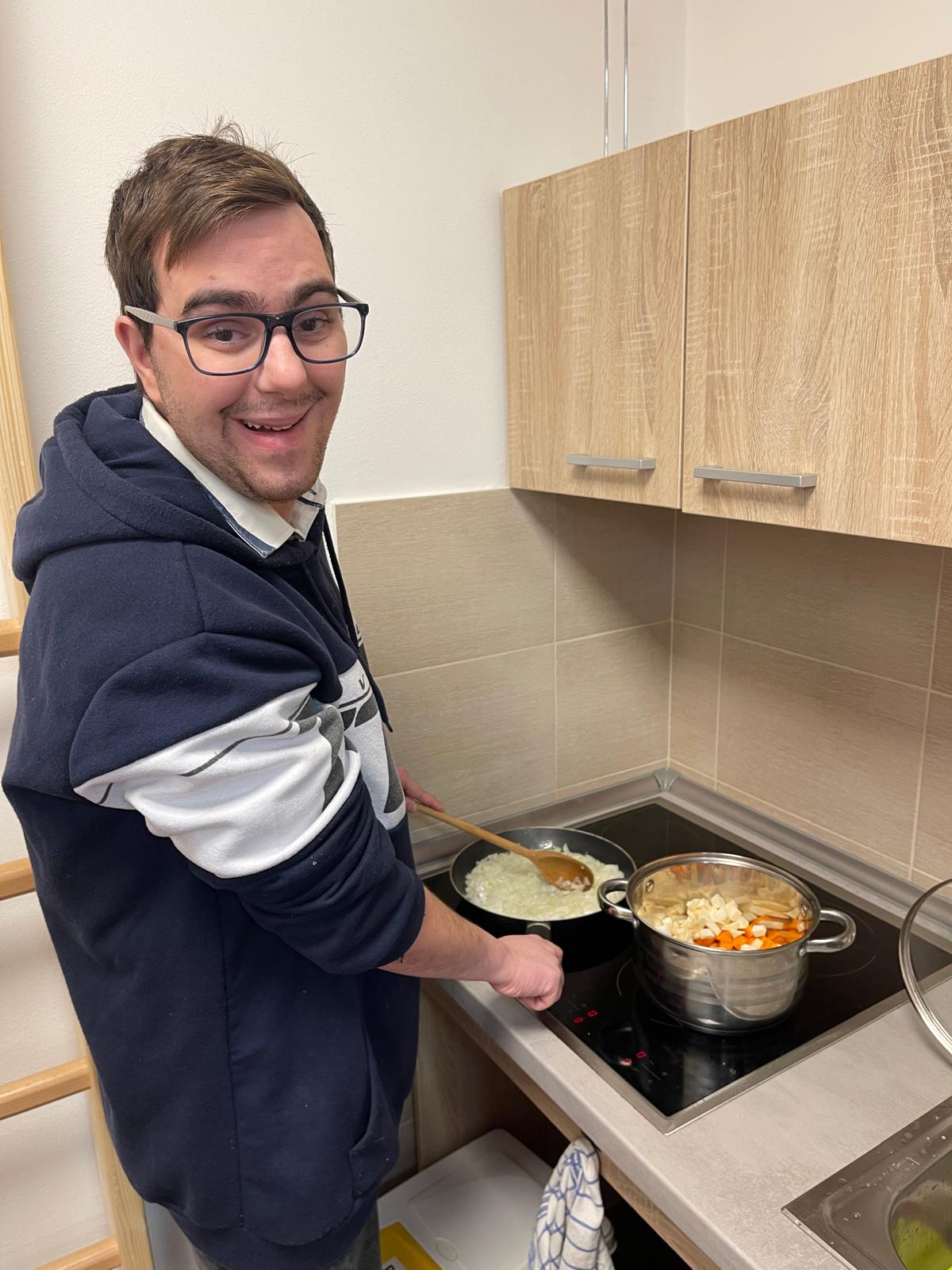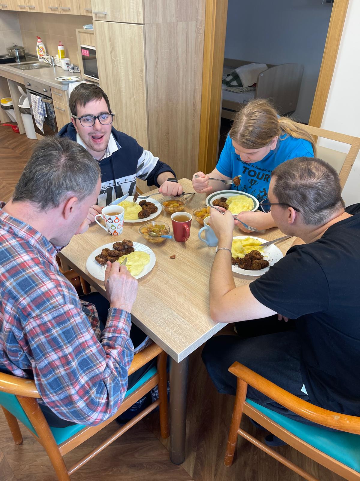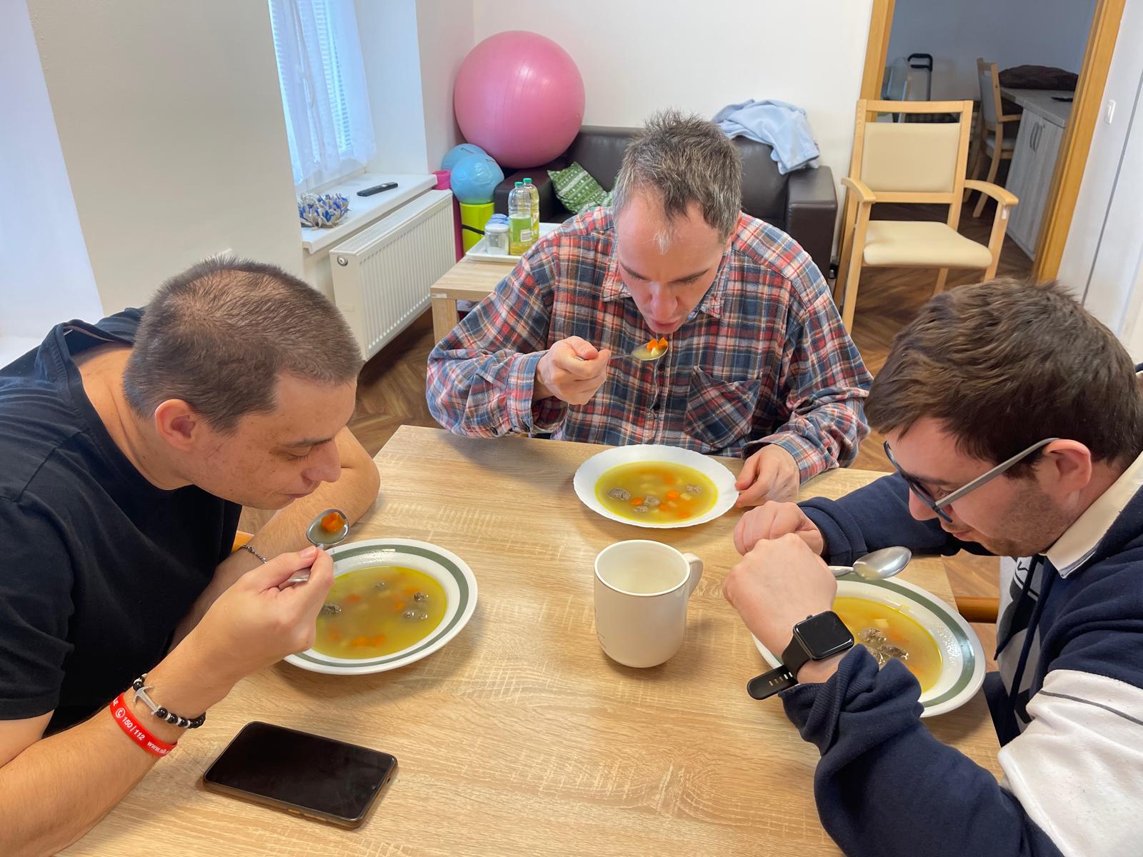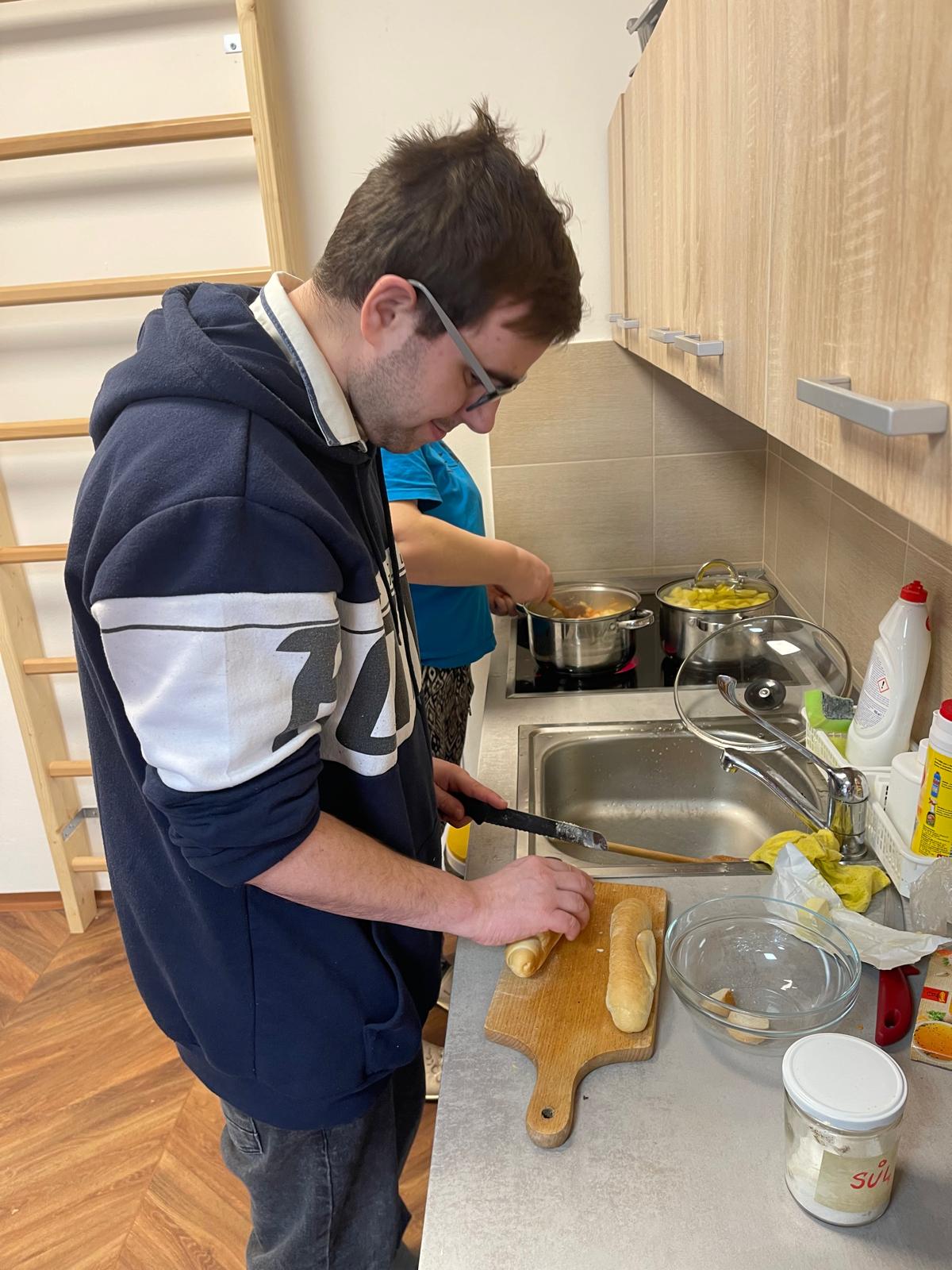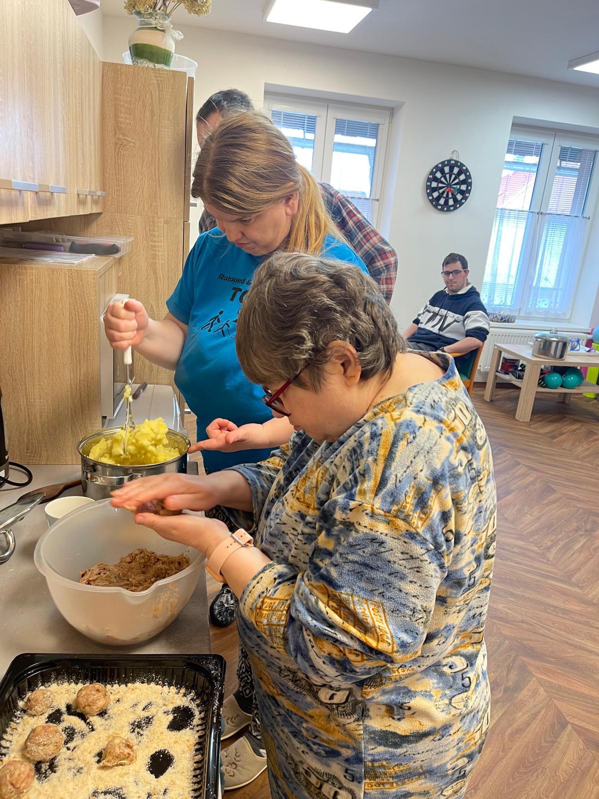 V rámci podpory samostatnosti klientů si obyvatelé startovacích bytů za dopomoci pracovníka připravili oběd. Práce šla všem dobře od ruky a za chvíli se domem linula vůně lahodné polévky s játrovými knedlíčky a karbanátků s bramborovou kaší.