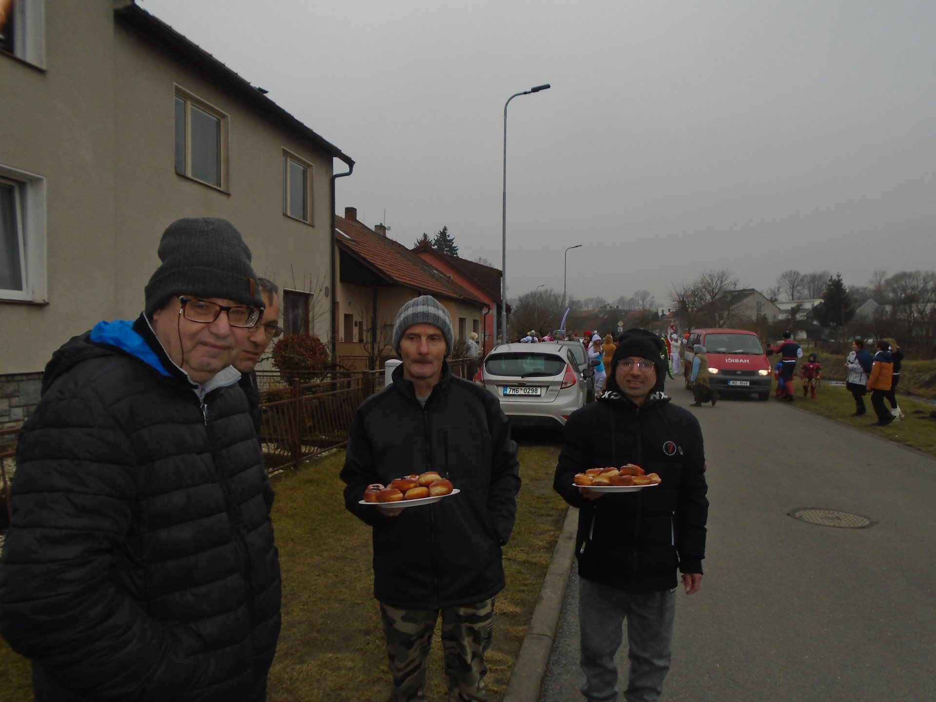 V sobotu 14. 2. 2026 chodil v ulicích Dřevohostic medvěd v doprovodu asi 60 masek. Ráno jsme nasmažili koblihy a vyčkávali, kdy uvidíme prlvod procházet také kolem našeho domlu. Před oběděm jsme se dočkali... Nabídli jsme kolemjdoucím občerstvení, někteří jsme přispěli finanční částkou, někteří sladkostí. Byla to pěkná podívaná a milé setkání.