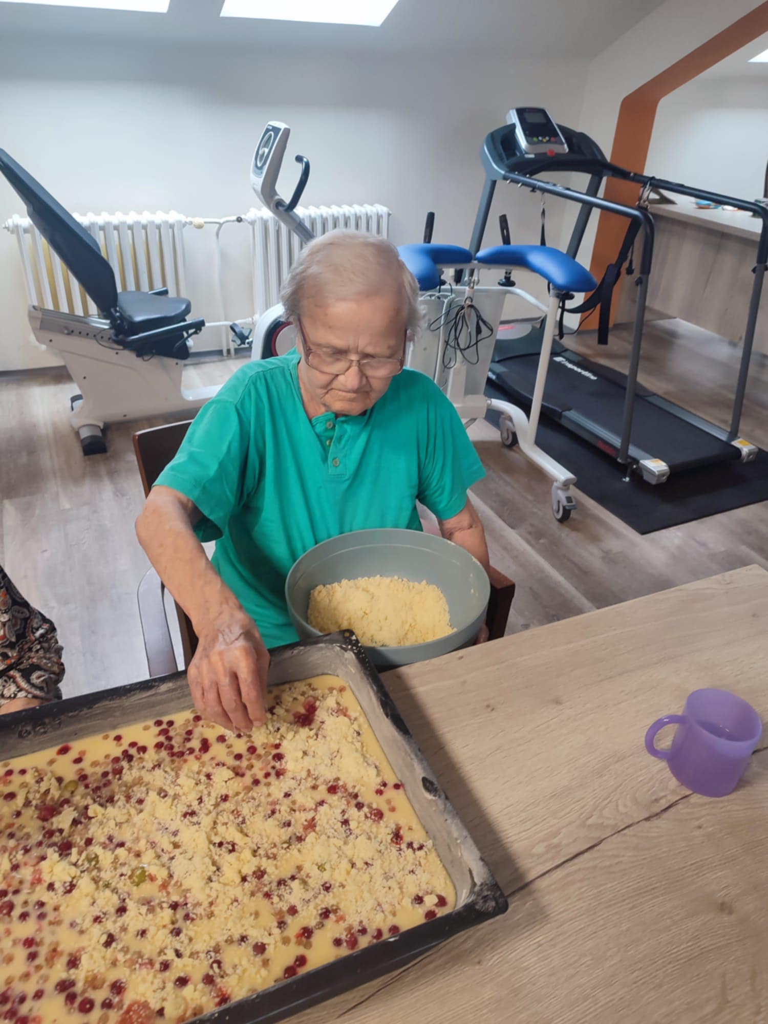 Následovala příprava těsta, které se společně nalilo na plech. Na něj pak klientky pečlivě rozmístily čerstvý rybíz. Některé z nich si navlékly ochranné rukavice, aby práce byla co nejhygieničtější. Poté se koláč posypal voňavou máslovou drobenkou, která mu dodala křupavou sladkou tečku. Celý proces byl doprovázen veselým povídáním a vzpomínkami na dětství, kdy podobné koláče připravovaly doma s rodinou.