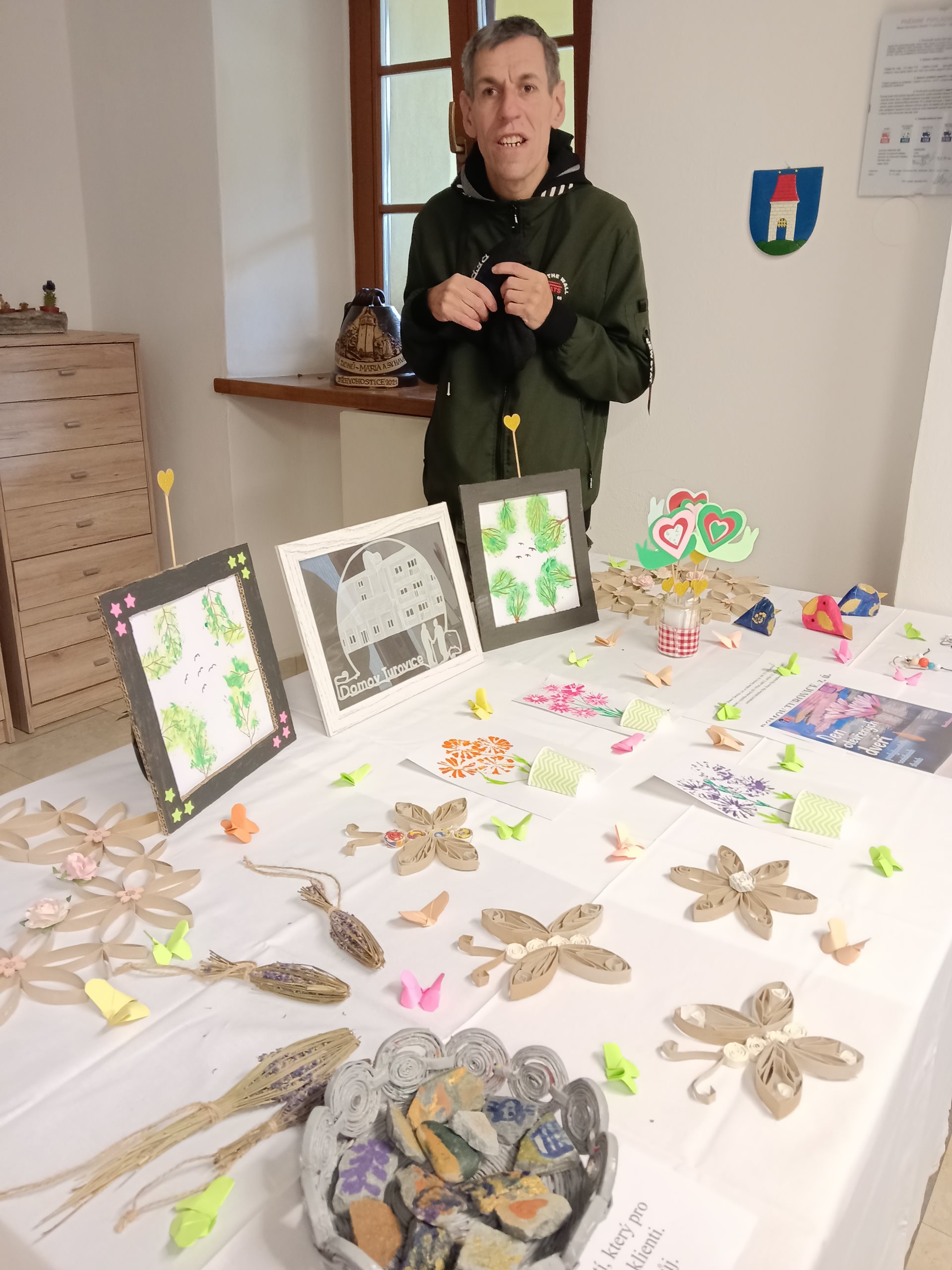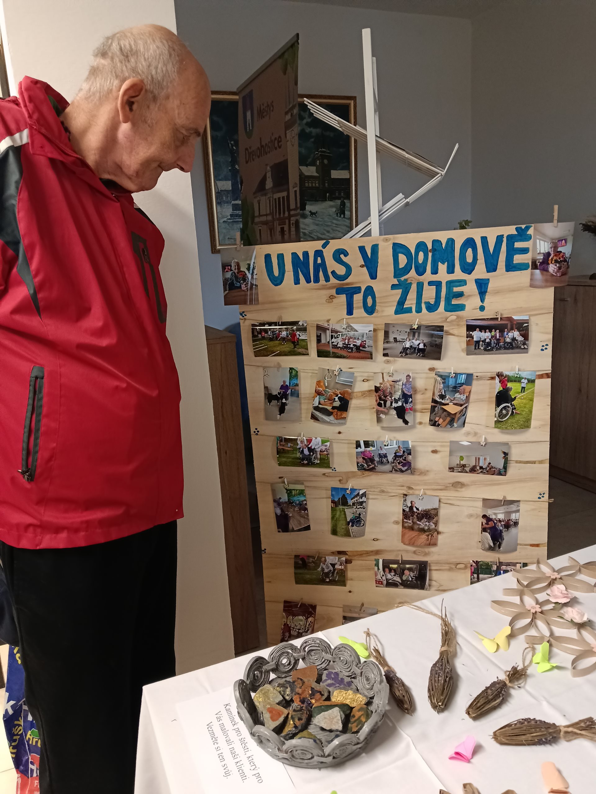 Na našem obecním úřadě probíhá výstava výrobků klientů z domova pro seniory Turovice. My to máme z našeho domova na náměstí, kde úřad sídlí, jen kousek, tak jsme tuto výstavu využili jako cíl naší vycházky. Velmi rádi se chodíme na různé výstavy inspirovat a také nás zajímá, jak šikovné ruce senioři mají. Viděli jsme výrobky z papíru, z dřevěných perliček, keramiku a také malované obrázky. Některé inspirace jsme si odnesli s sebou a určitě se pokusíme jejich tvorbu vyzkoušet.