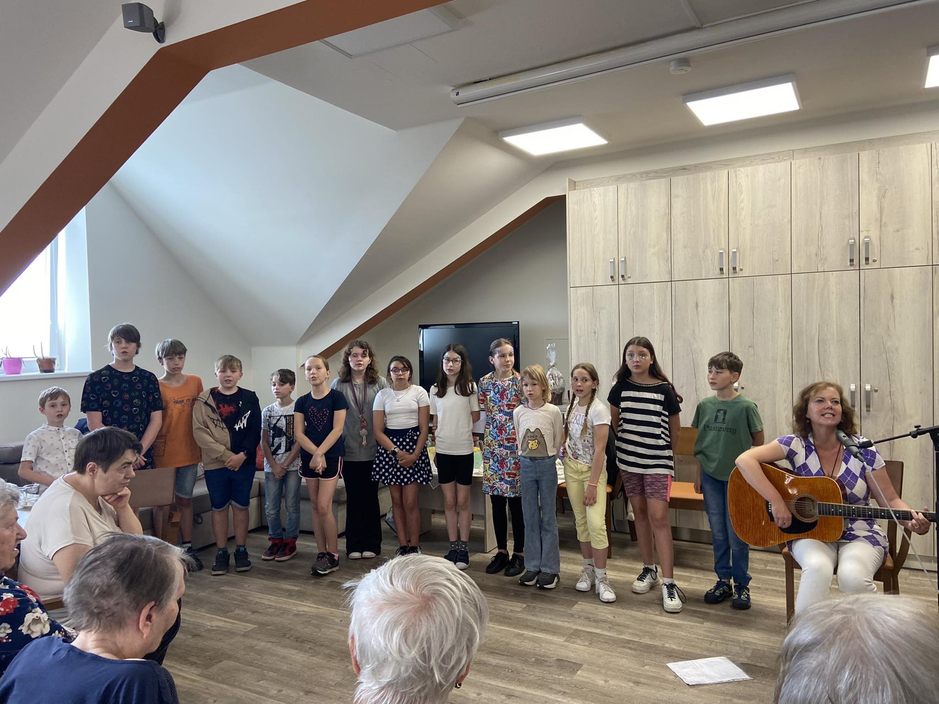 Tentokrát nás svým zpěvem přišly potěšit děti ze ZŠ J. A. Komenského v Přerově. Připravily si repertoár ze svých oblíbených písniček a jejich vystoupení mělo velký úspěch. A protože i po tomto výkonu měly děti plno energie, vzali jsme je na zahradu, kde se mohly proběhnout, prohlédnout si naše naučné tabule a projít se po smyslovém chodníku.