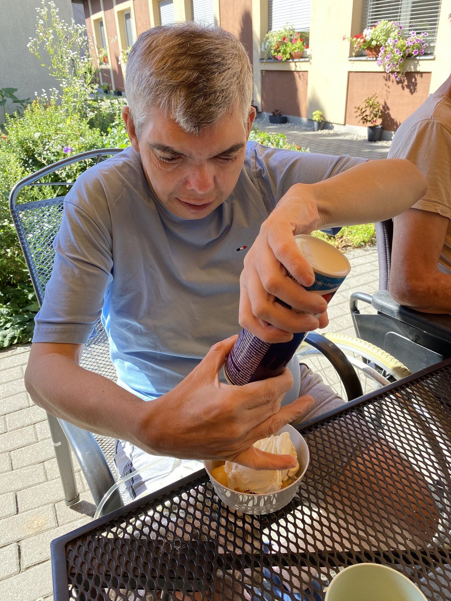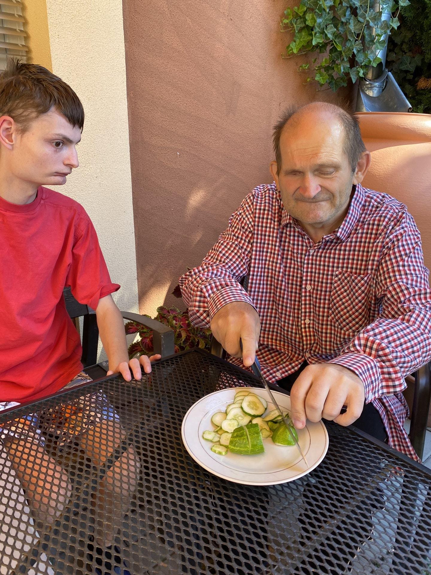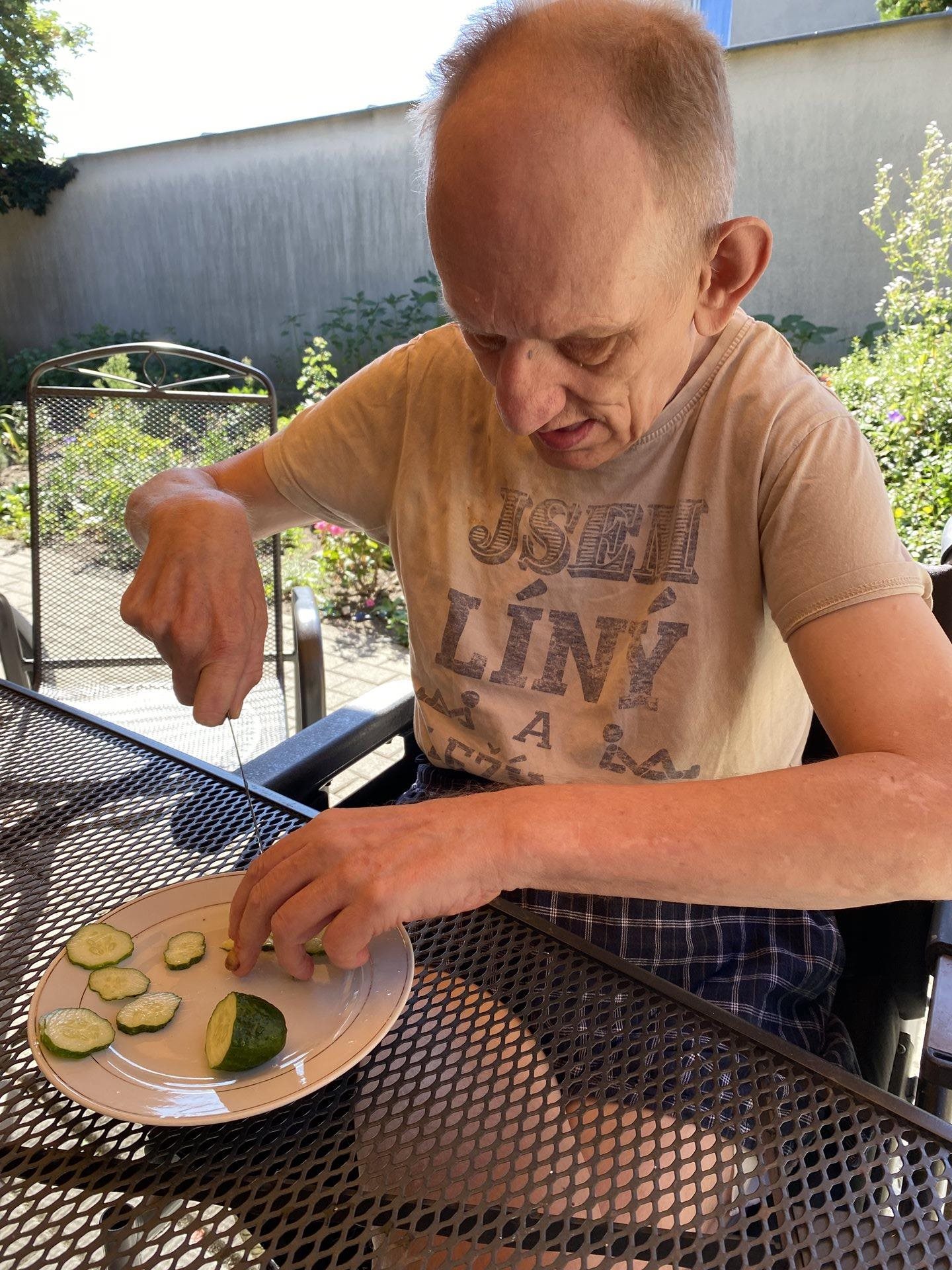 Horké počasí vybízí k chladným nápojům, studenému ovoci nebo lahodným zmrzlinám. My jsme si dnes tyto laskominy dopřáli a pochutnali si na nich. Udělali jsme si domácí okurkovou limonádu s citronem a mátou z naší zahrádky. Připravili jsme si zmrzlinové poháry s drobně nakrájeným ovocem a šlehačkou.